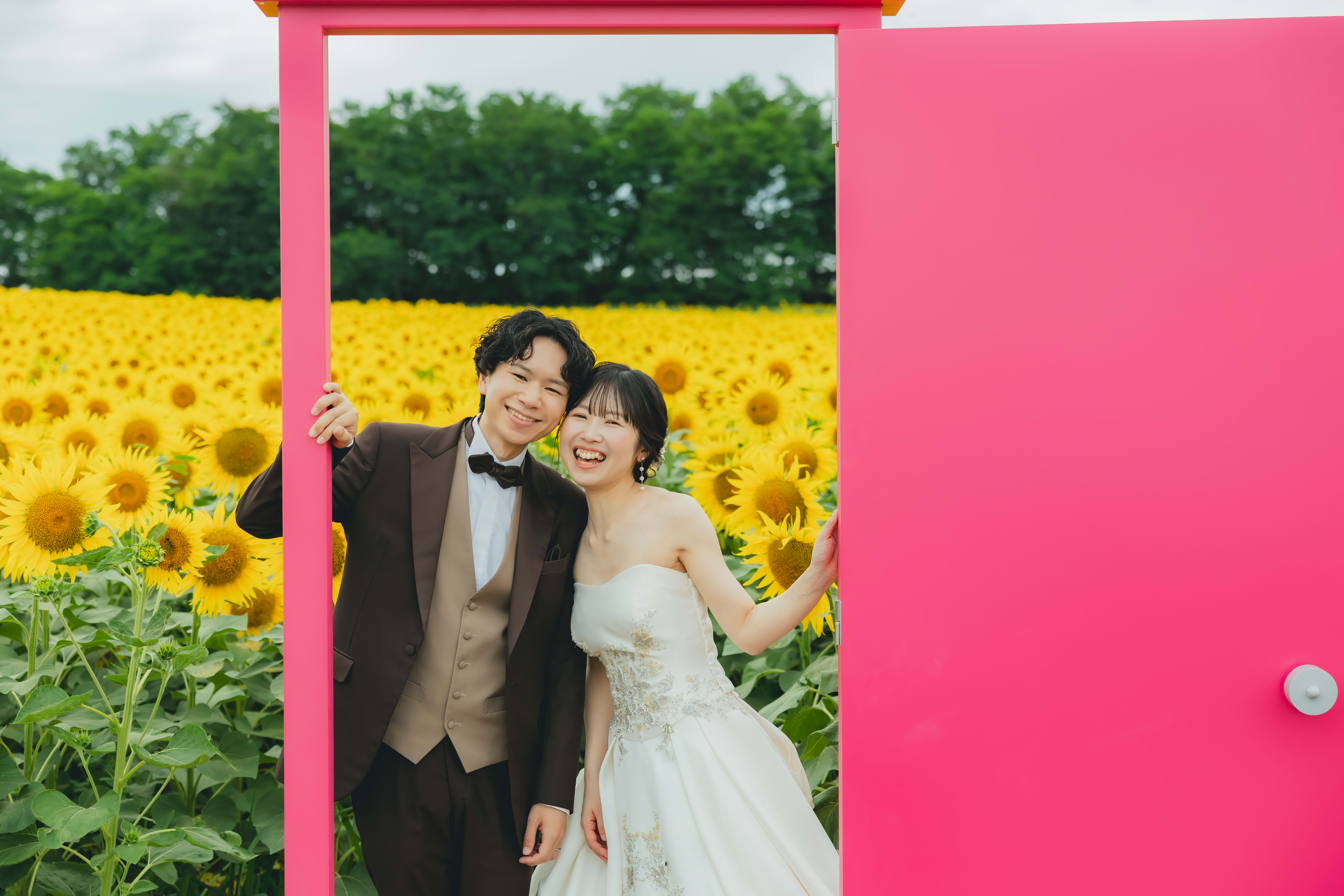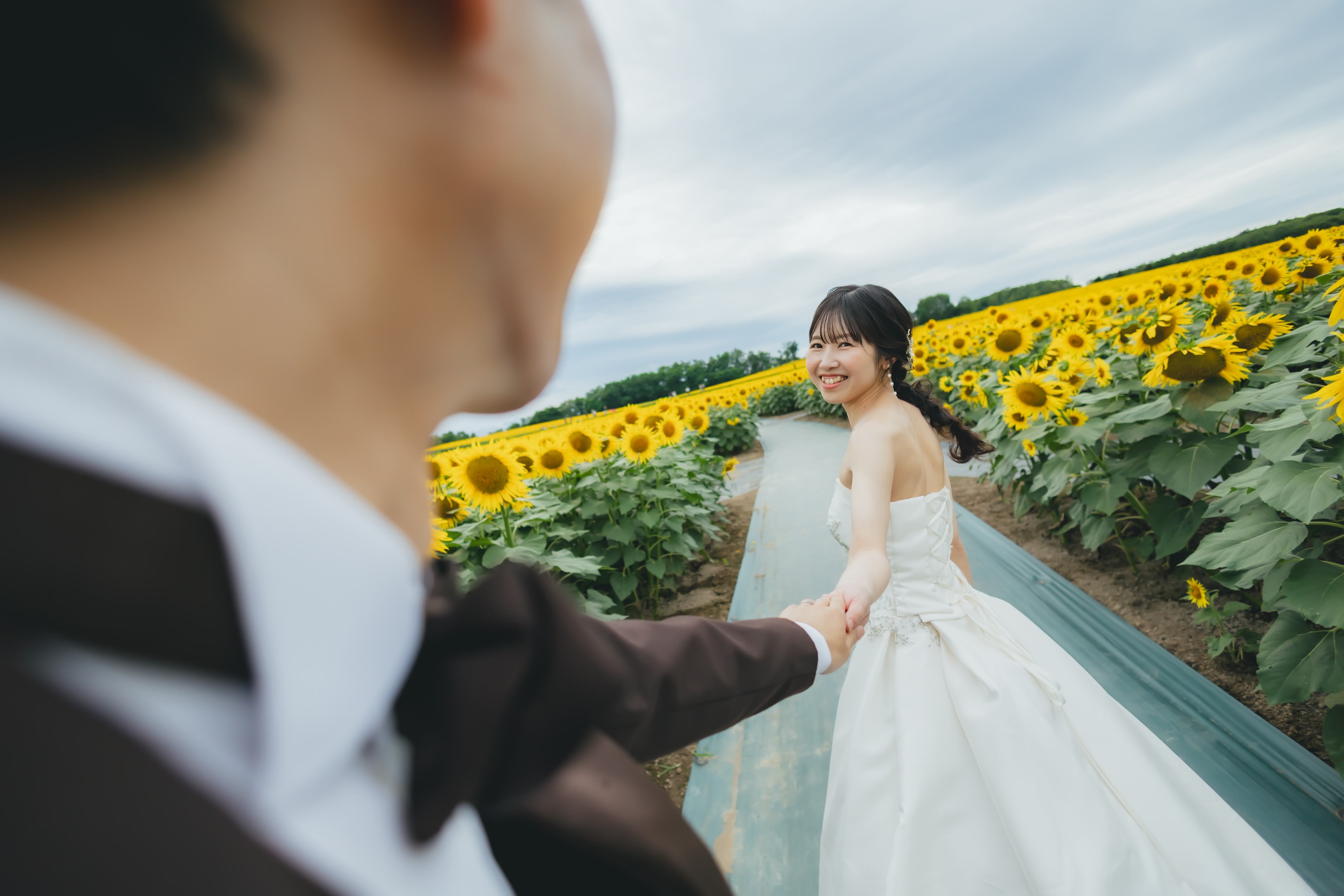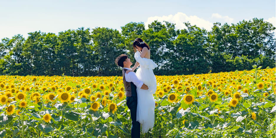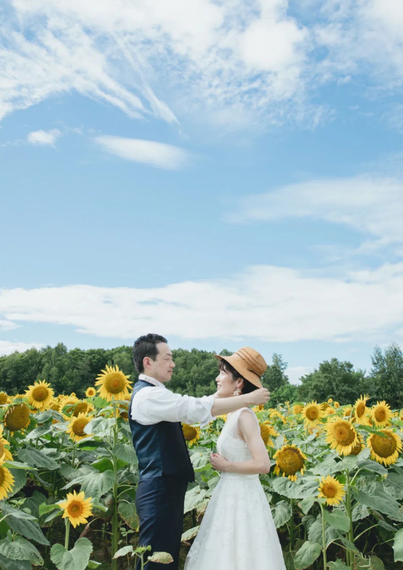 真夏の太陽を浴びて華麗に咲き誇る、約200万本にも及ぶひまわりたちと一緒に撮影できるプランです。