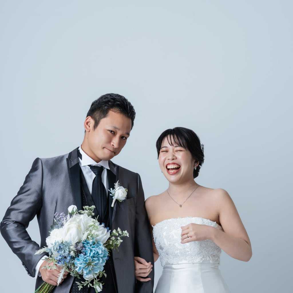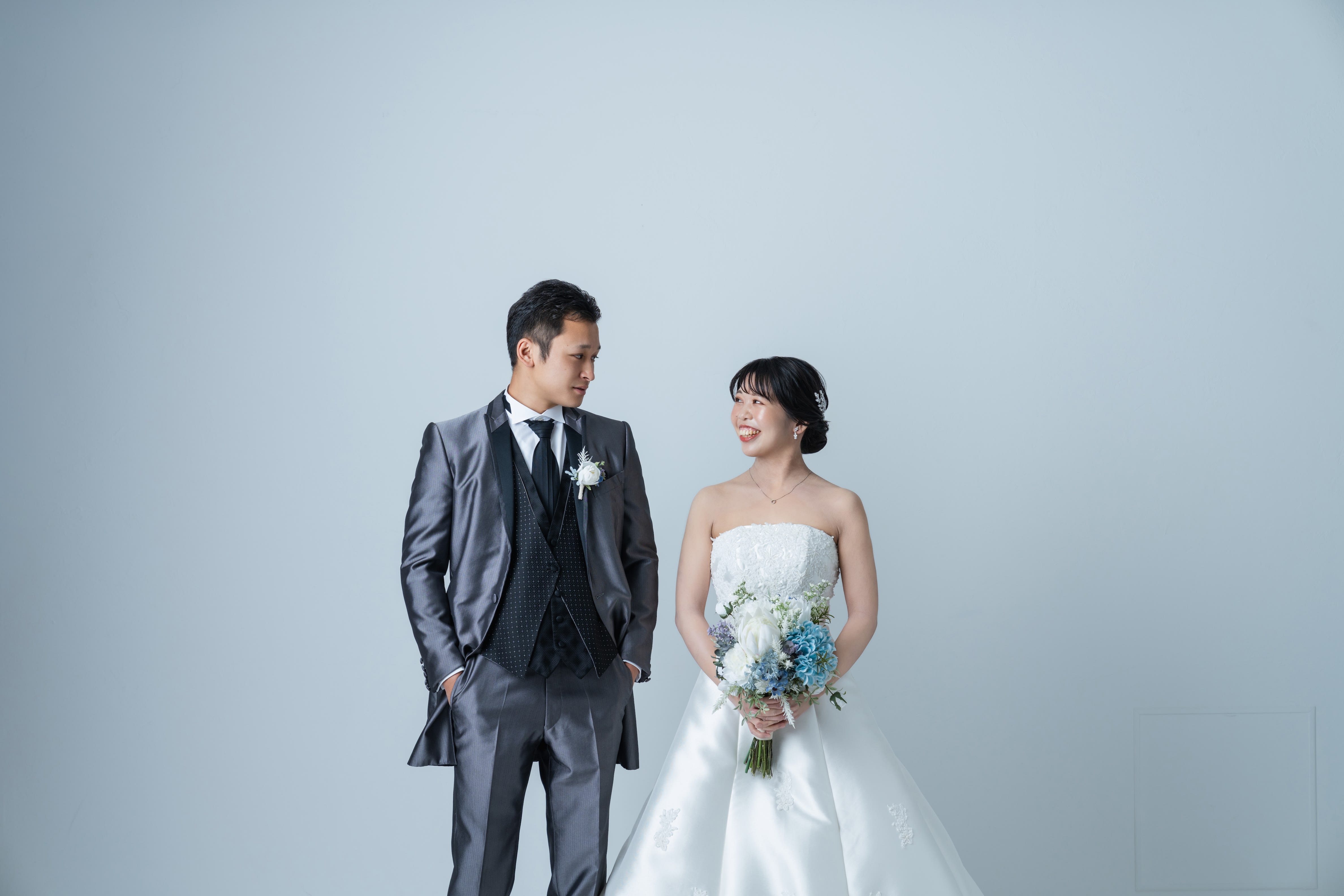 和装と洋装のスタジオplusプランでの撮影のお二人!シンプルですがその分自由度高く撮影ができます!