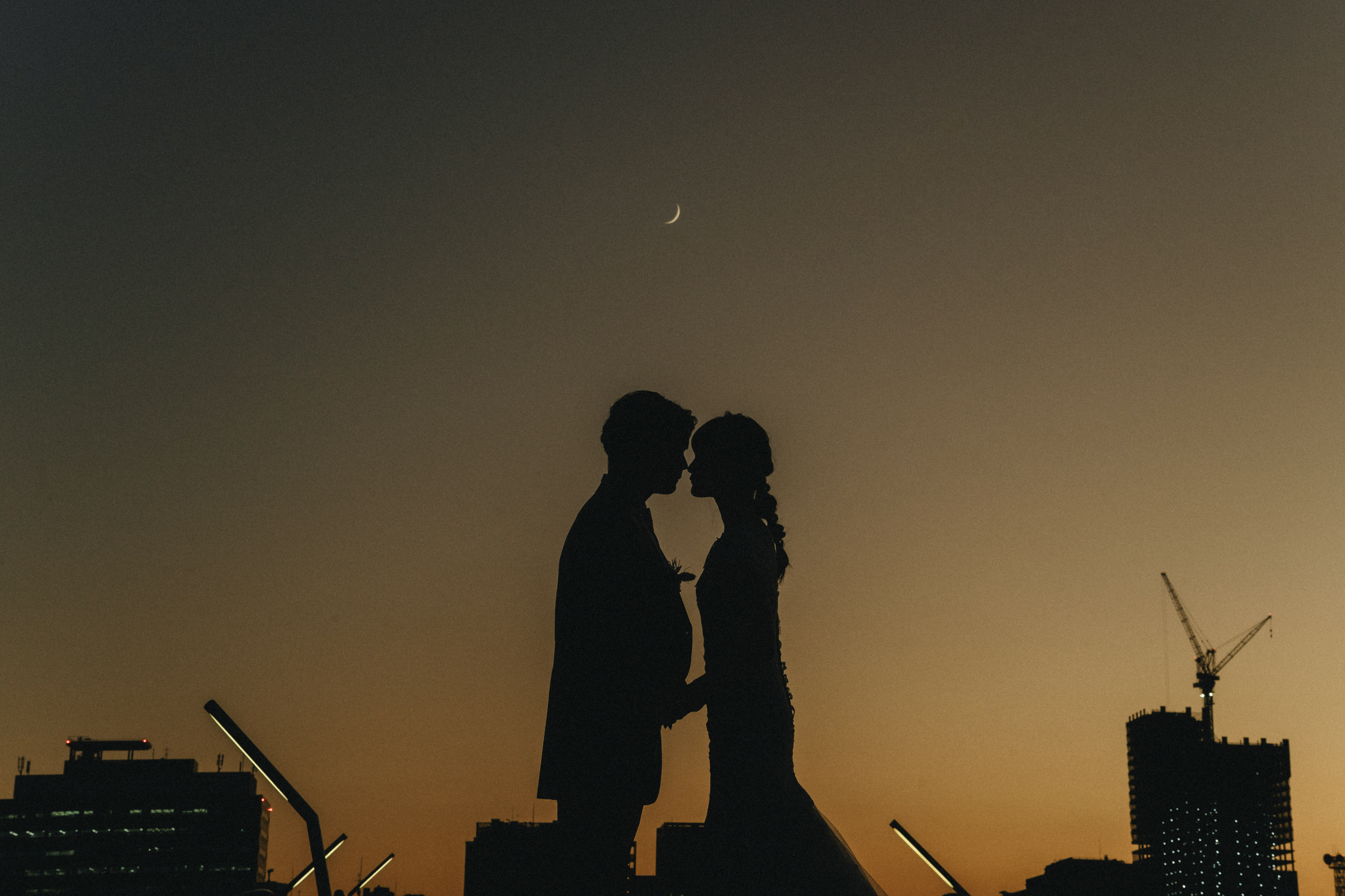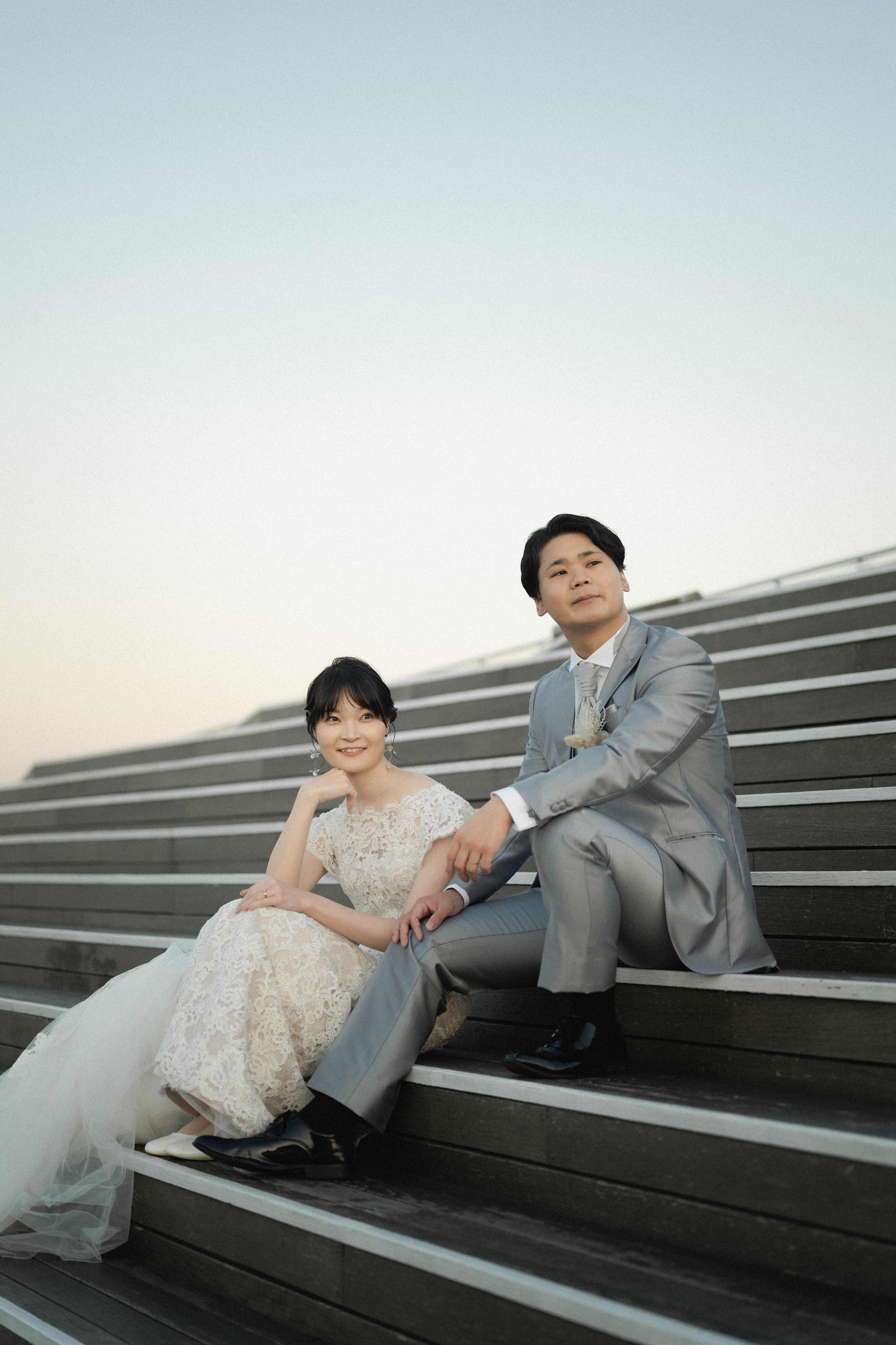 夕方には、美しい夕日が大桟橋をオレンジ色に染め、二人のシルエットが一層引き立ちました。この時間帯の撮影は特にロマンティックで、まるで映画のワンシーンのよう。横浜の広がる景色とともに、二人の笑顔が印象的な素晴らしい写真を残すことができました。