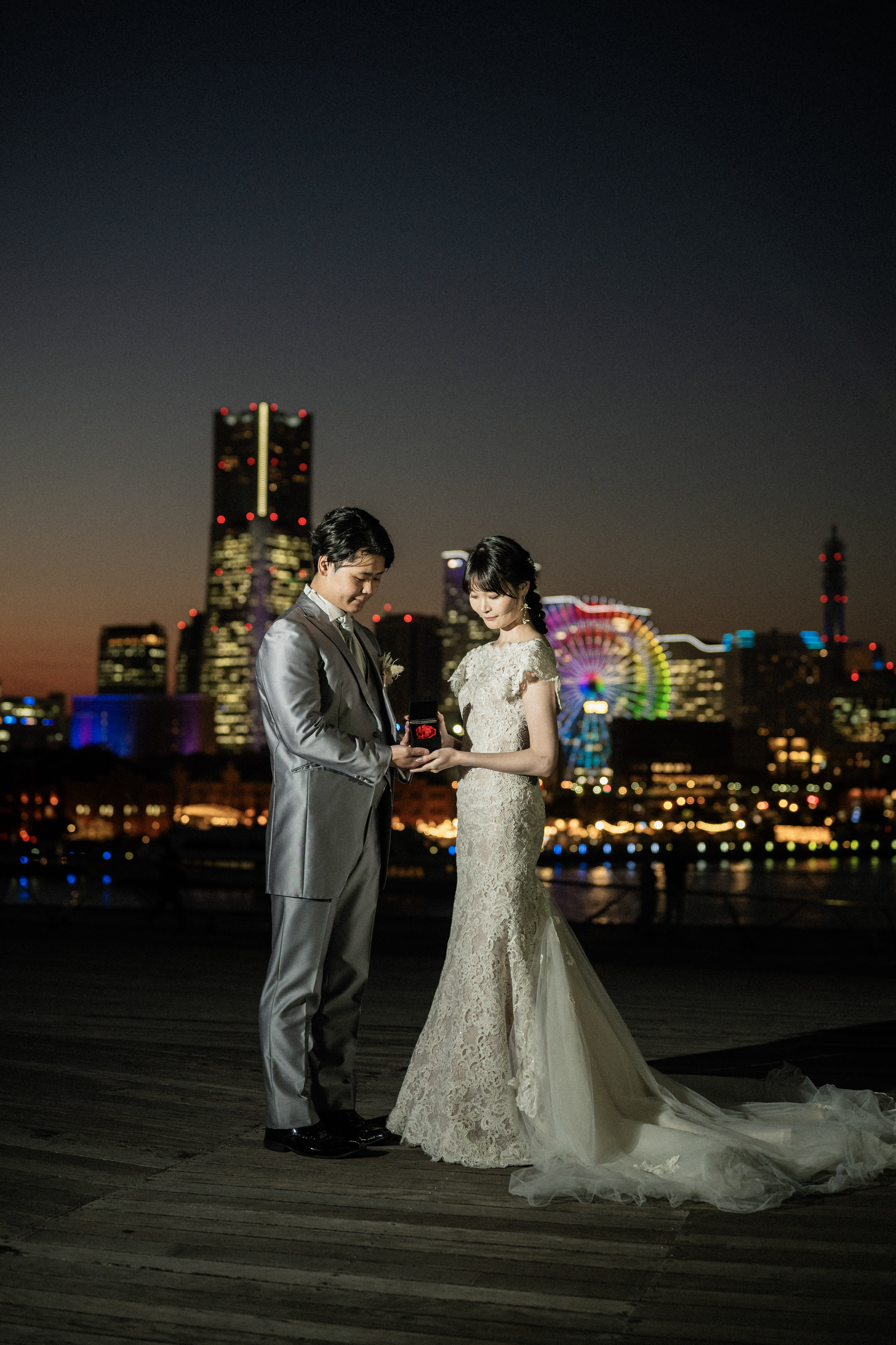 夜景が始まると、横浜の煌めく街並みが背景に。そんな中でもお二人は自然体で、照れた笑顔がより一層輝きを増していました。この特別な瞬間をカメラに収めることができて、本当に嬉しかったです。