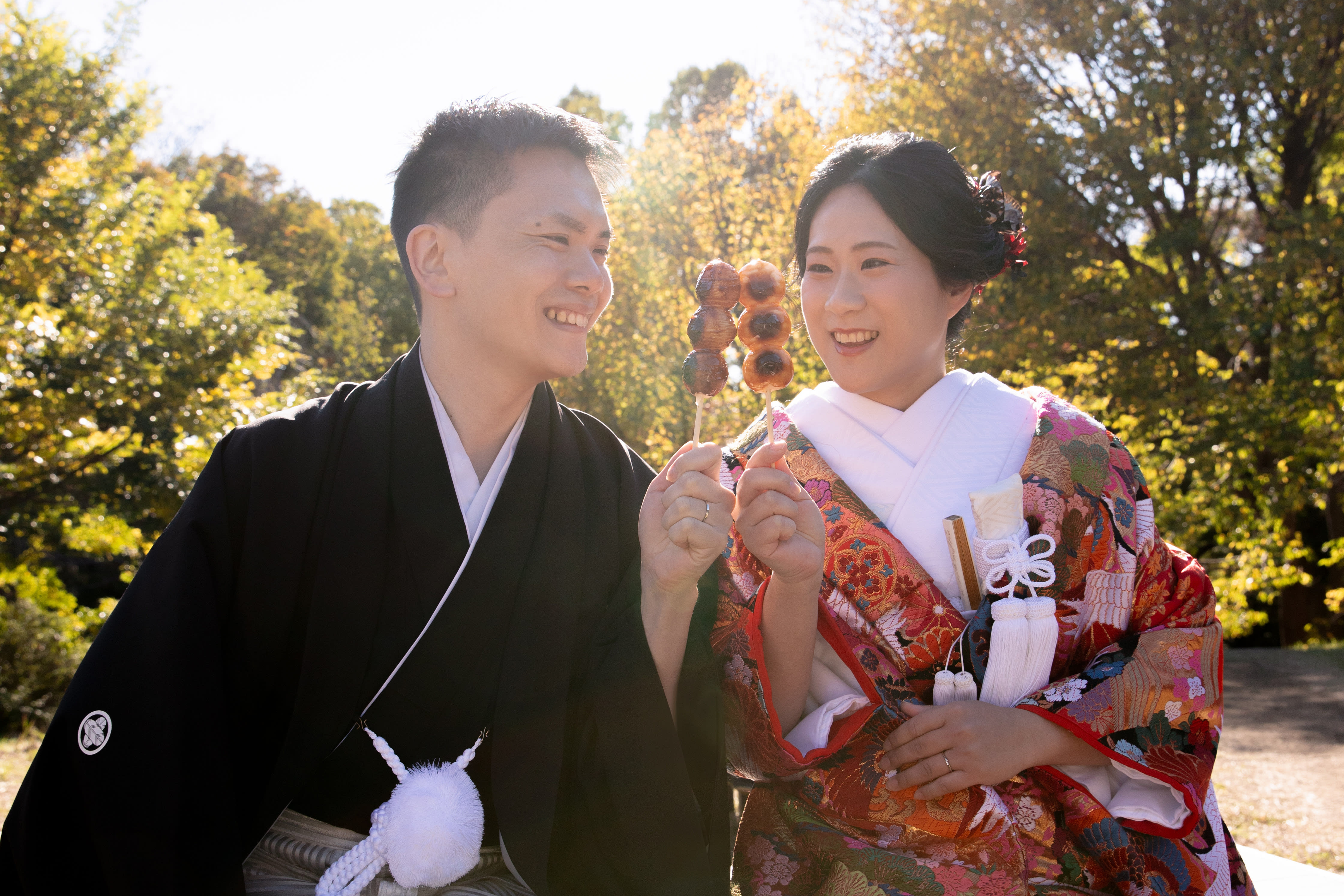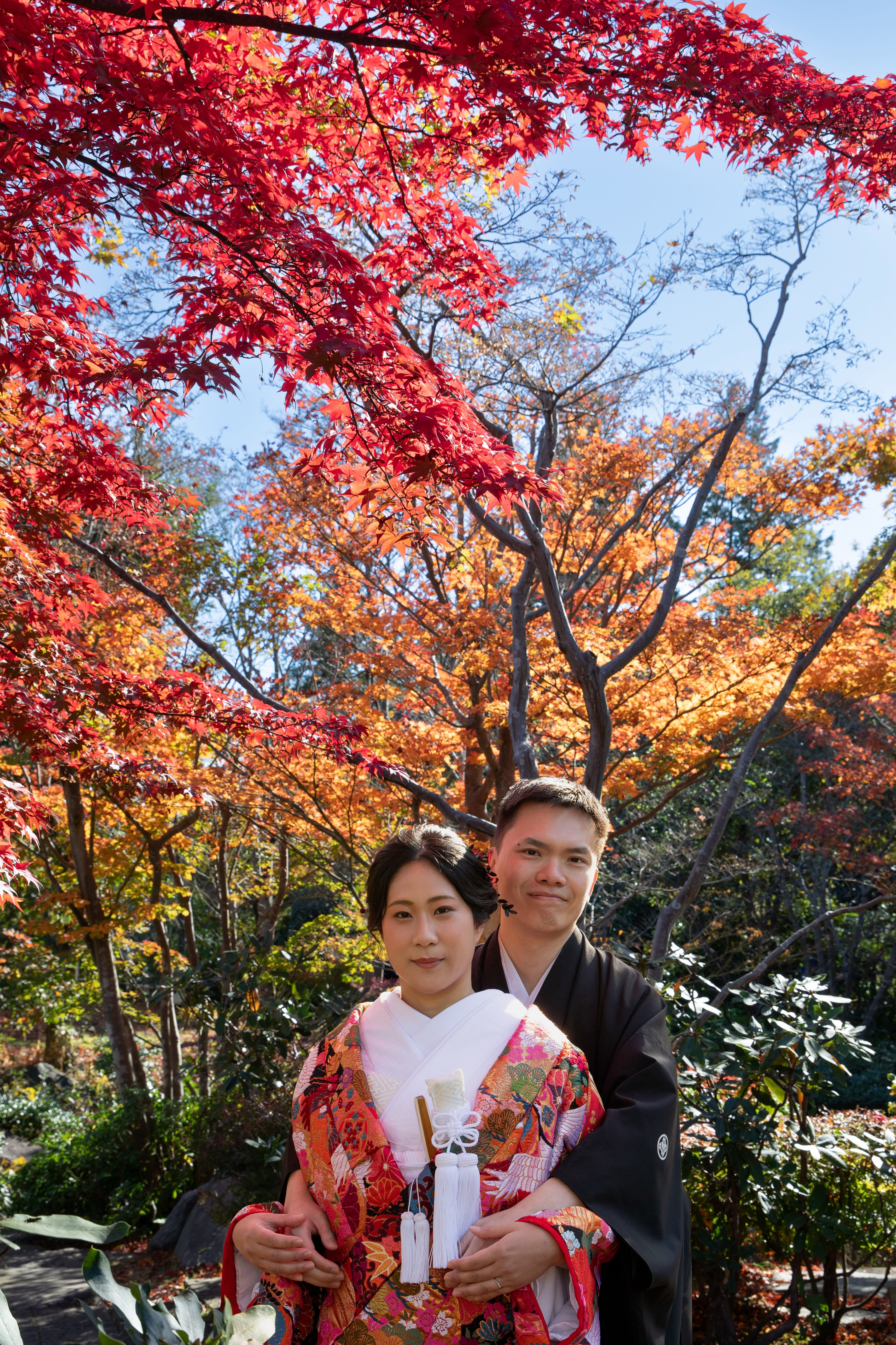 昭和記念公園の鮮やかな紅葉と青空の中にいる素敵なお二人!