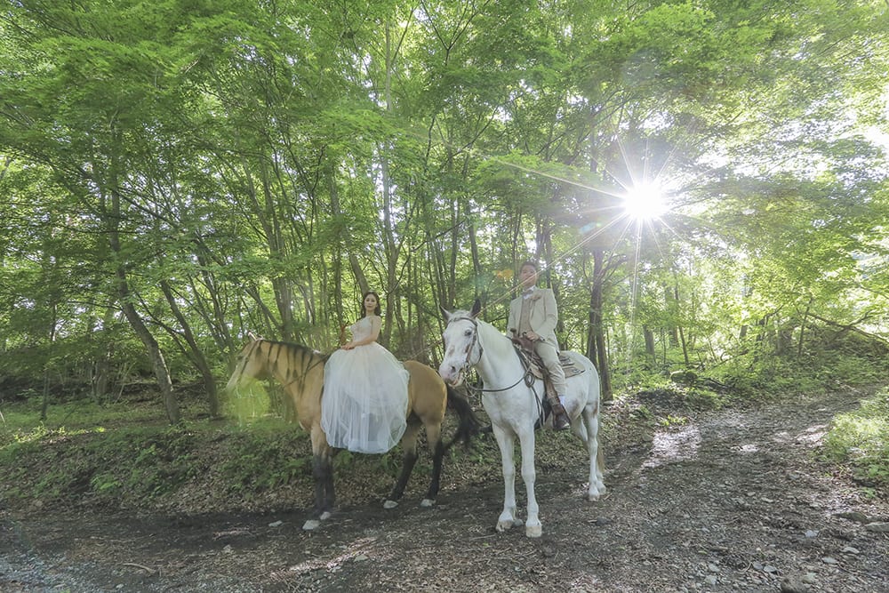 美しい森でウェディングドレスで乗馬できるプラン