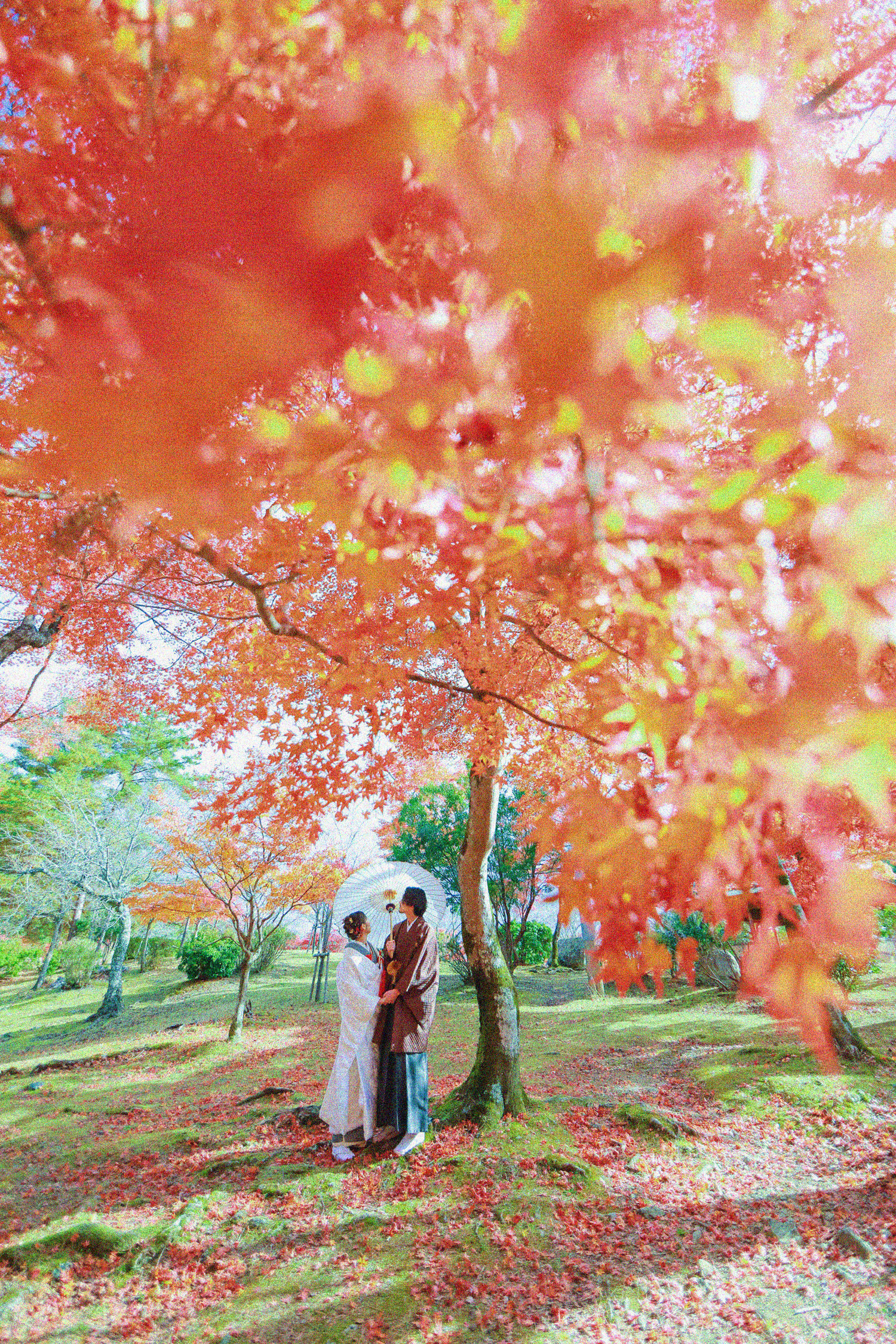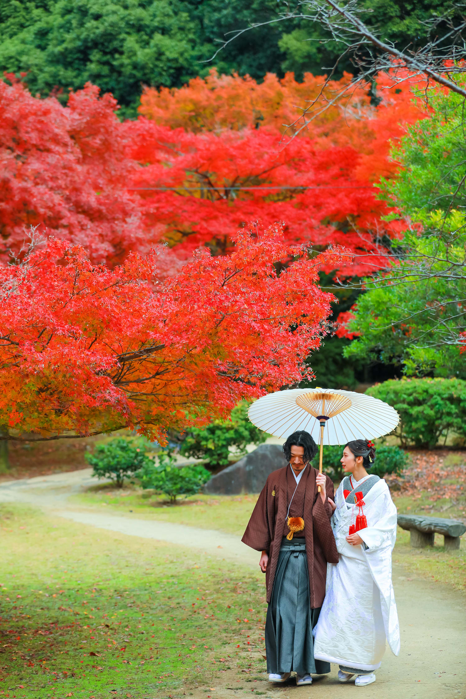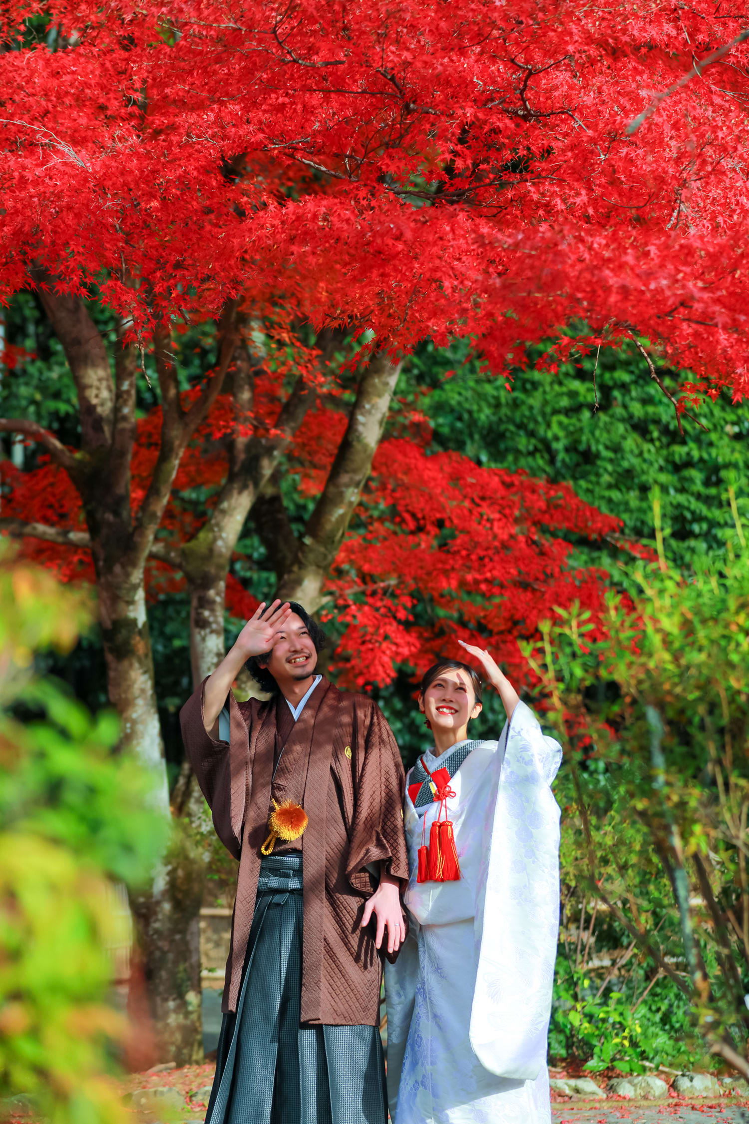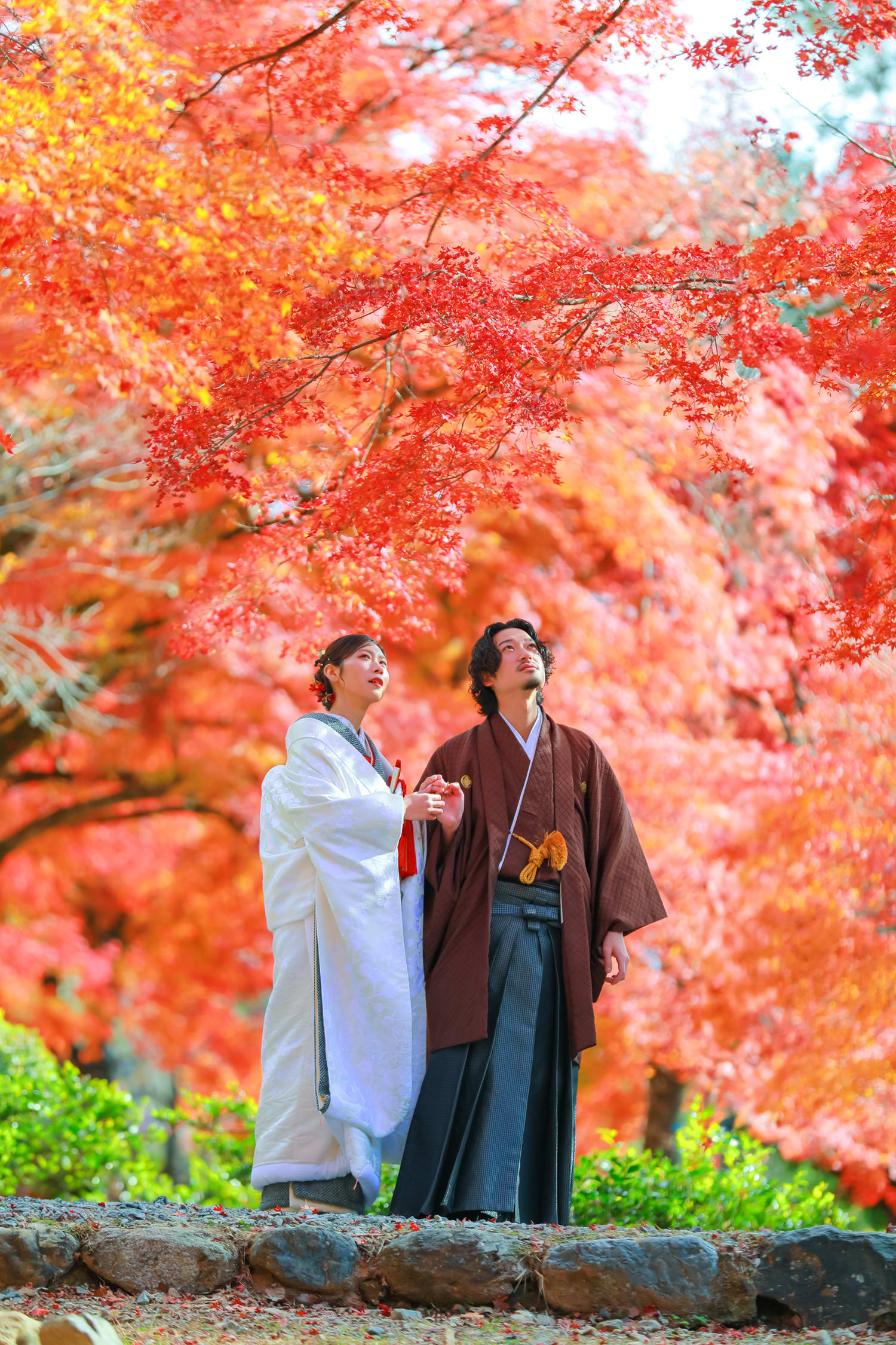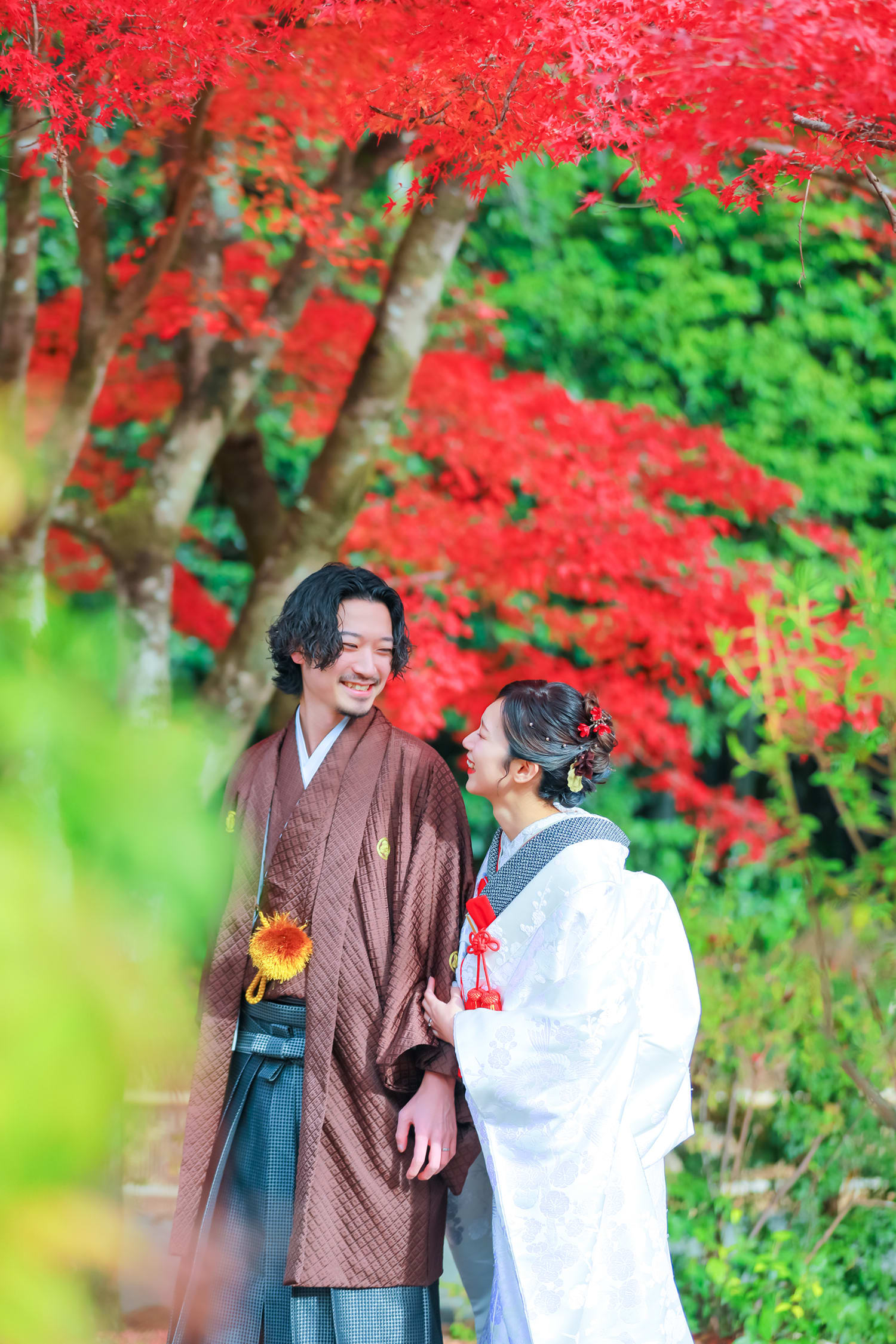 和装姿のよく似合うお二人です。色鮮やかな紅葉もお二人の結婚写真を鮮やかに彩ります。笑顔も素敵です。
