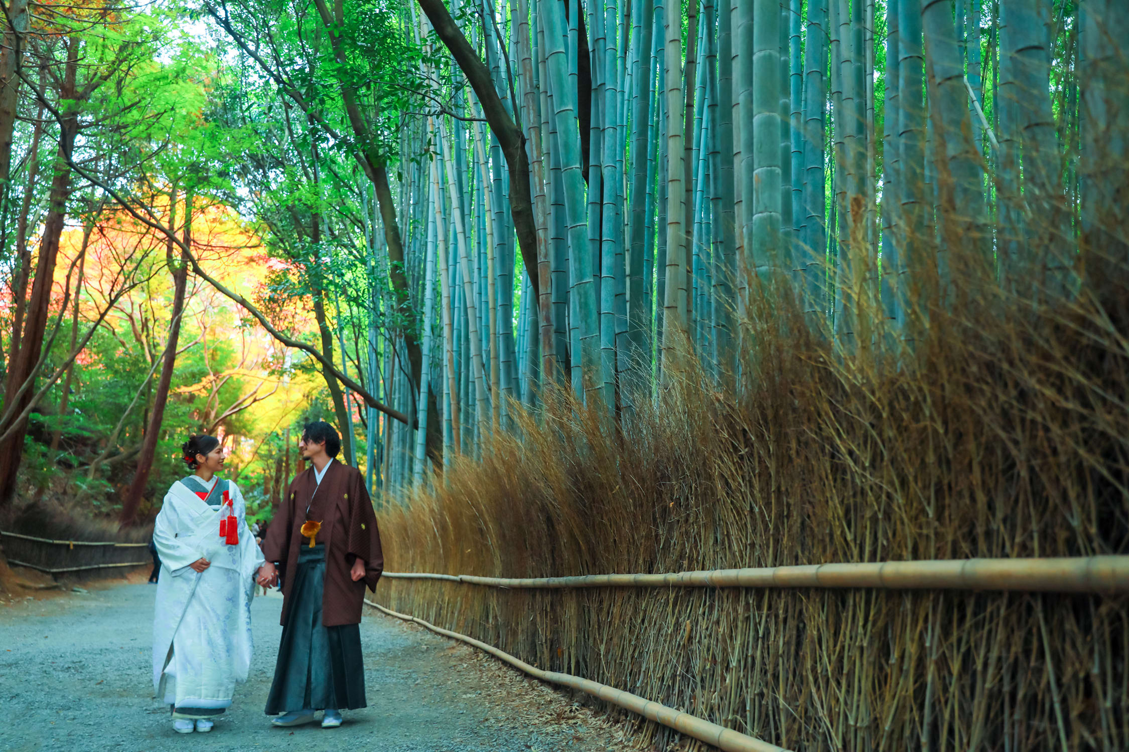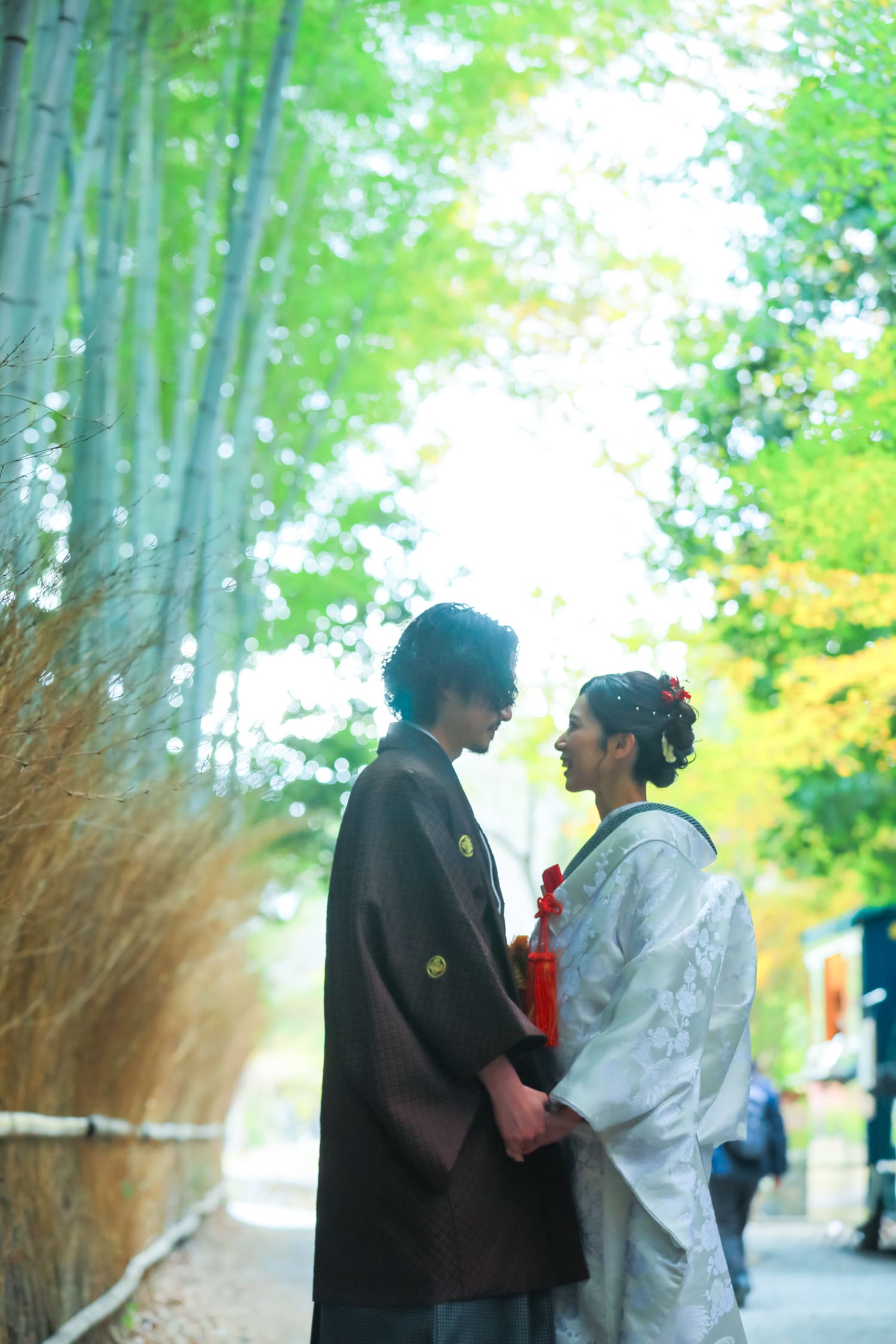 和装のフォトウェディングは秋の紅葉も美しい嵐山でとお二人のご希望でした。天候にも恵まれ、鮮やかなウェディングフォトに仕上がりました。