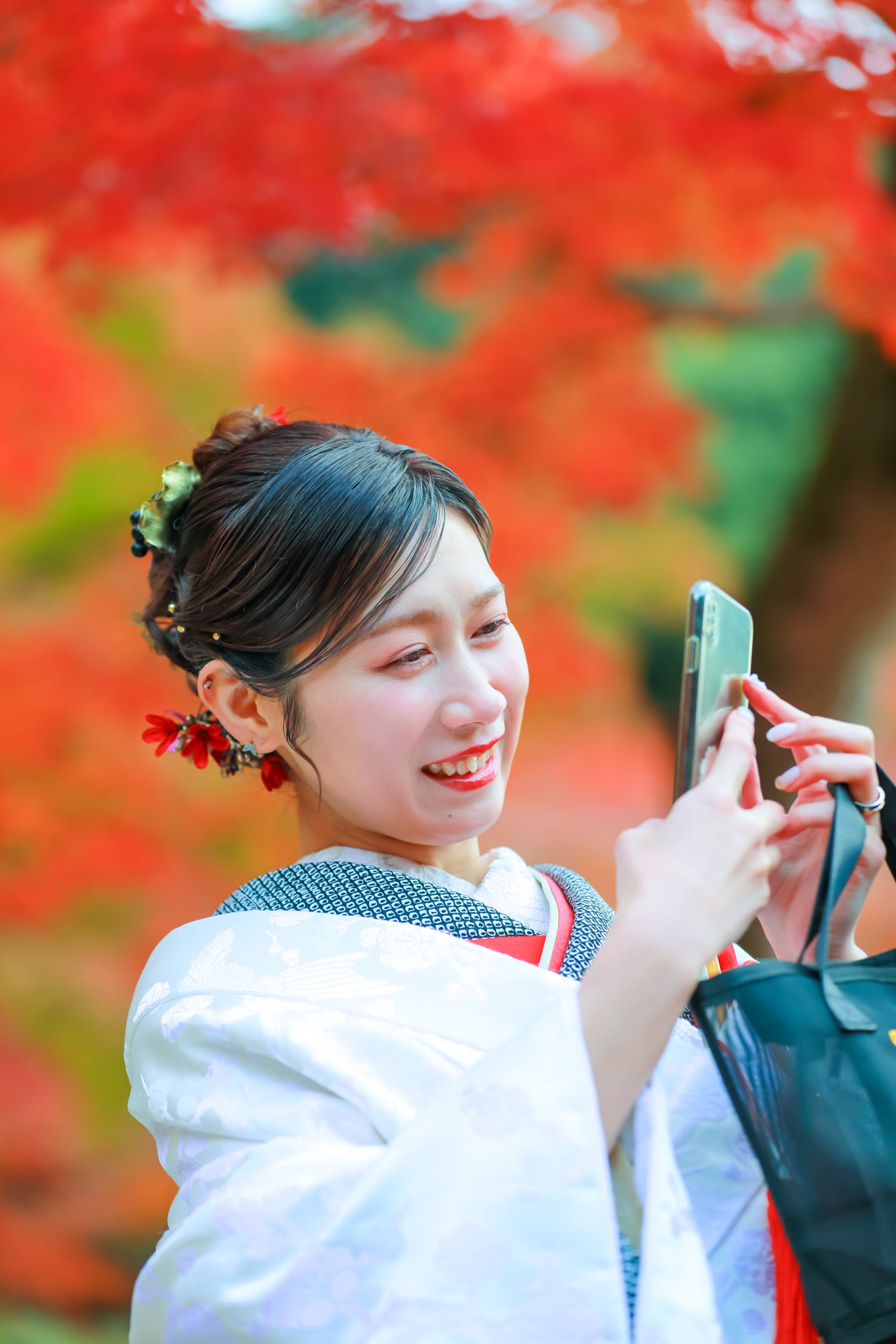 秋の京都、紅葉の中で白無垢姿のご新婦様の笑顔が素敵です。