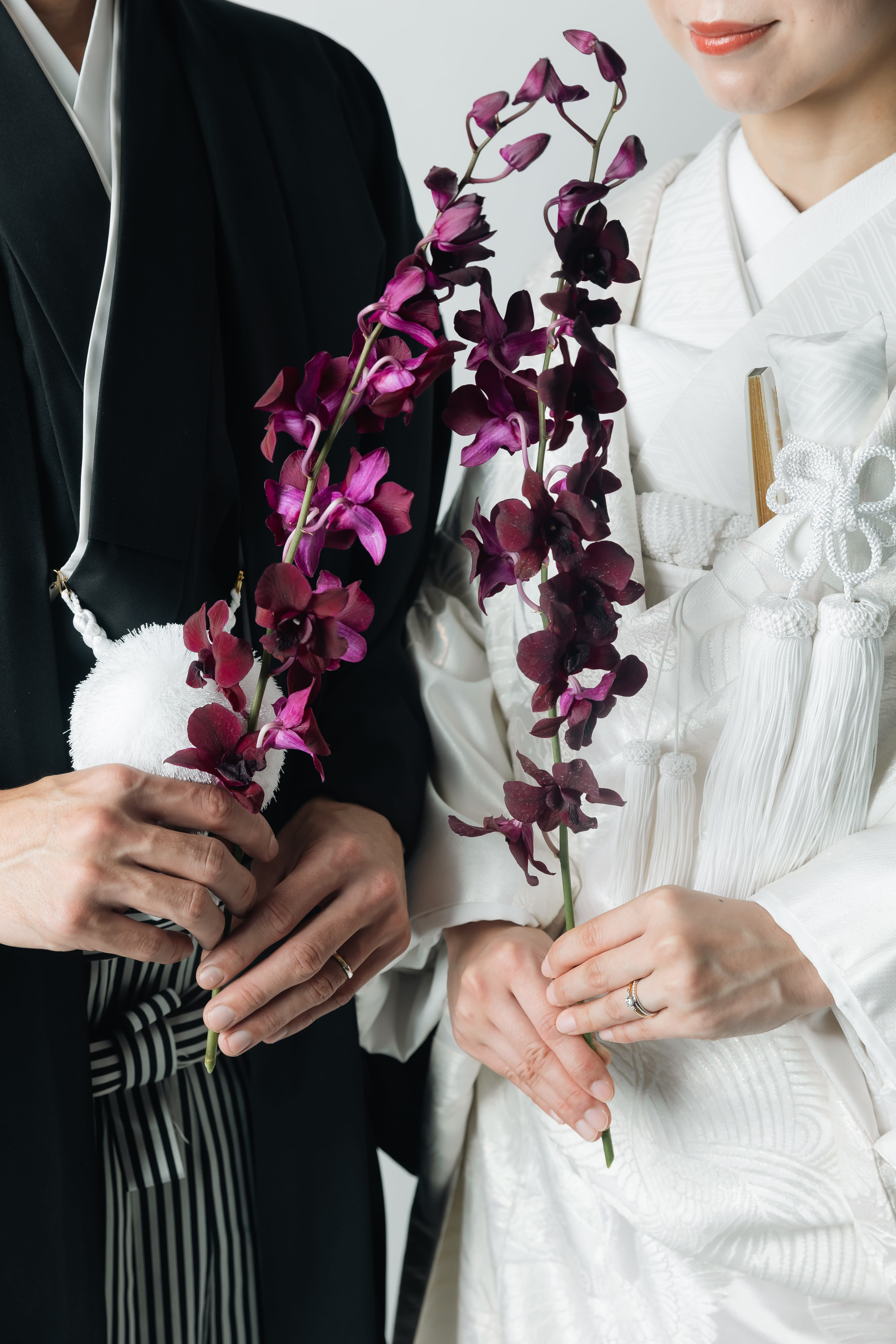 お二人、寄り添いながら和装をかっこいいイメージで。お二人のご希望のイメージをカメラマンにお伝えくださいね。