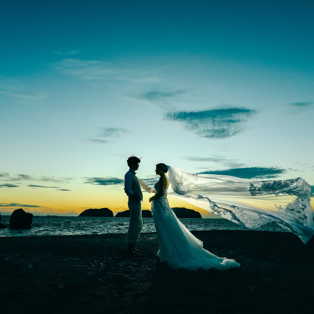 ベールを着けて、夕焼け空とマジックアワーの中で揺らめくロマンチックな写真も海のロケーションならではですね!