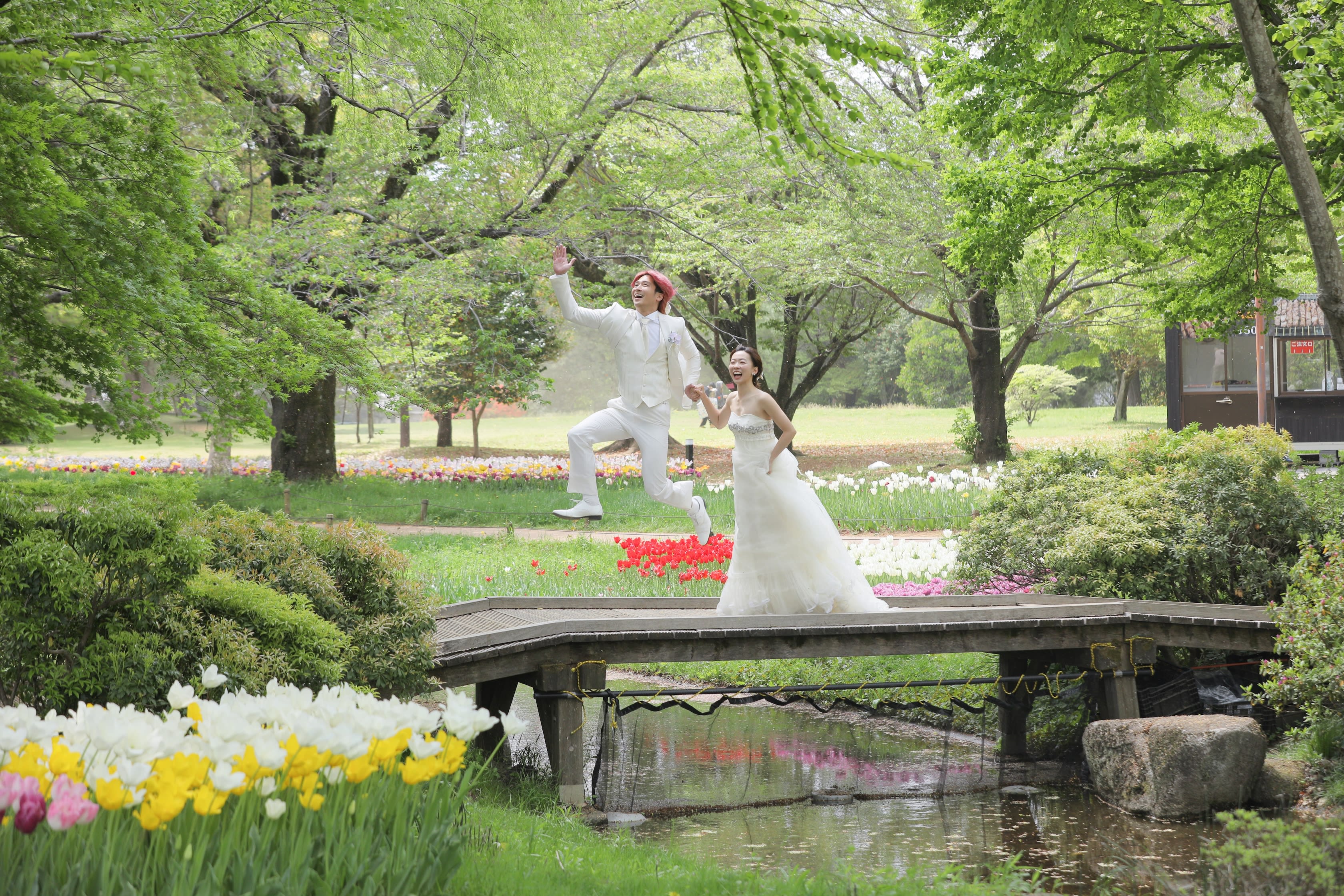 ピンクのチューリップからお二人をパシャリ!ご新郎様の髪色とマッチしていますね!