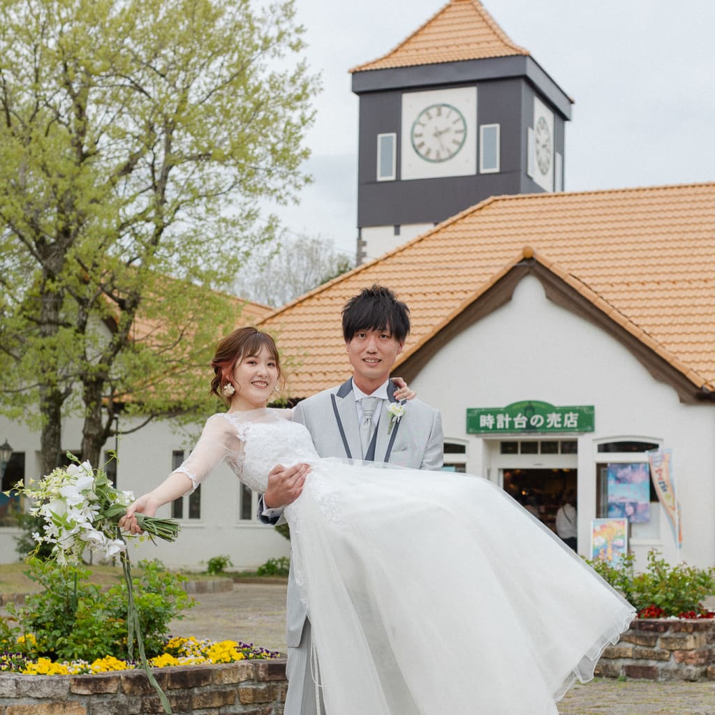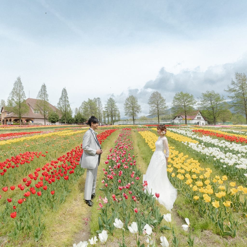 ブルーメの丘の洋館は、オランダ風でとてもかわいいです。広大なチューリップ畑もあるので、本当に海外でフォトウェディング撮影したみたいにもなります。