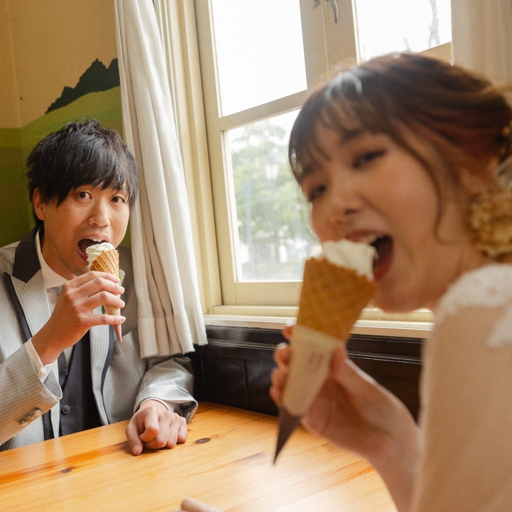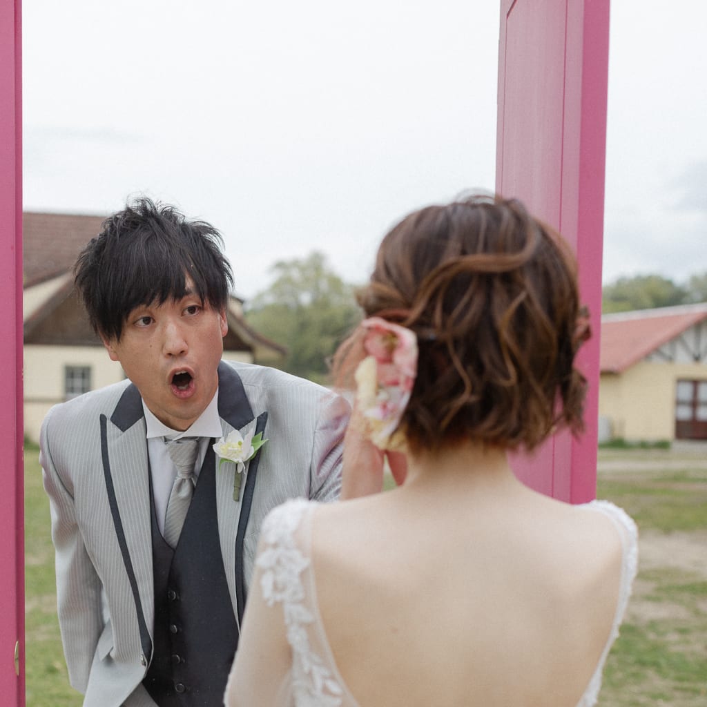 新緑と白い柵がかわいい牧場前での撮影。おふたりの仲睦まじい様子が素敵なウェディングフォトになりました。