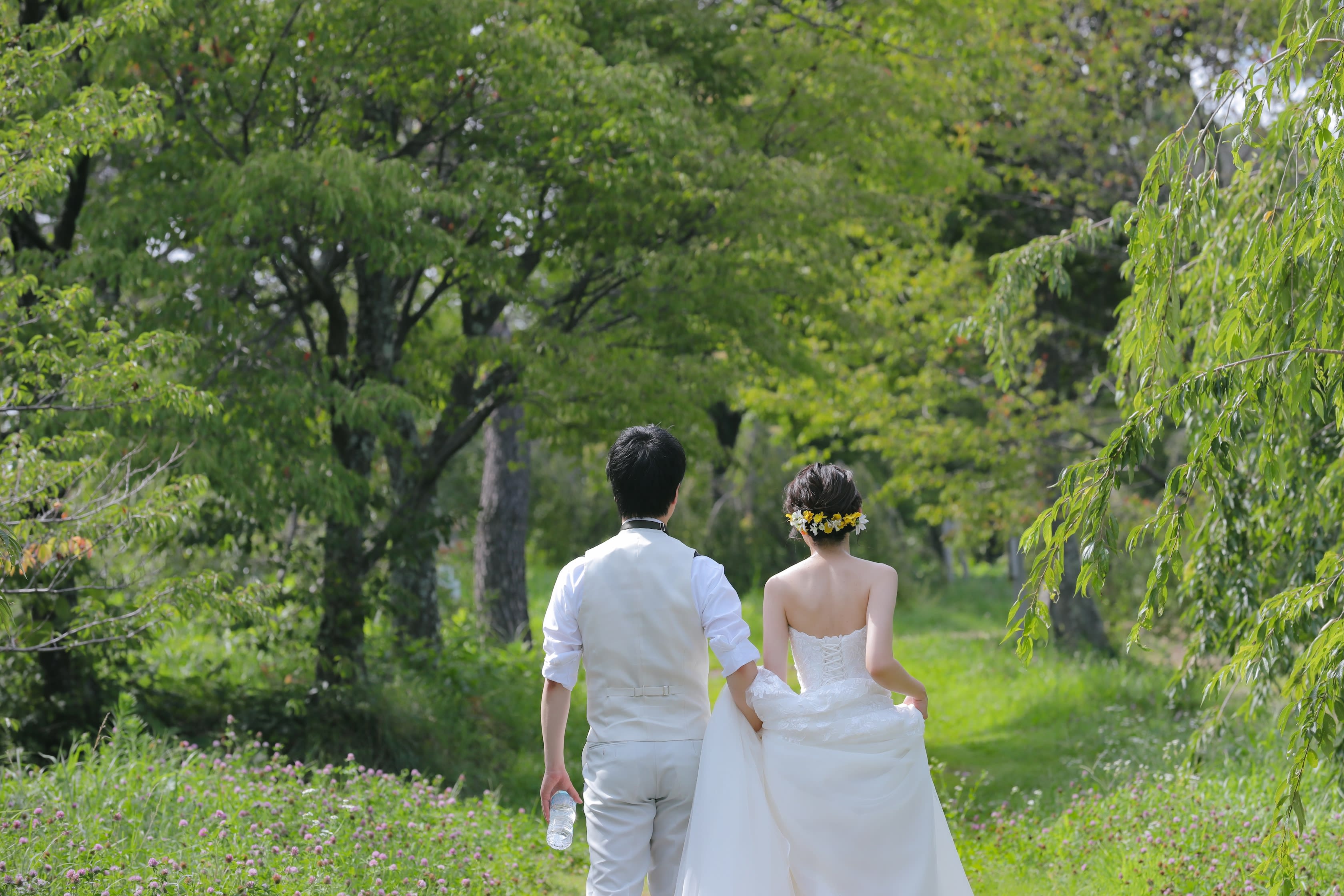 洋装2ヶ所プランの場合はお好きなロケーション地を2ヶ所選べます!こちらのお二人は飯綱山公園を選んでくださいました!2ヶ所目にいくタイミングでドレスもチェンジ!