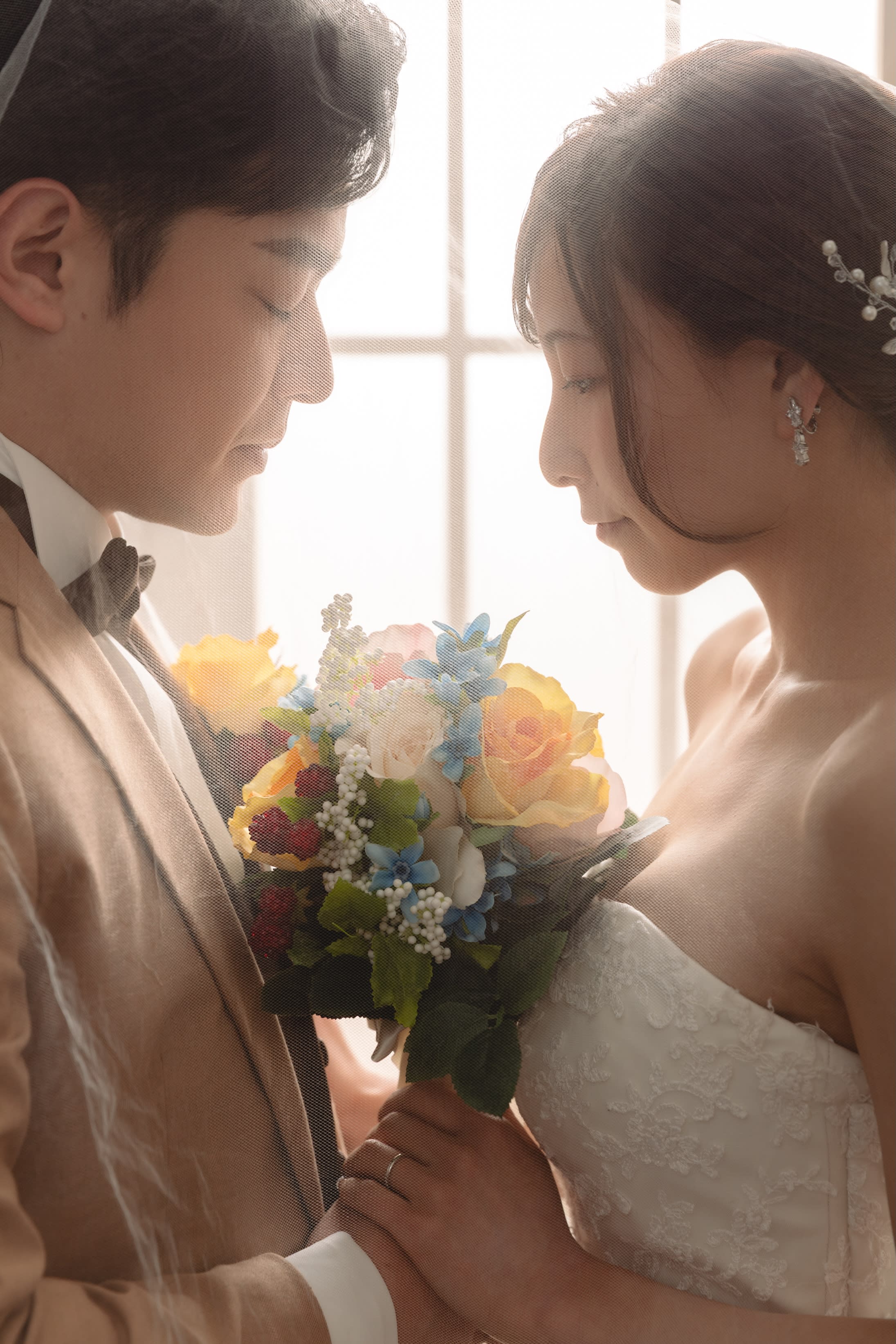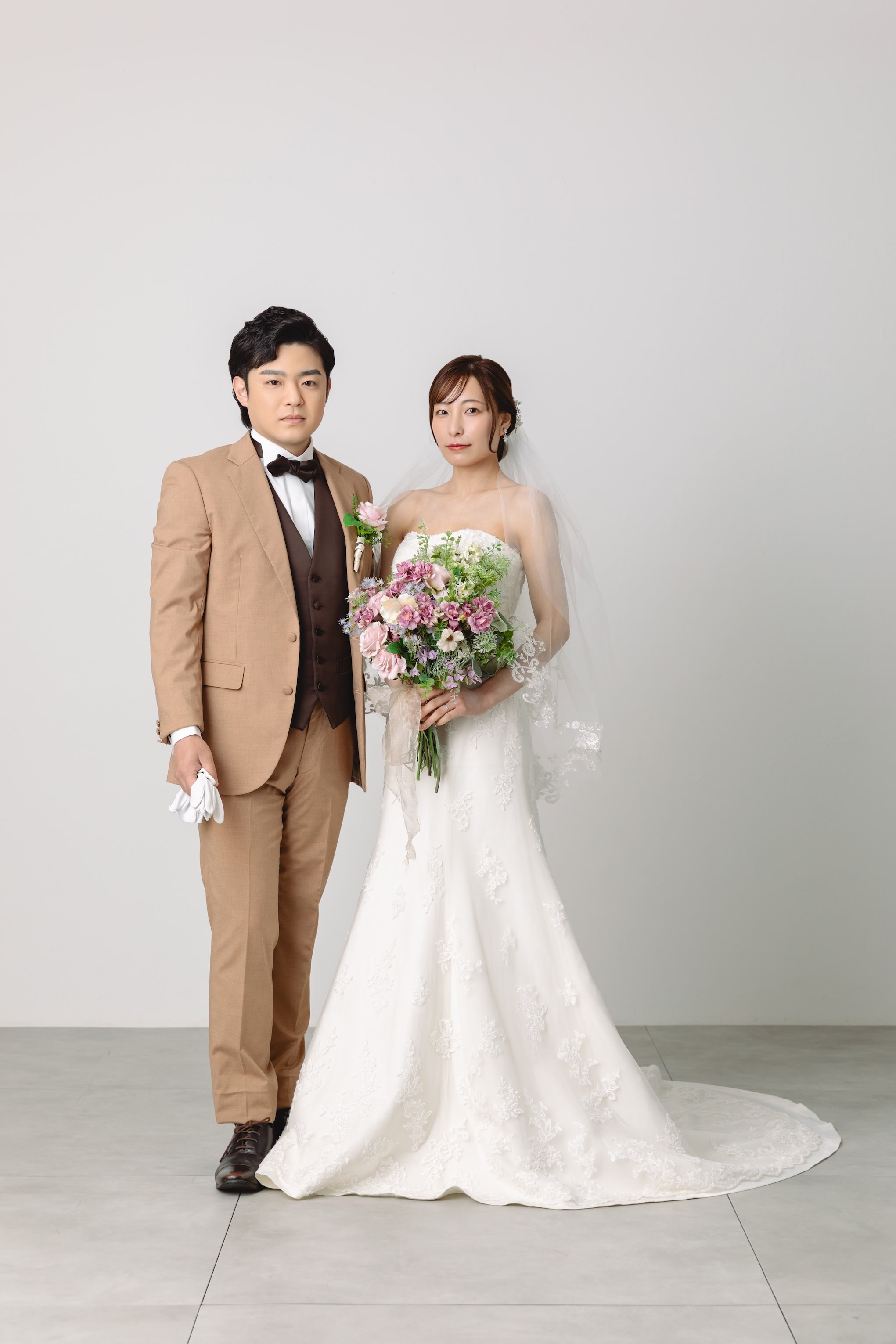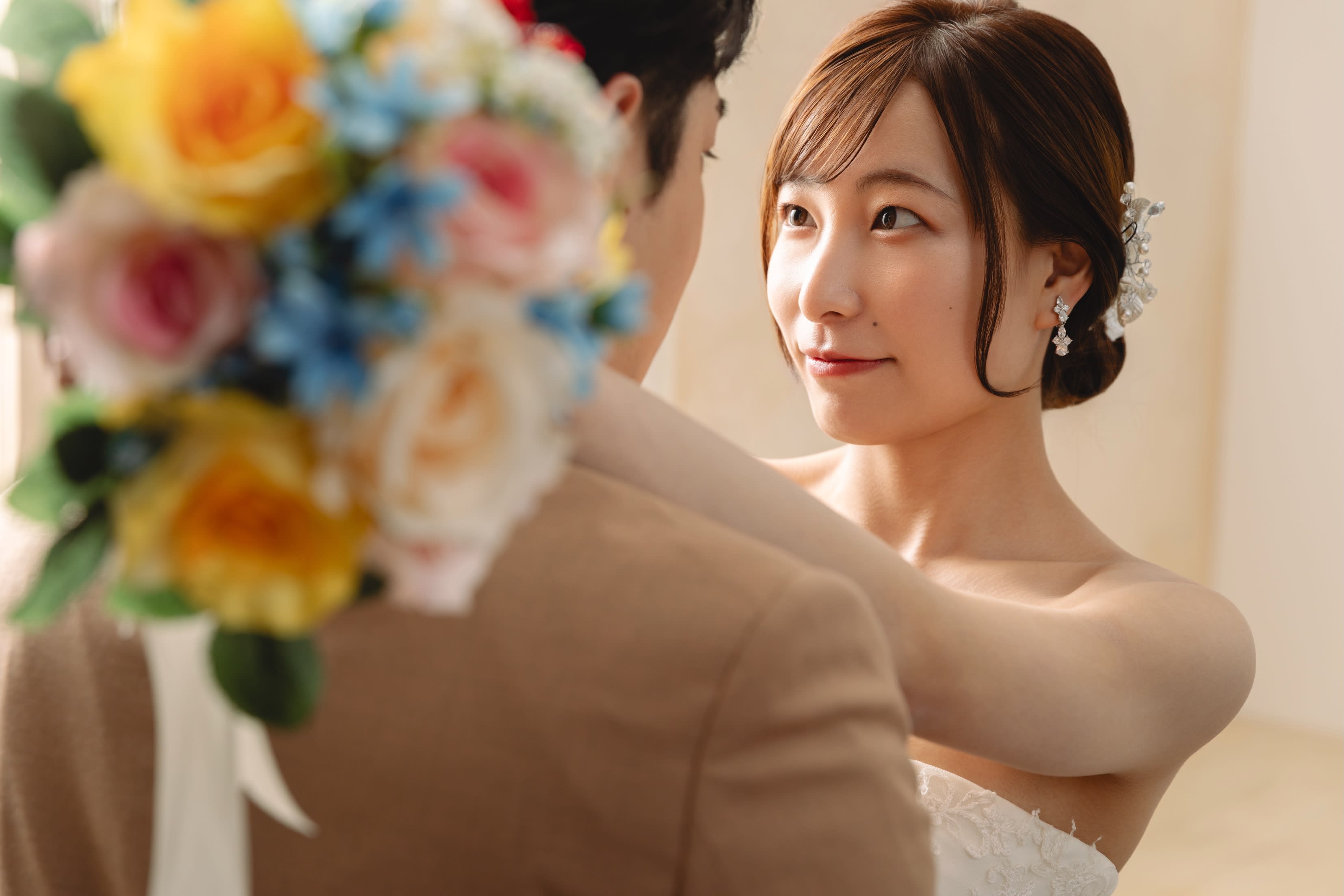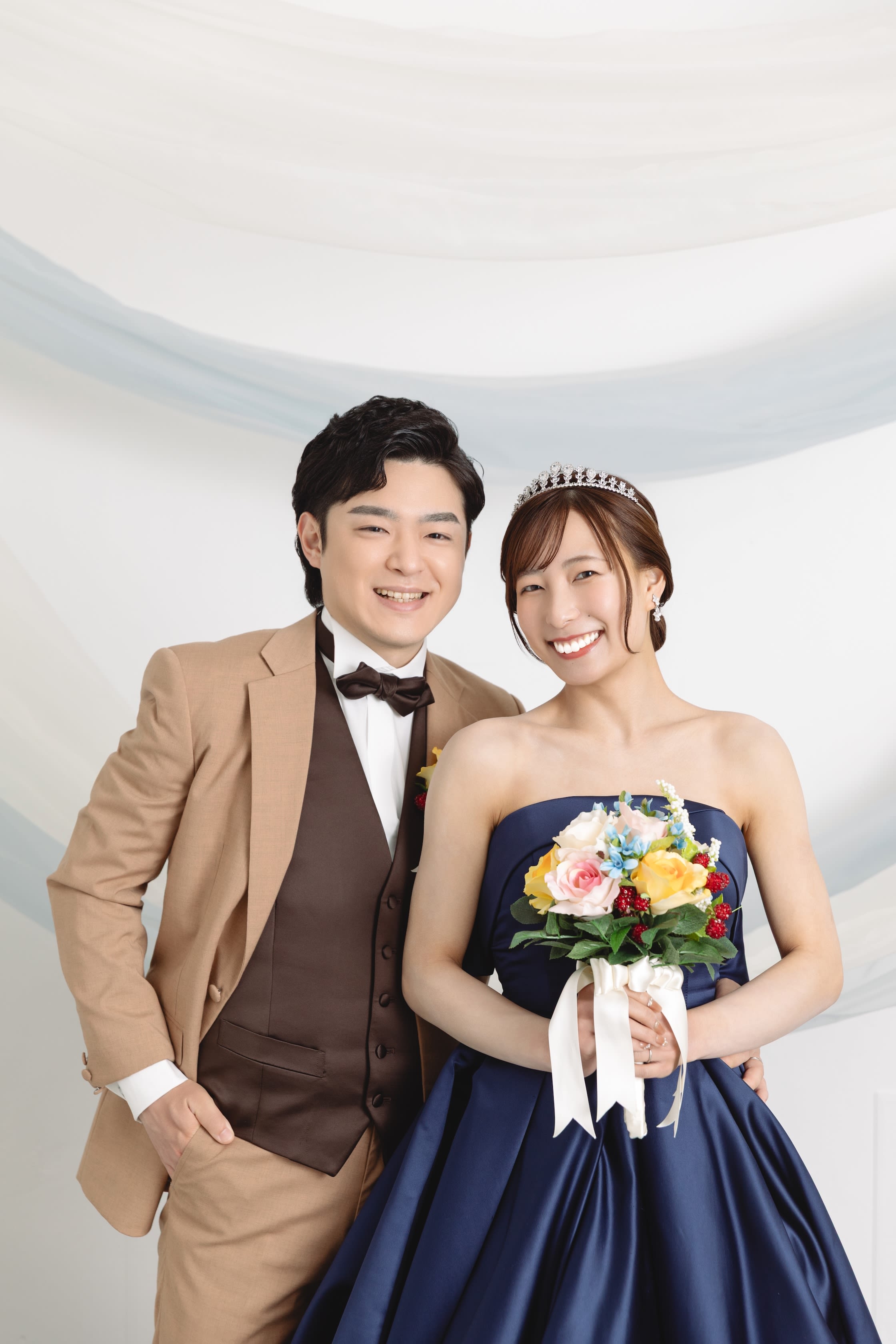 白の壁を背景にすることでブルーのドレスがとっても映えるお写真に!