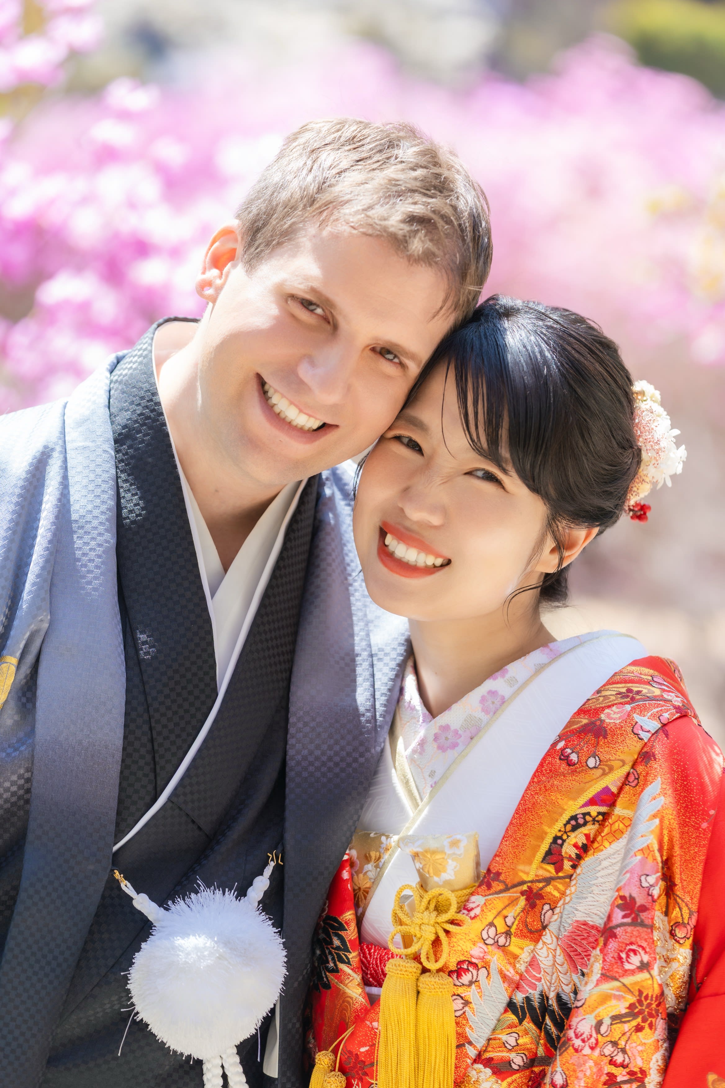 新郎様からのバックハグ!お二人で桜を見る姿がとても素敵ですね!