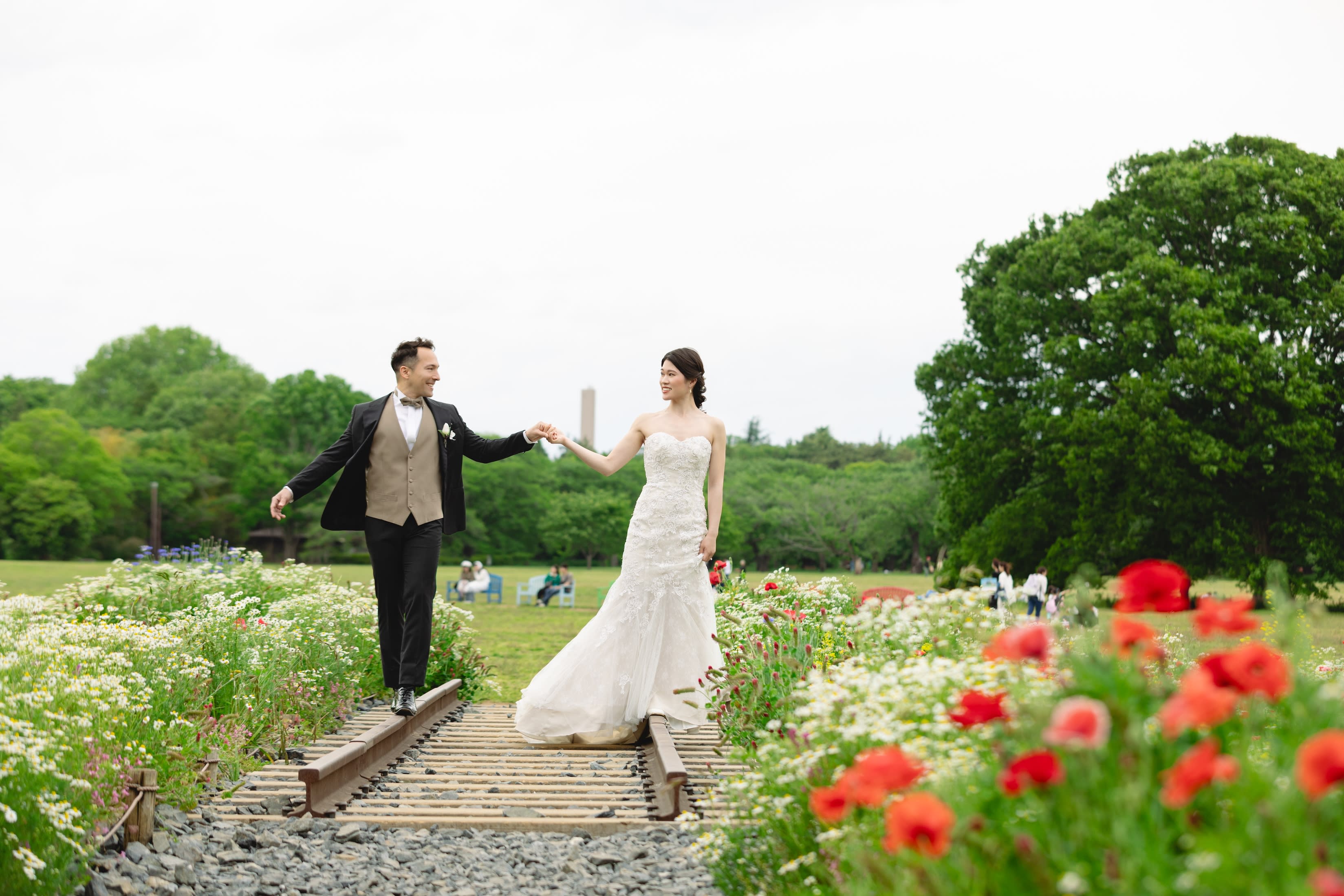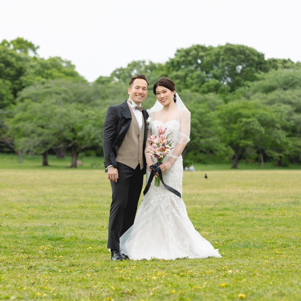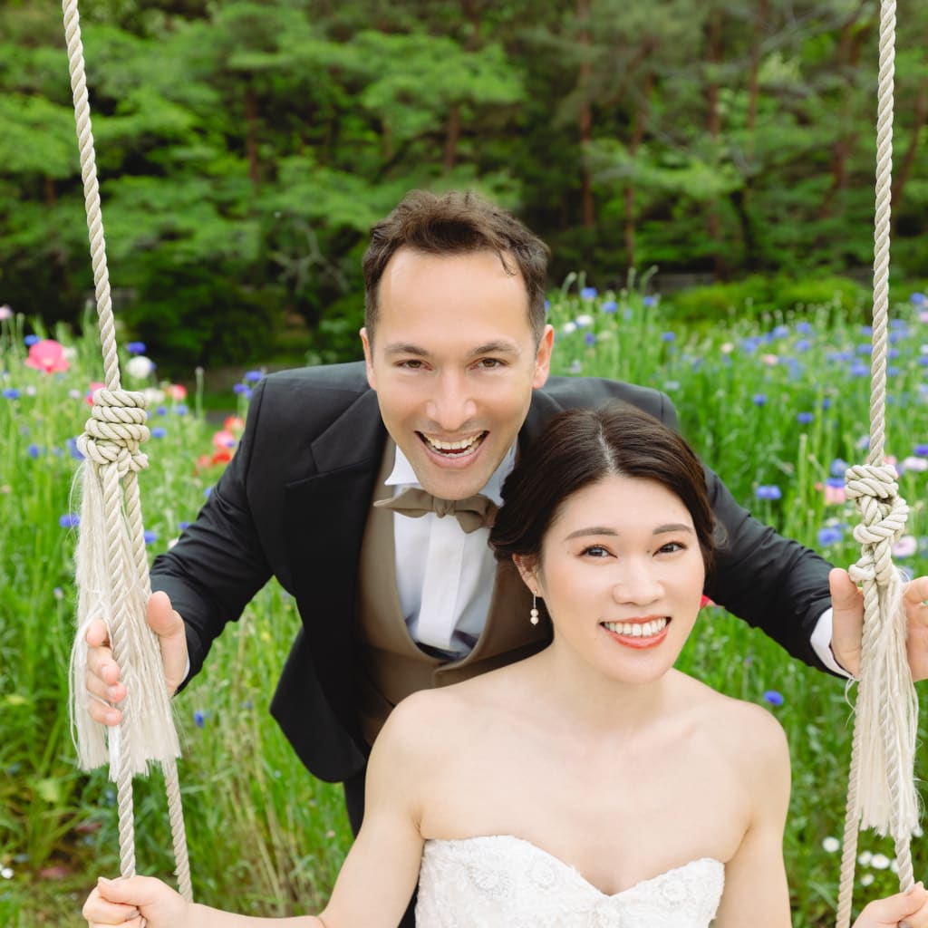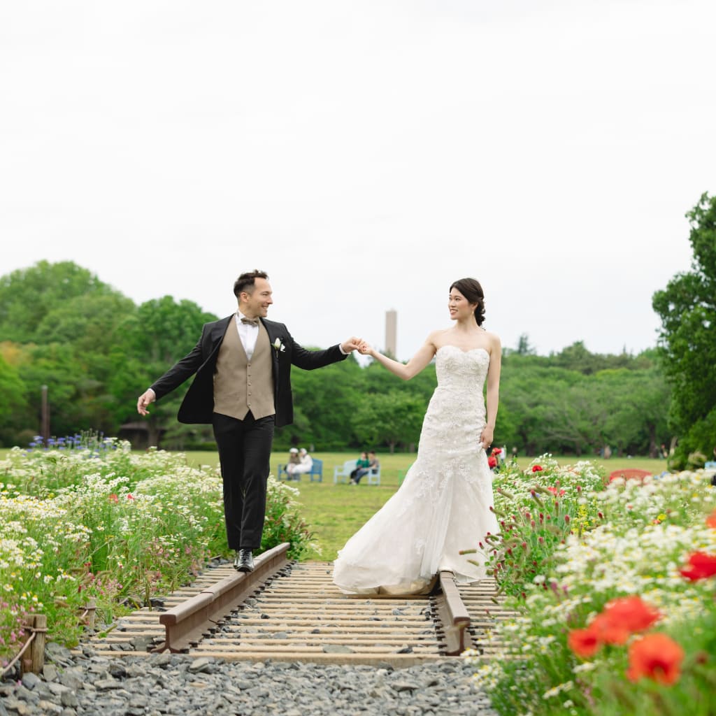 場所を変えて、ブーケガーデンにて撮影。 お二人の素の笑顔がとても素敵です。