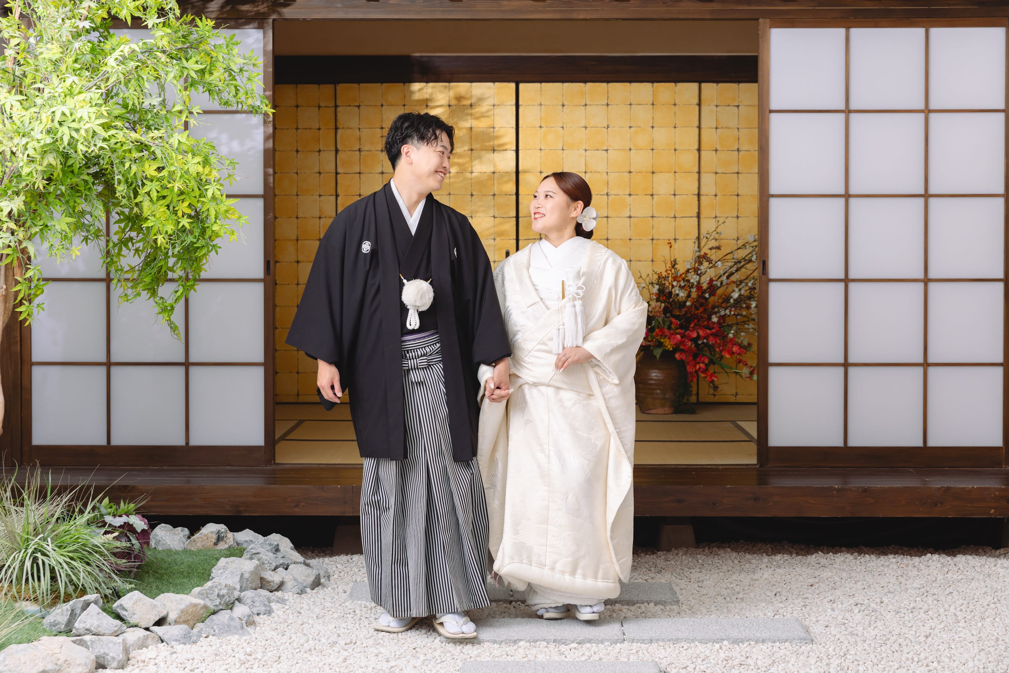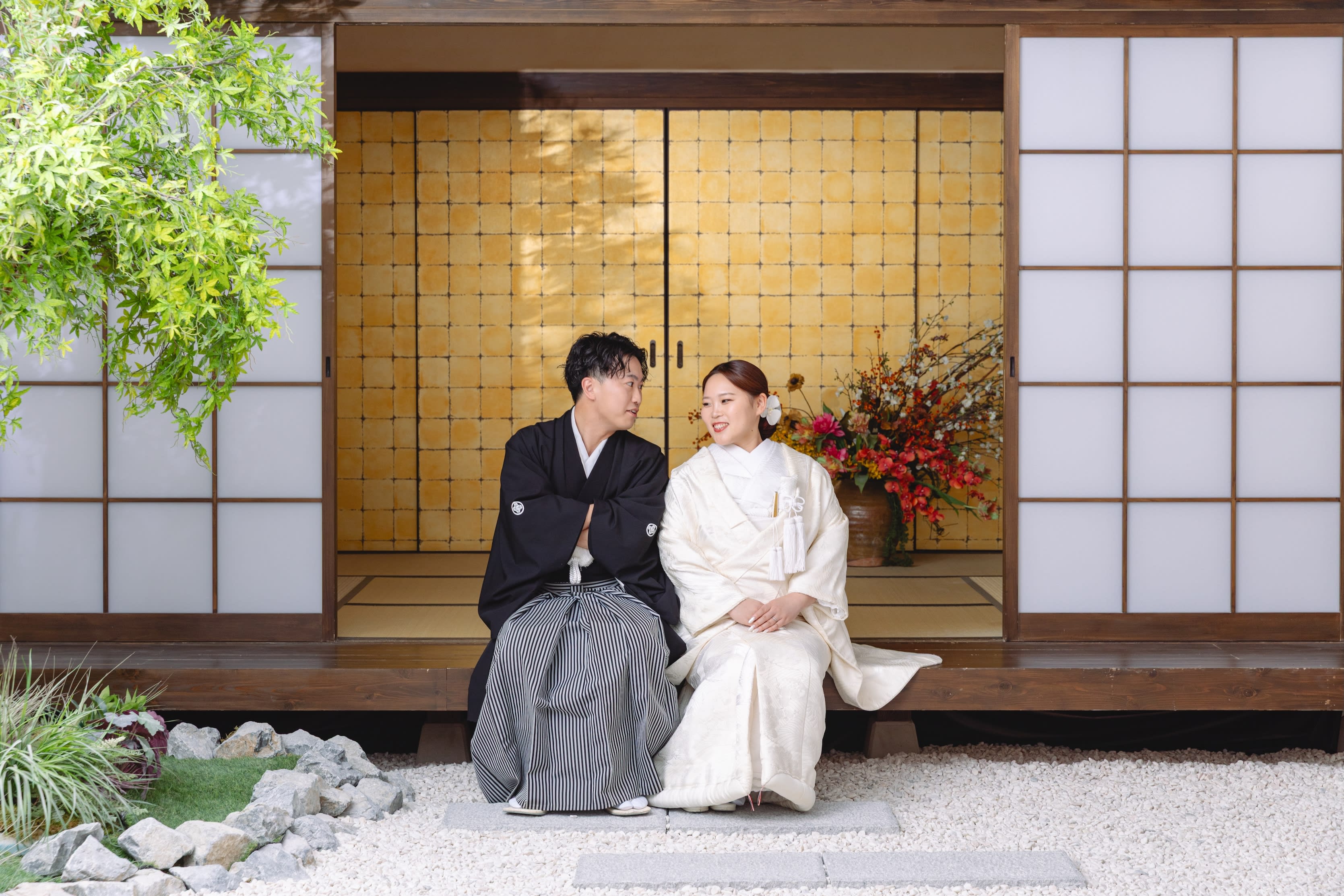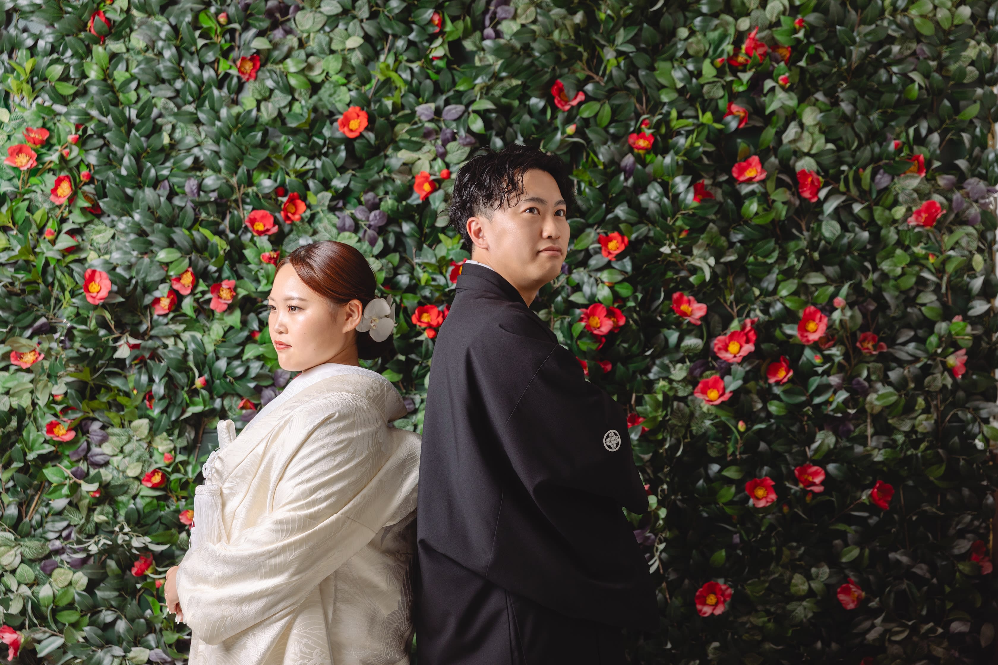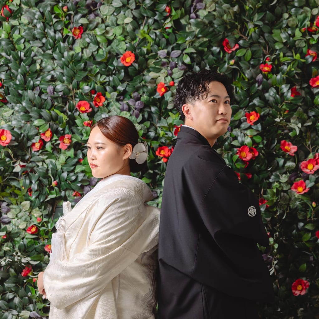 次は白の和傘一本で、相合傘をしている様子。 椿の背景だと白の和傘がとても映えます。
