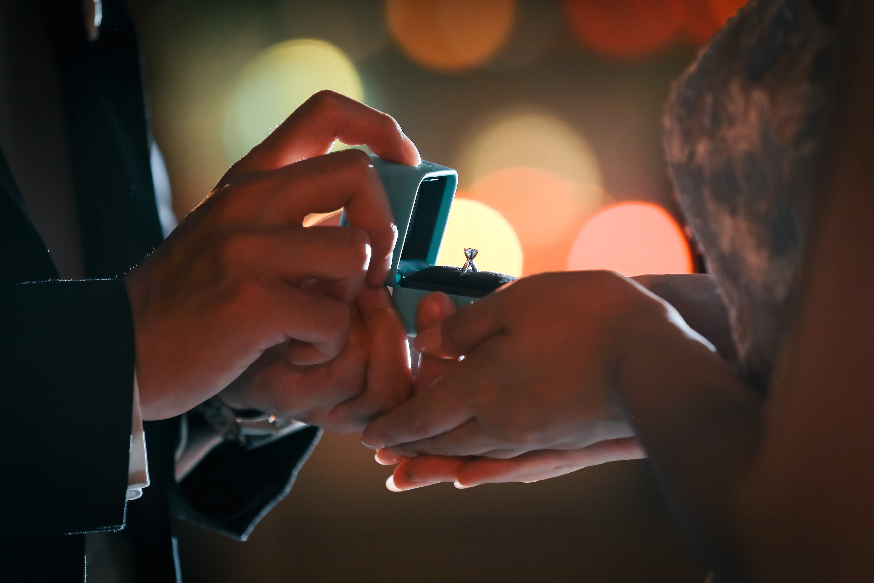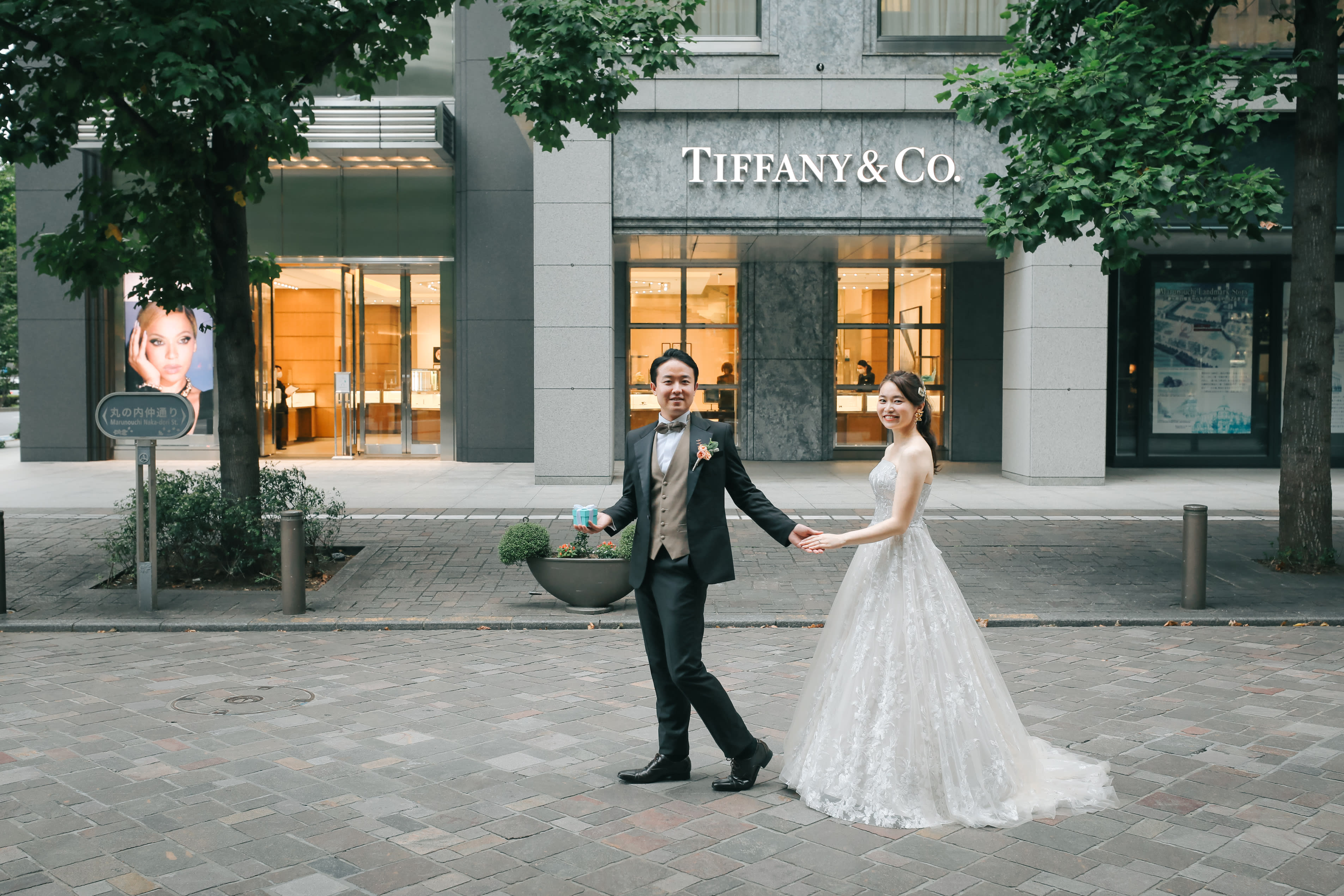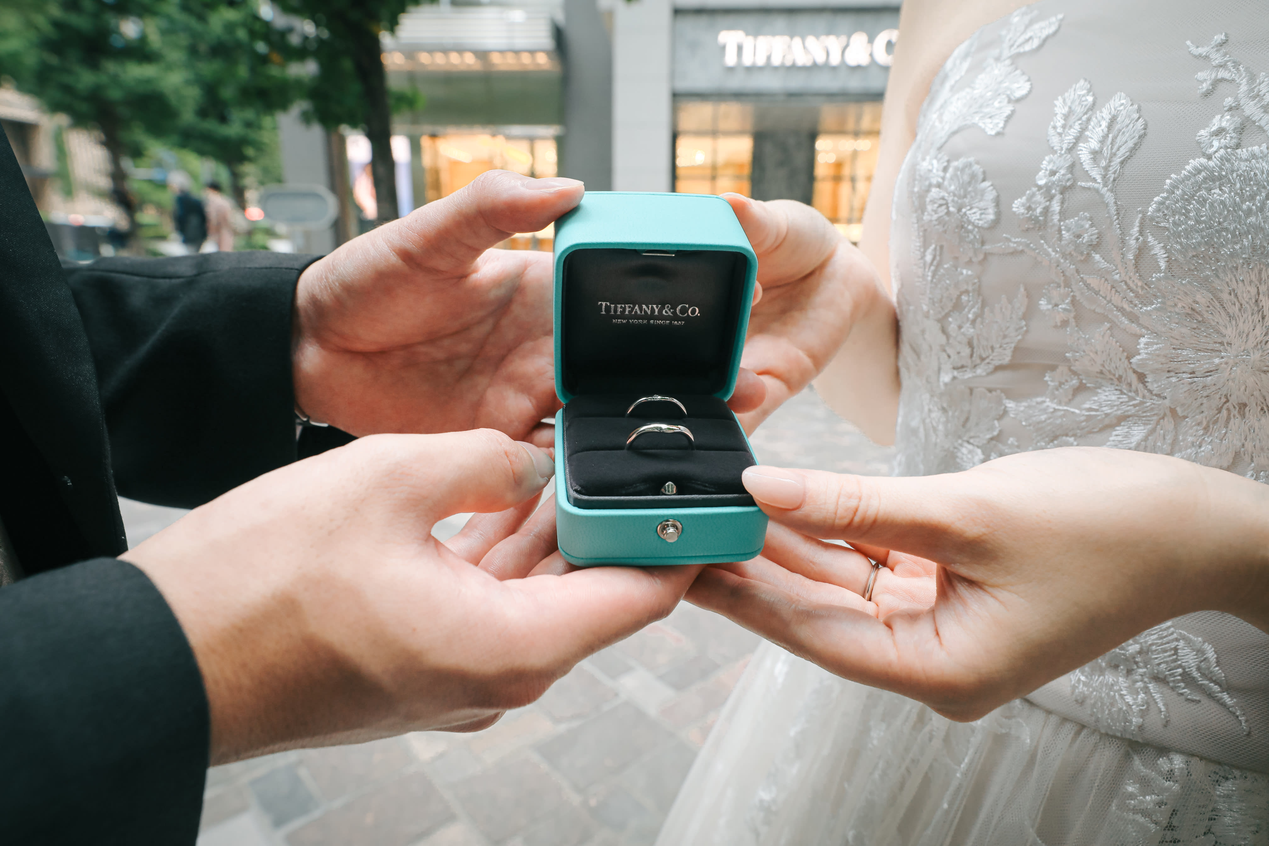 お二人の指輪はティファニーで購入されたそうなので、お店の前で撮影してみました!ご新郎様の手元には、まだ未開封の指輪が入った箱が♡