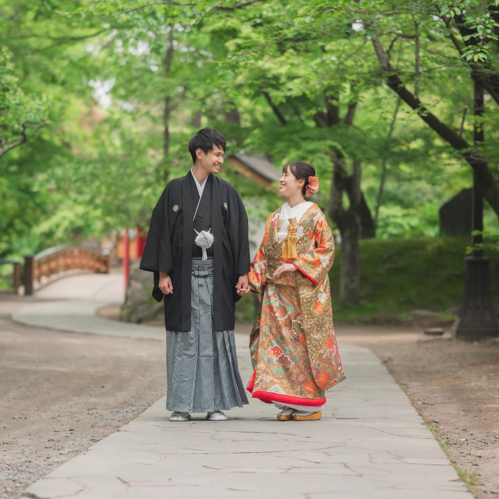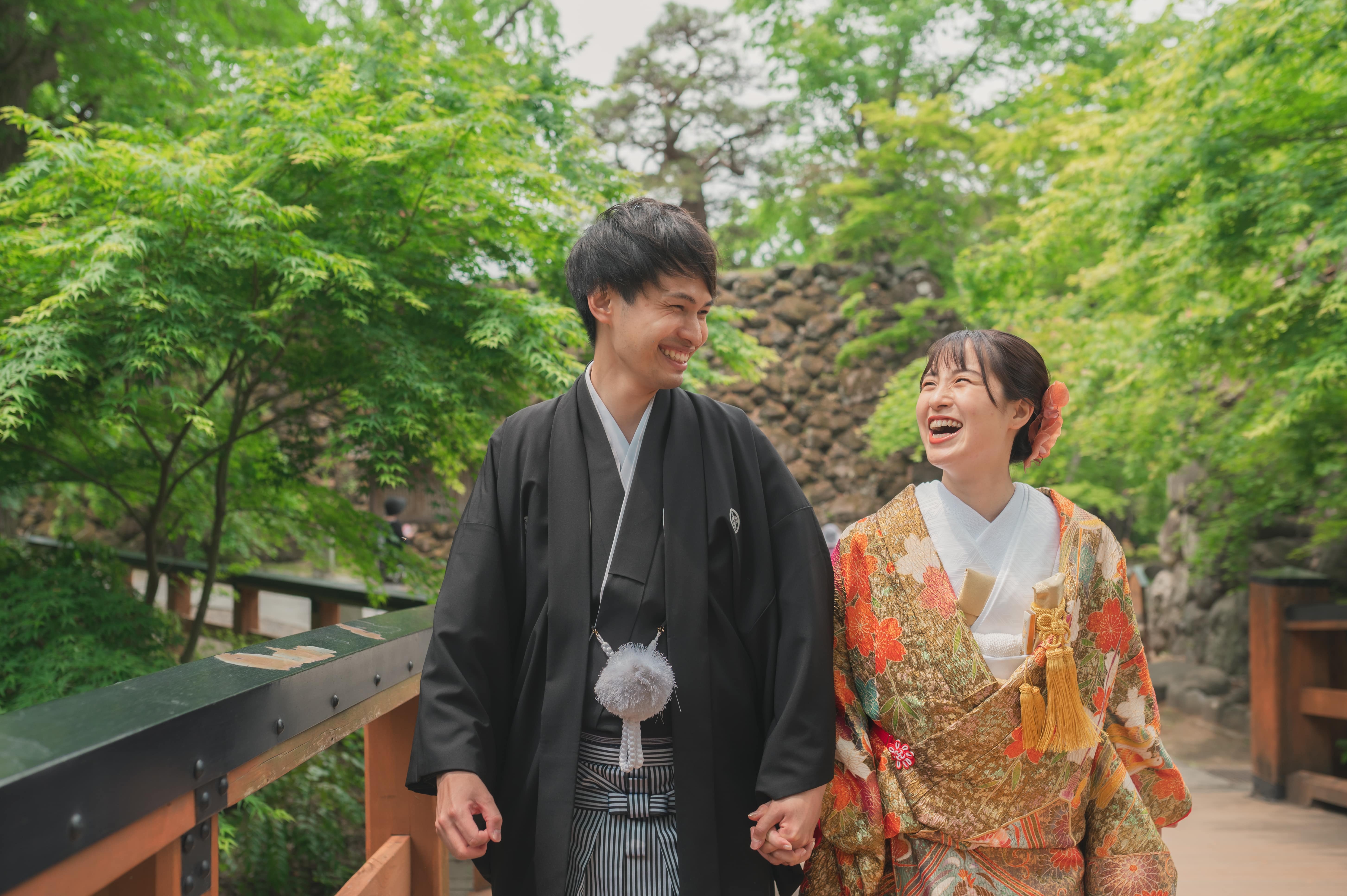 撮影を行った日は人も少なく、私たちにとって非常に撮影しやすい環境でした。静けさの中にお二人の笑顔が一層際立ち、和装の美しさが際立ちます。また、和傘を使用してのショットも撮影し、和装の雰囲気をより一層引き立てました。