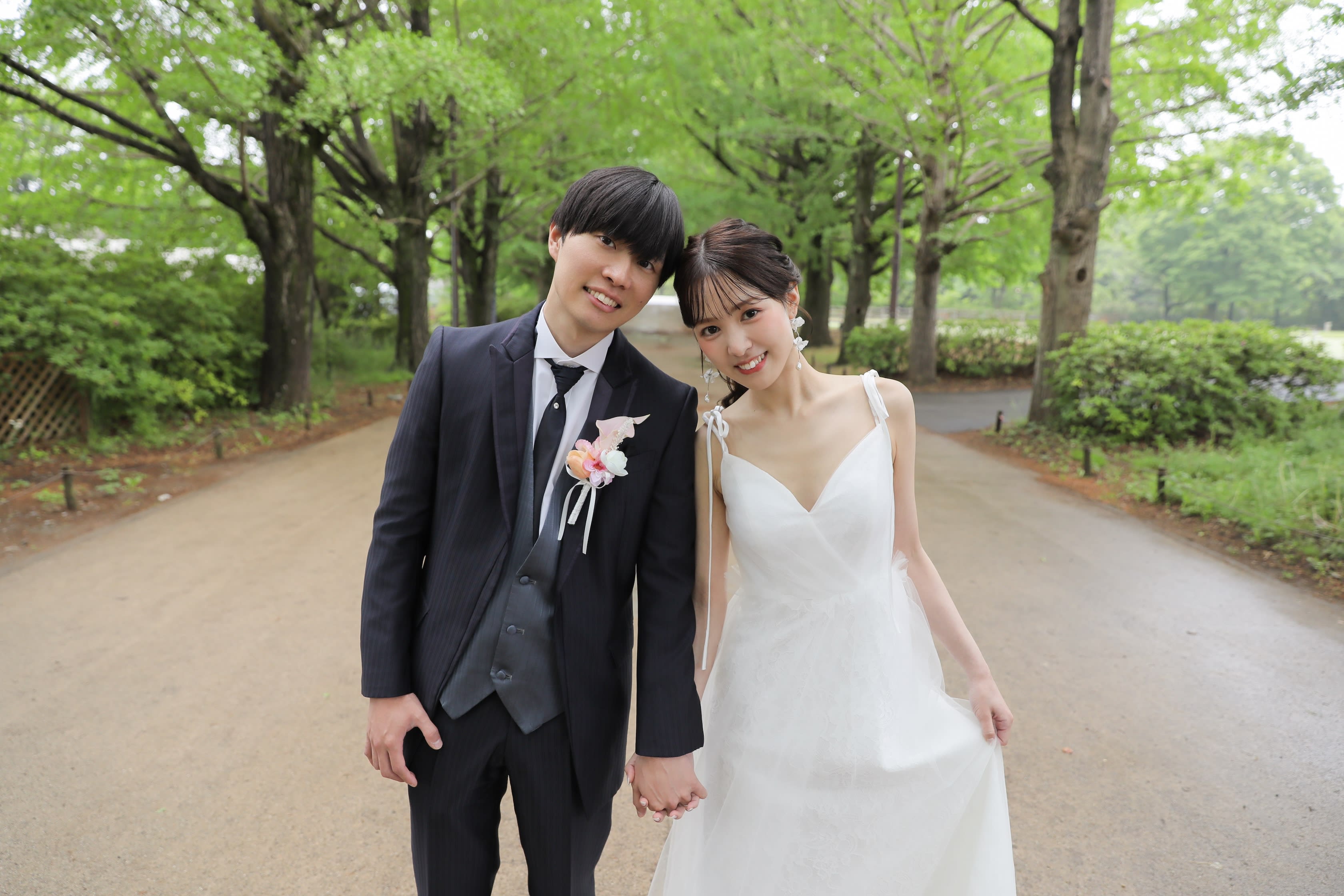 結びに私服フォトでピースをしていただきました!洋装だけでなく私服でもお写真を撮ることができます!楽しい撮影ありがとうございました!末長くお幸せに!!