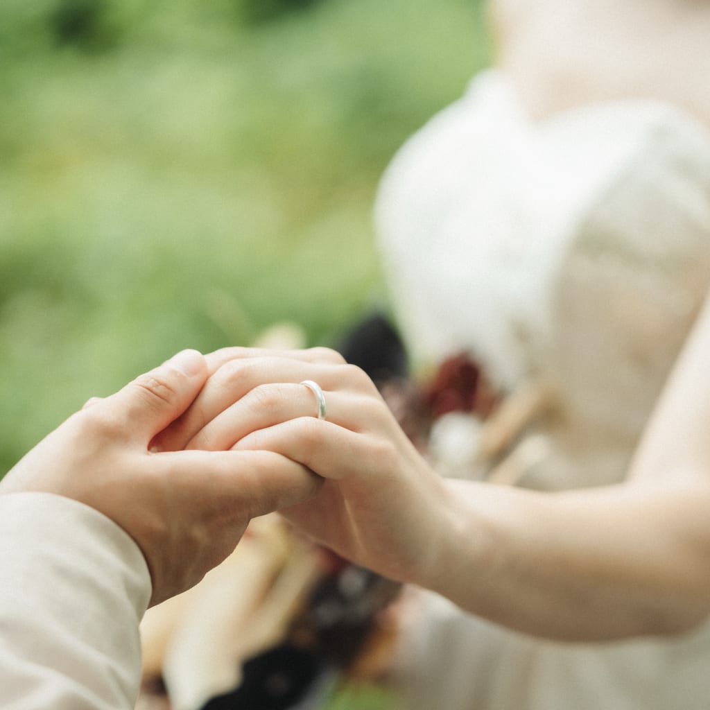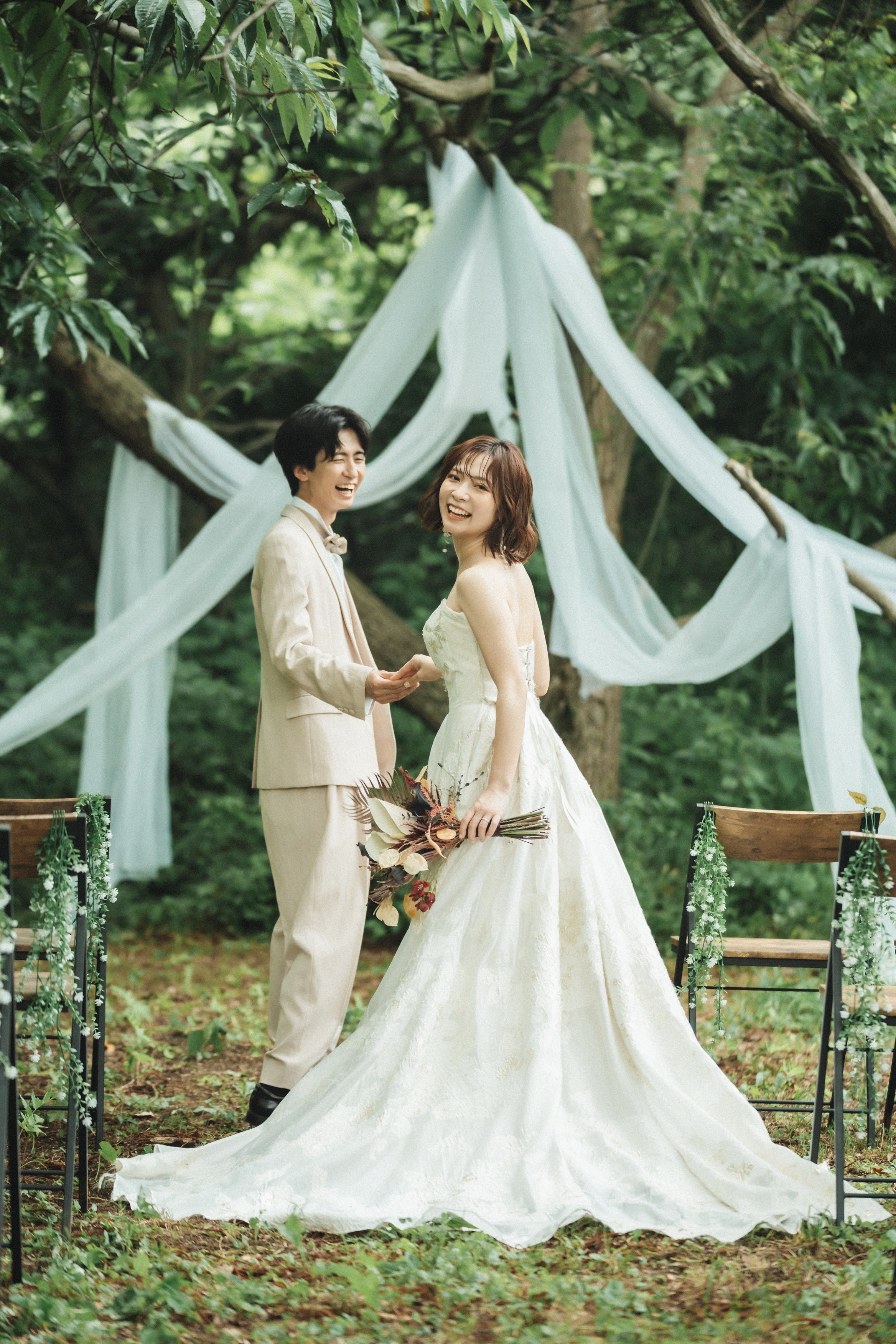 新婦様をエスコート!見つめる視線が柔らかく緑の雰囲気と合いますね!