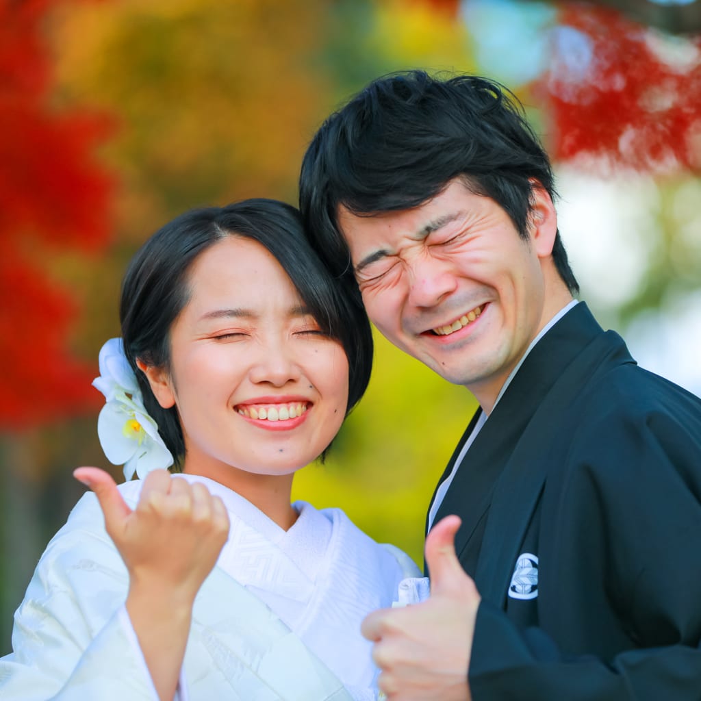 彩り豊かな紅葉は京都らしく、和装がとても似合う景観です。お二人の楽しそうな笑顔も鮮やかなウェディングフォトです。