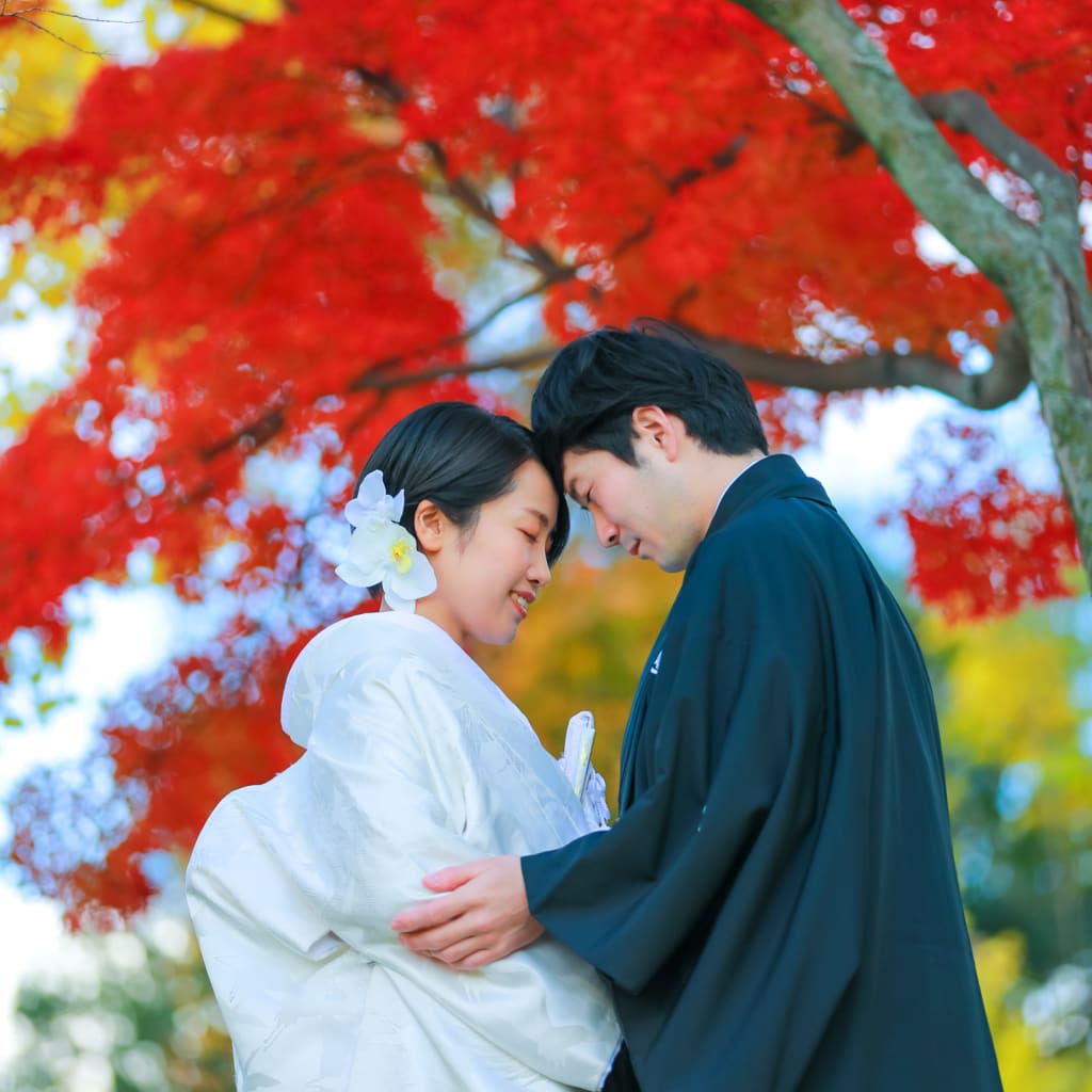 桜の紅葉も暖かい色合いが、和装フォトウェディングにぴったりです。
