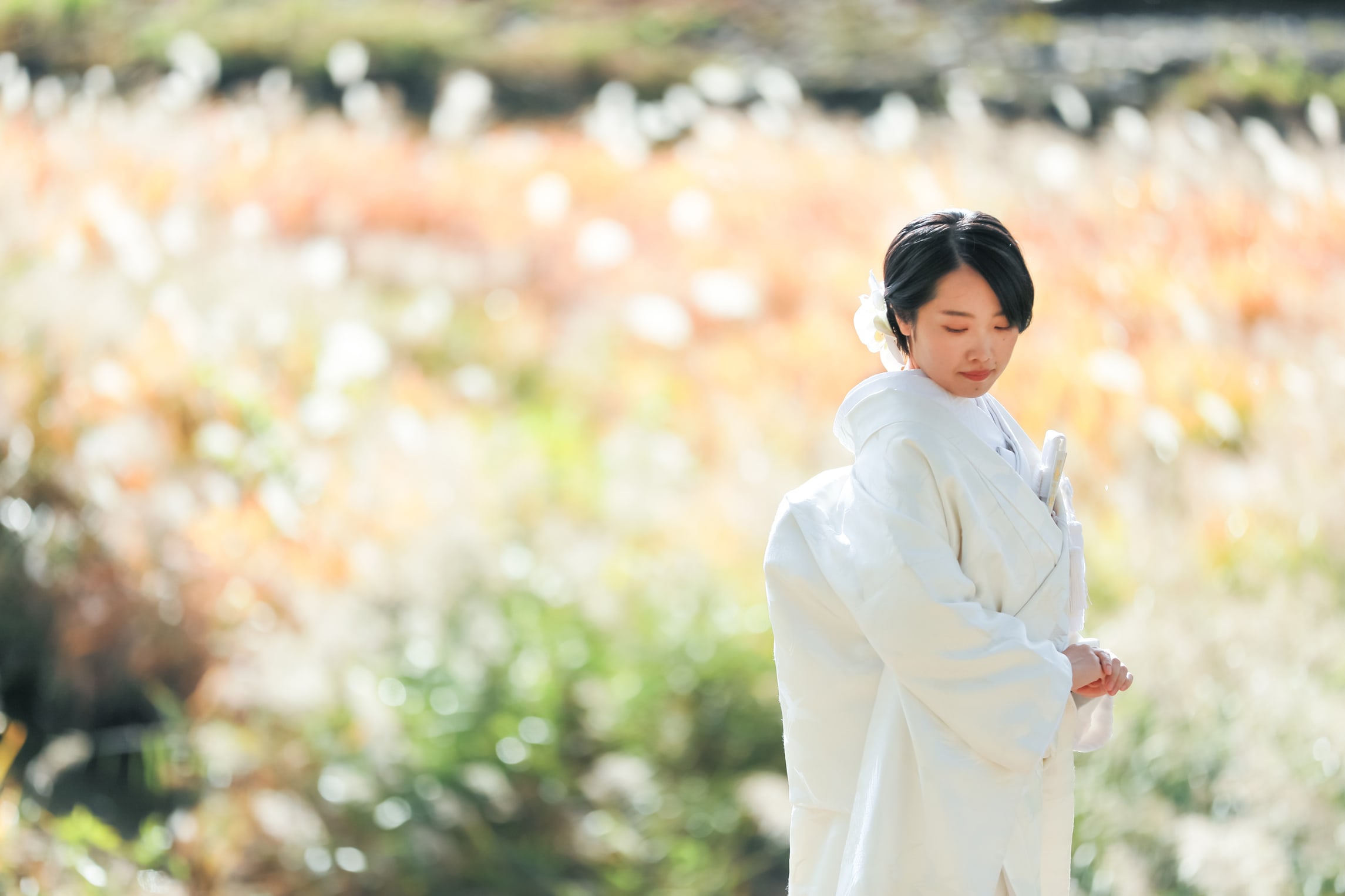 お気に入りの白無垢でのフォトウェディングです。京都の鴨川は秋には紅葉がたくさんあるので、おすすめのロケスポットです。