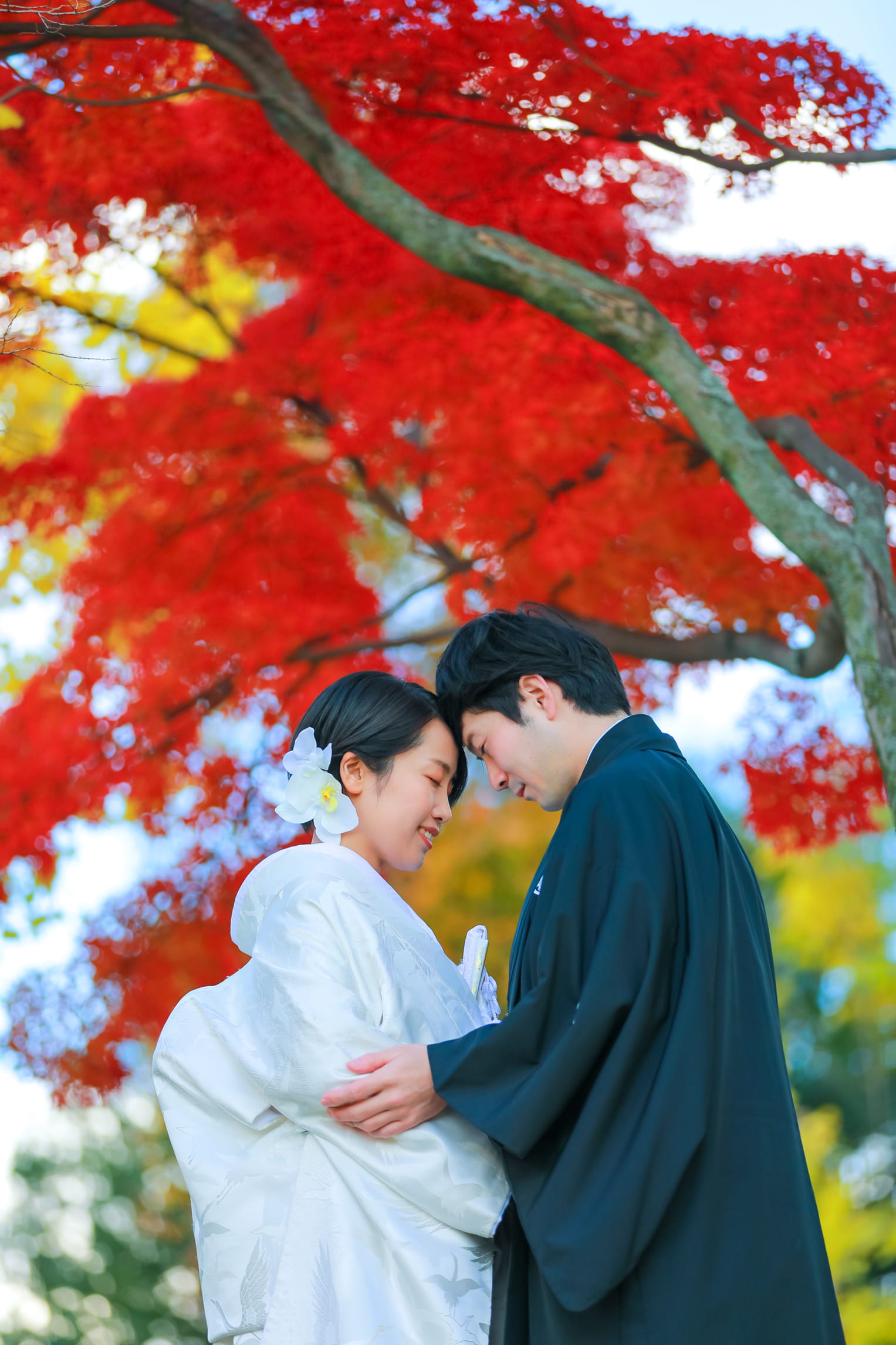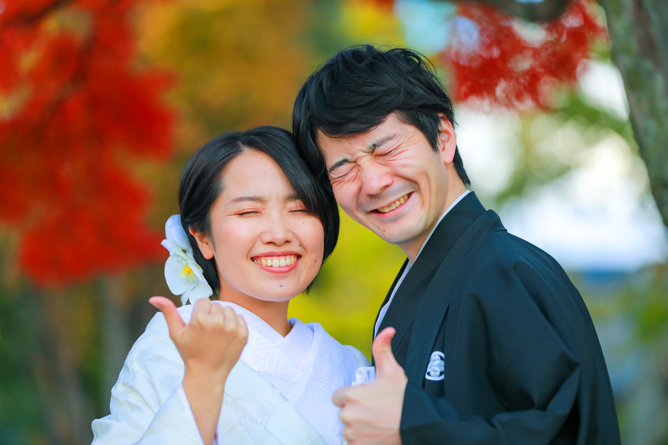 黒紋服と紅葉のコントラストがきれいななかで、ご新郎様の笑顔にご新婦様も喜んでいただけました。