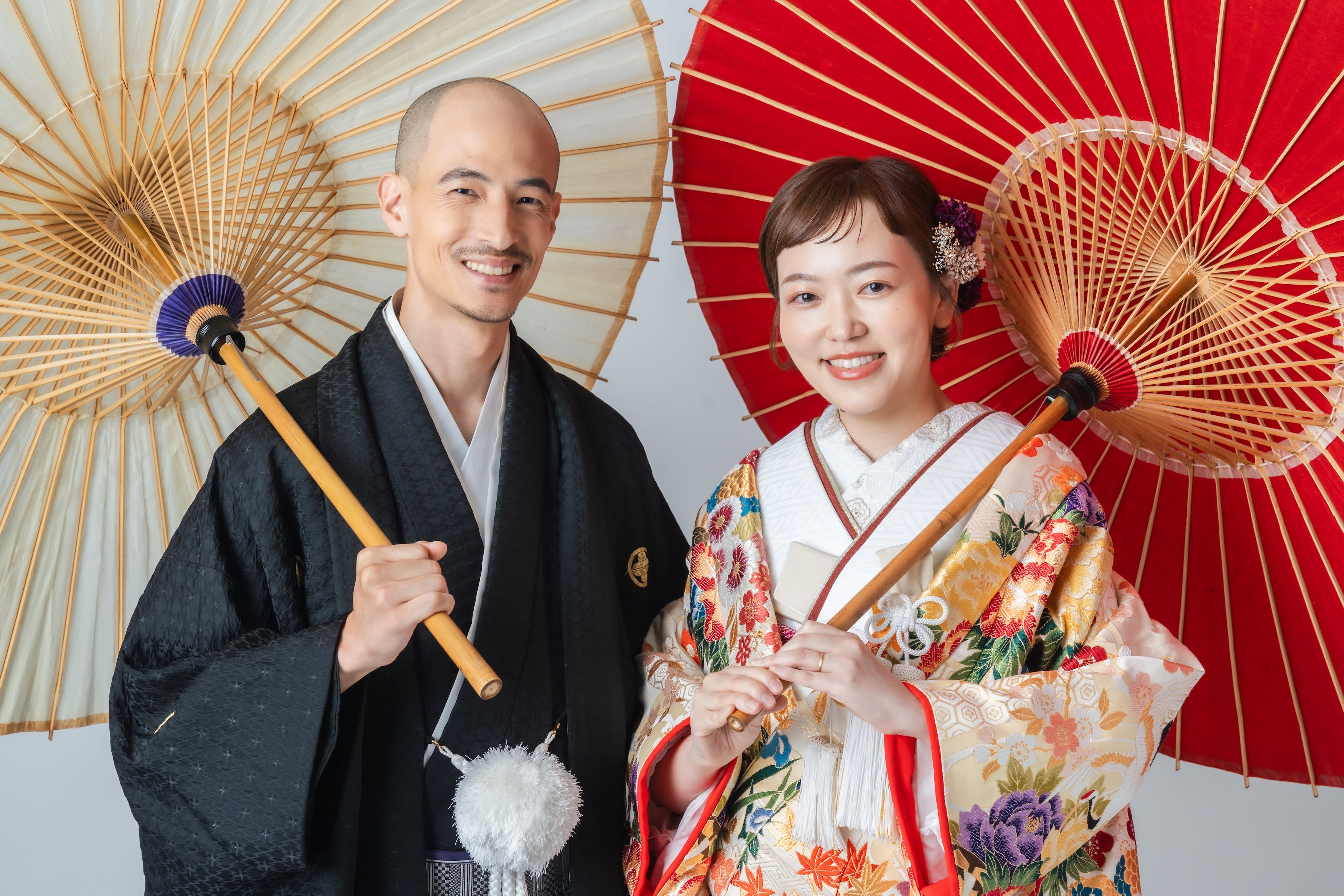 新婦様と和傘の2ショット?黄色ベースのお着物と赤の和傘の組み合わせとても素敵です!