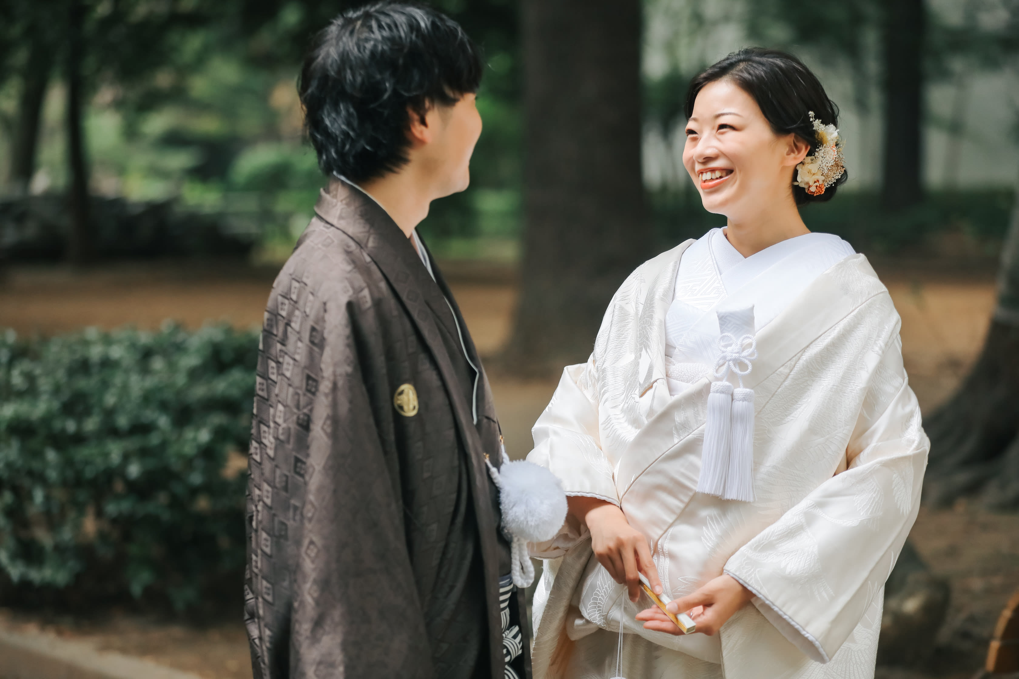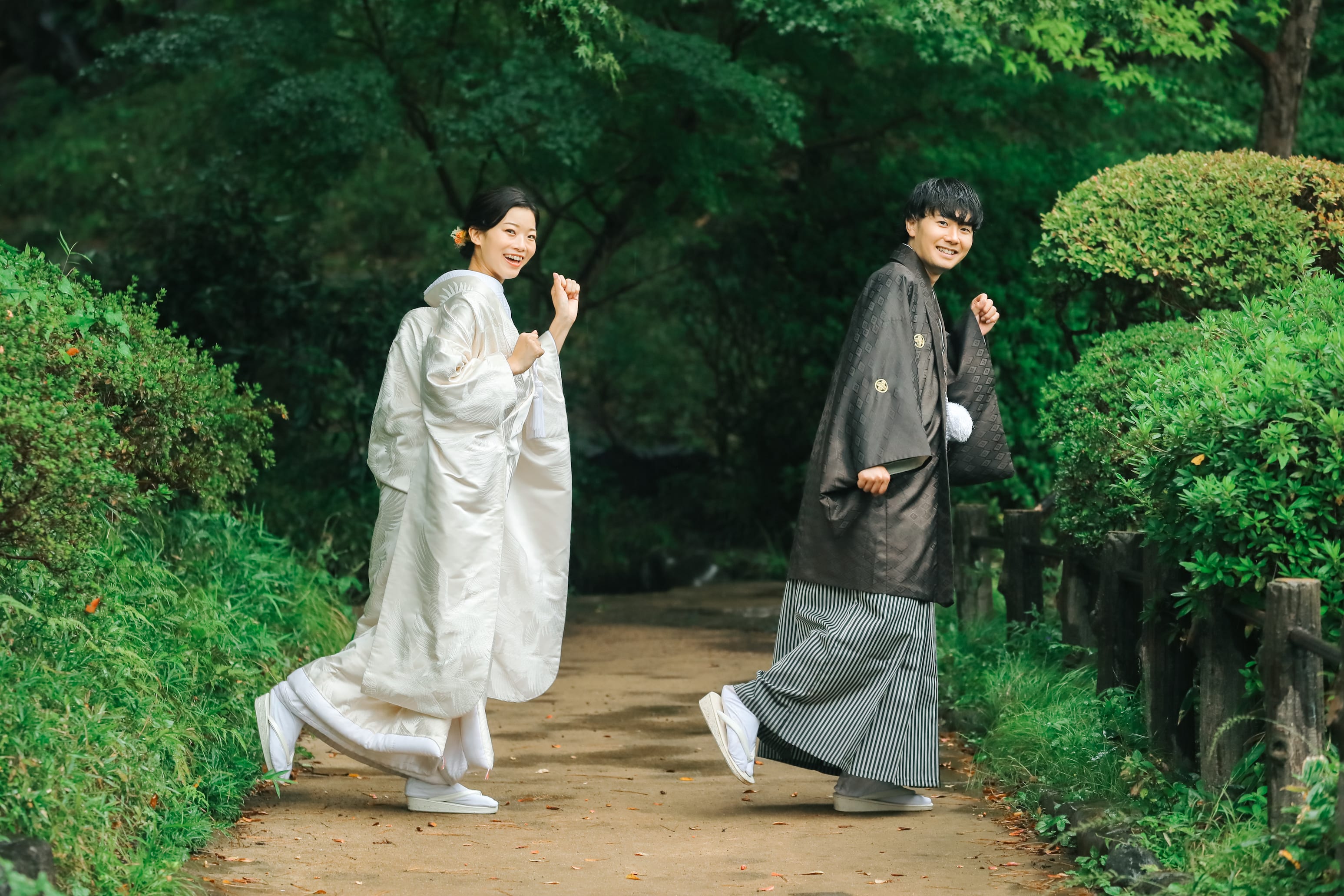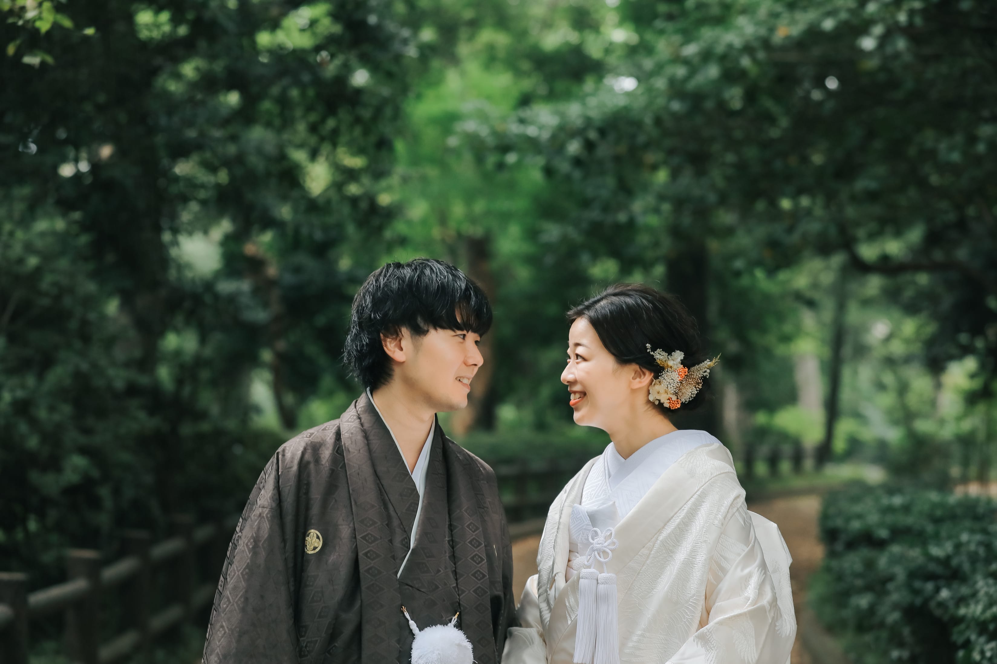 小雨が降っていましたが、番傘を差せばなんのその!むしろ傘を持って、雰囲気のいい写真になりました♡ご新郎様の指差しのアドリブが良い味を出してますね!