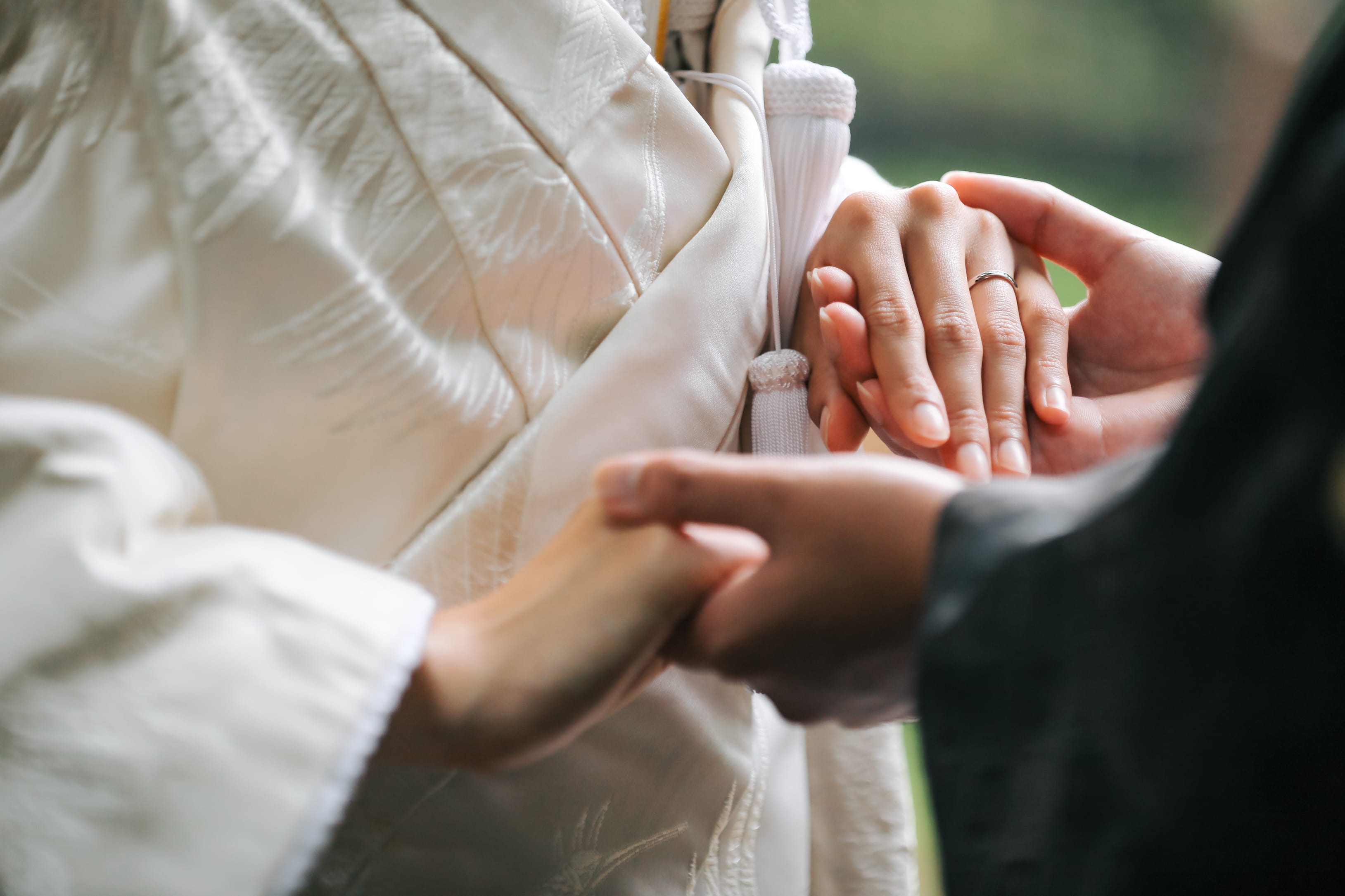 しっとりとした雨の中、手を取り合うお二人の手元には、キラリと指輪が光っていました。