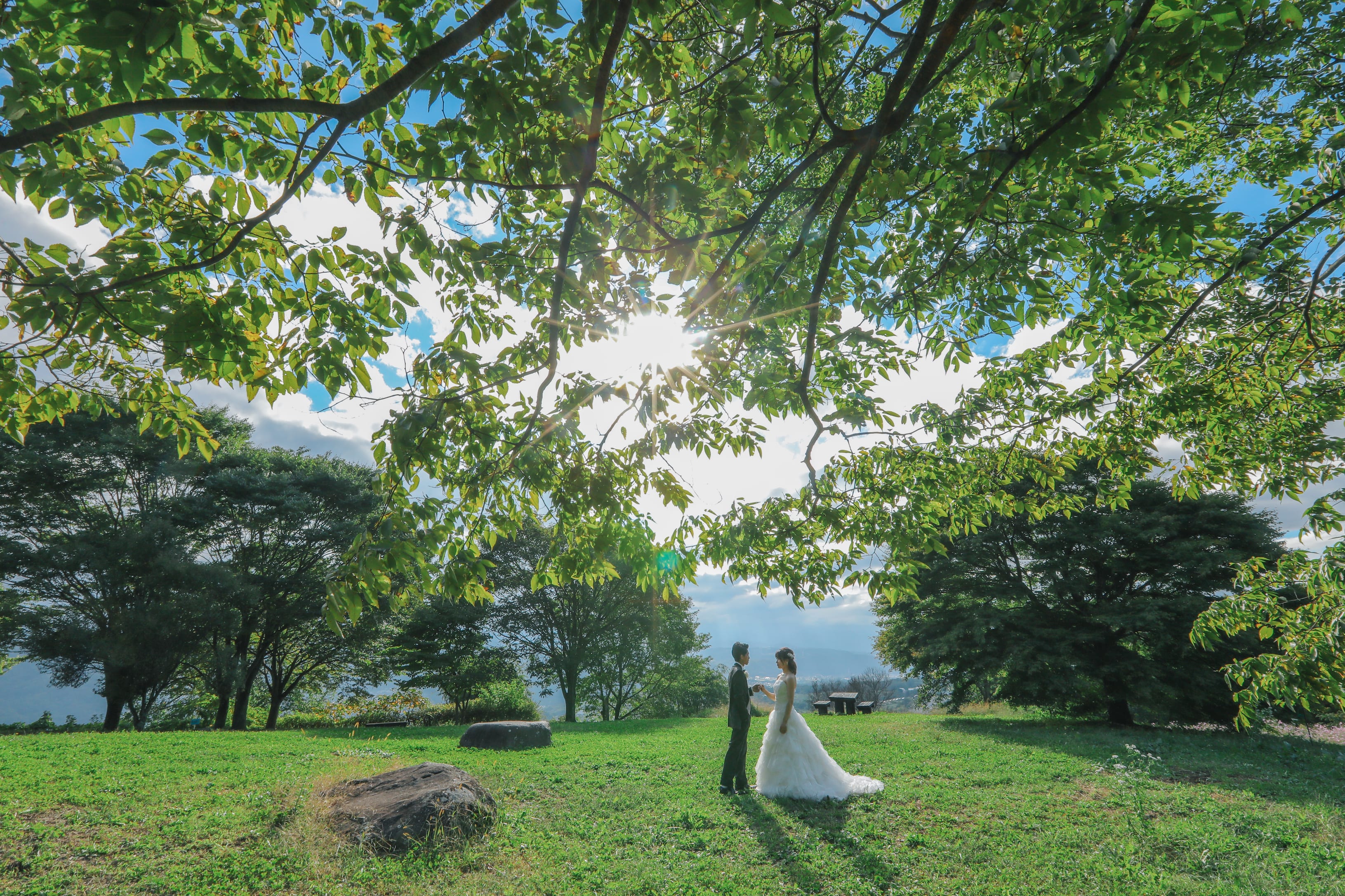 飯綱山公園では、少しずつ秋色が見られる季節になっていました☆ほんのり紅葉がドレスとタキシードに映えて美しいですね!