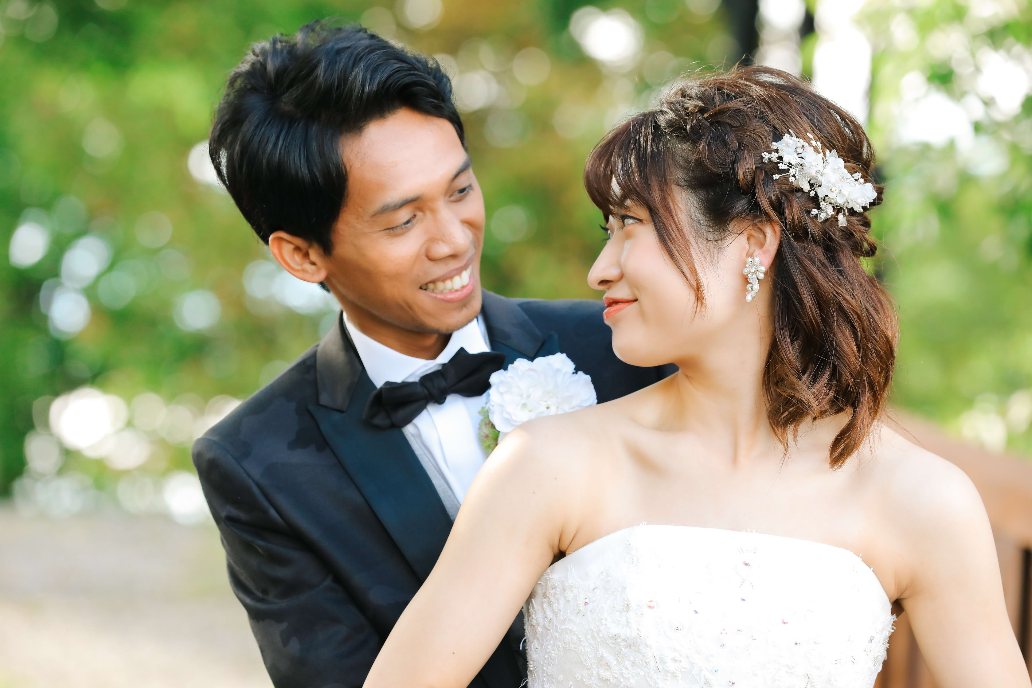 後ろからご新郎様にハグをしてもらい、ご新婦様が振り返ると思わずにっこり♡可愛いです♡