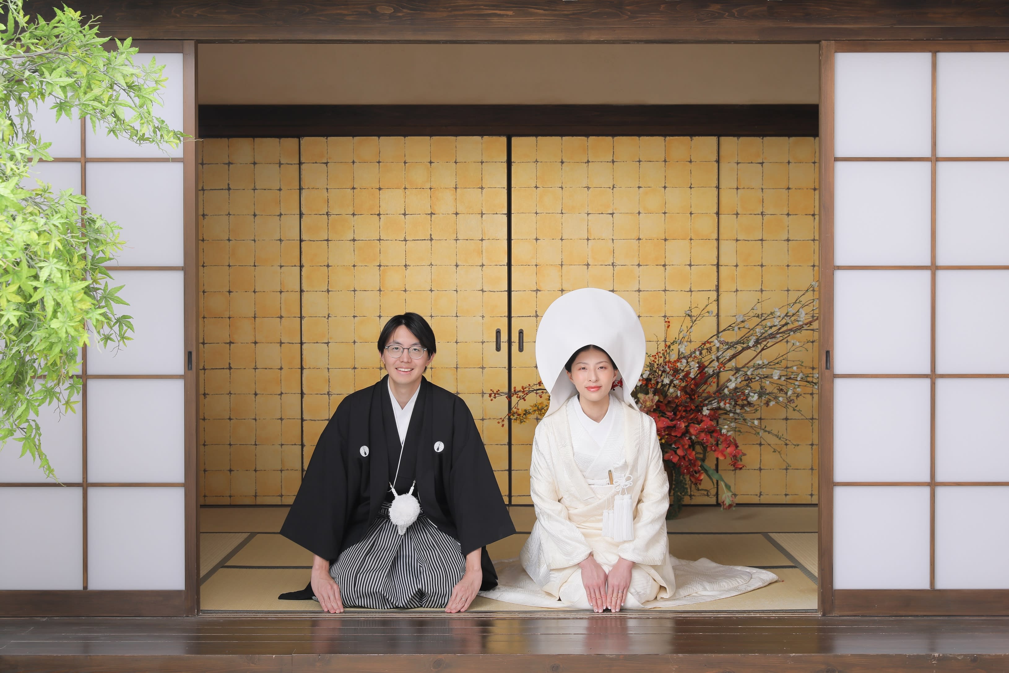 屋内庭園に移動して和装の撮影スタートです!椿の花と白無垢の組み合わせがgoodです!