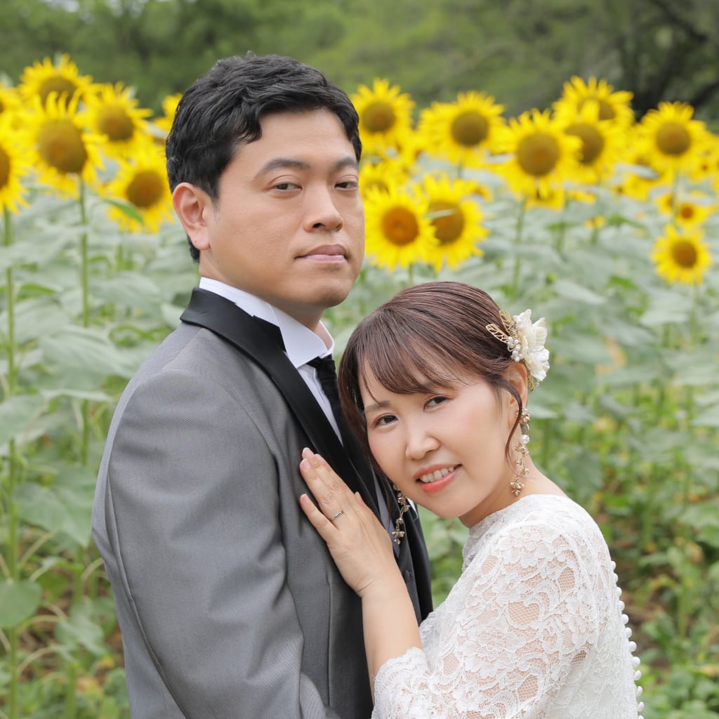 ひまわりに向かって手を重ねるお二人!お手元のお写真も綺麗に撮っていきます!