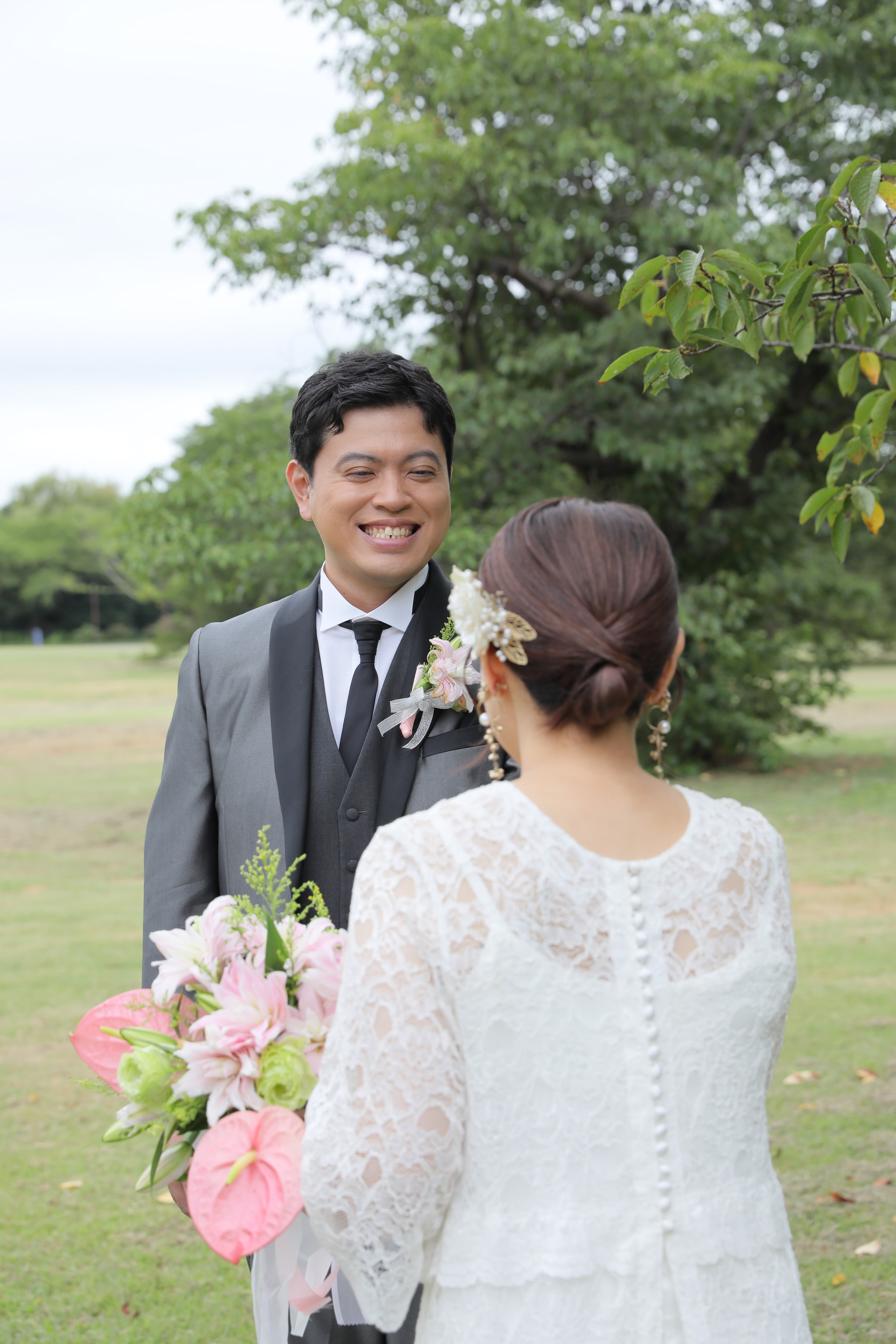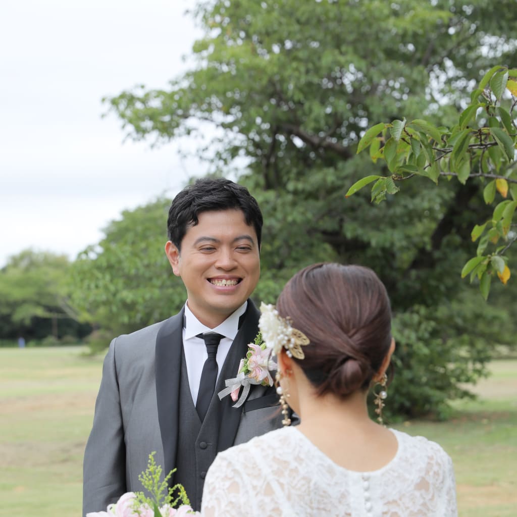 後ろからぎゅっと近づく新婦様!その姿を見つめる新郎様の優しい眼差しが素敵ですね!