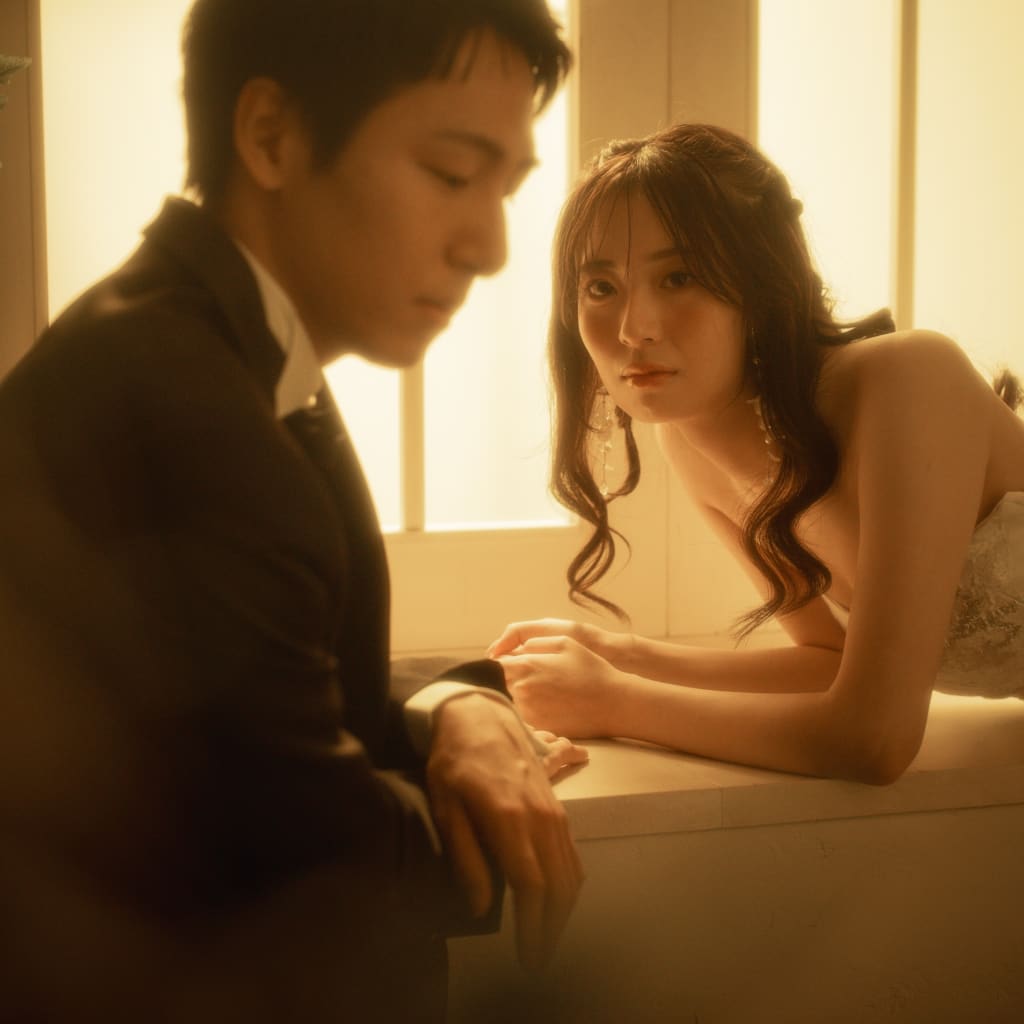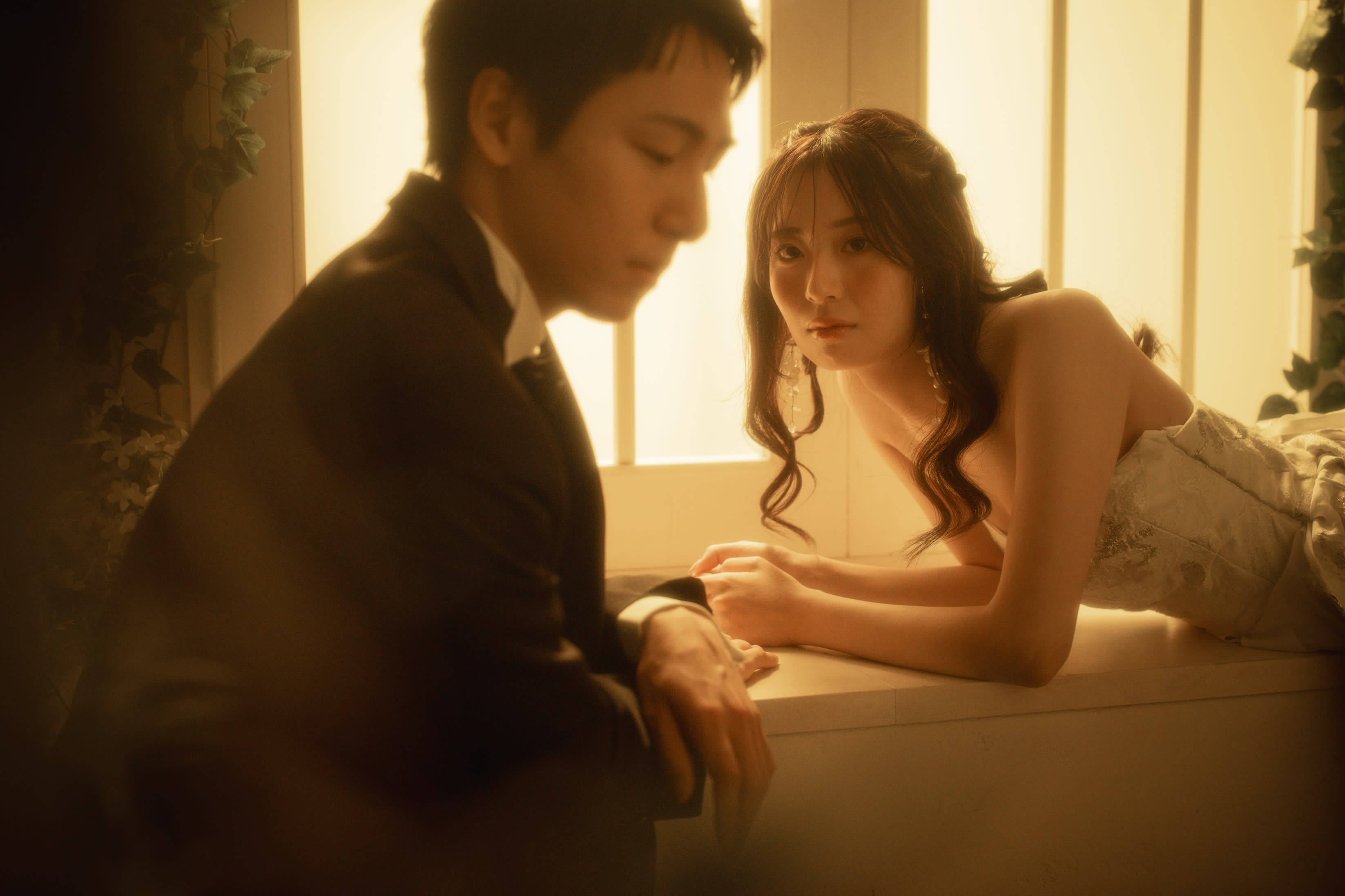 優しく差し込む夕日をバックにベールを被り寄り添うお二人!