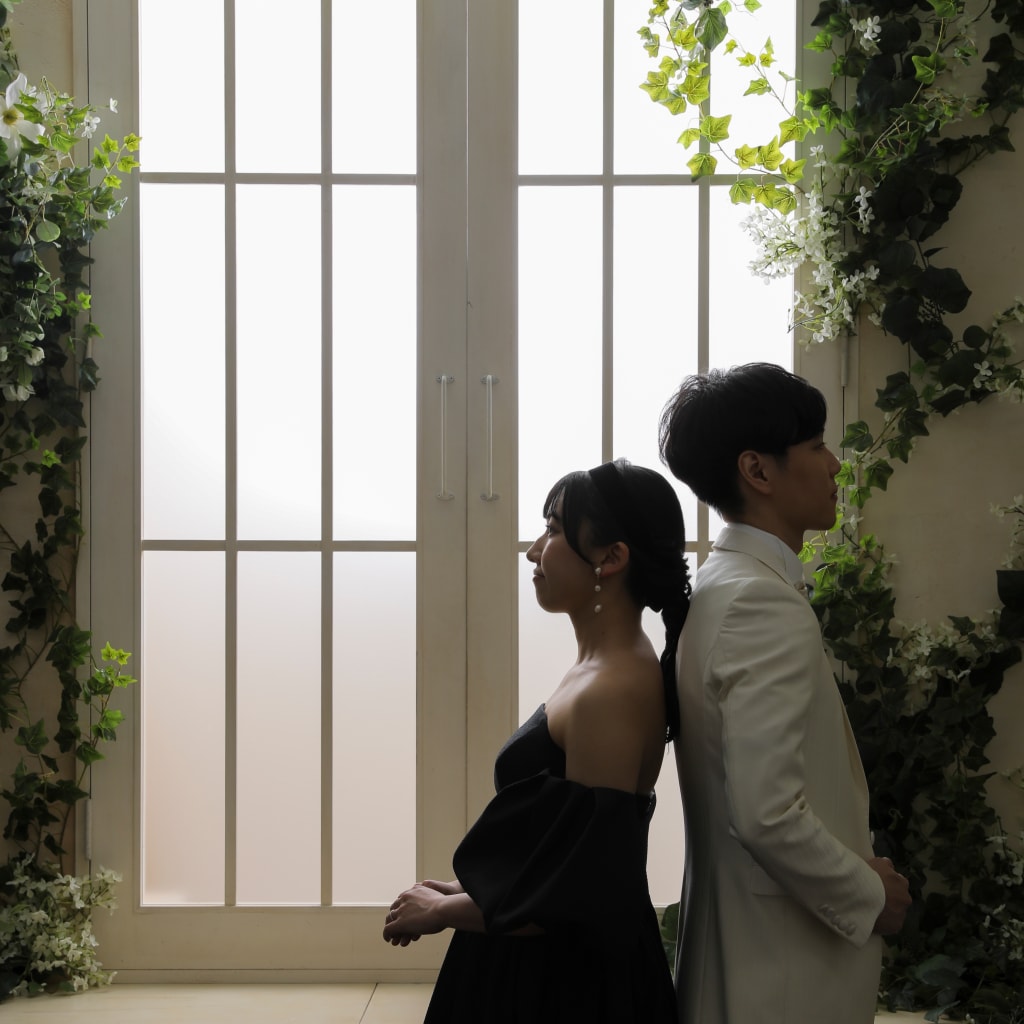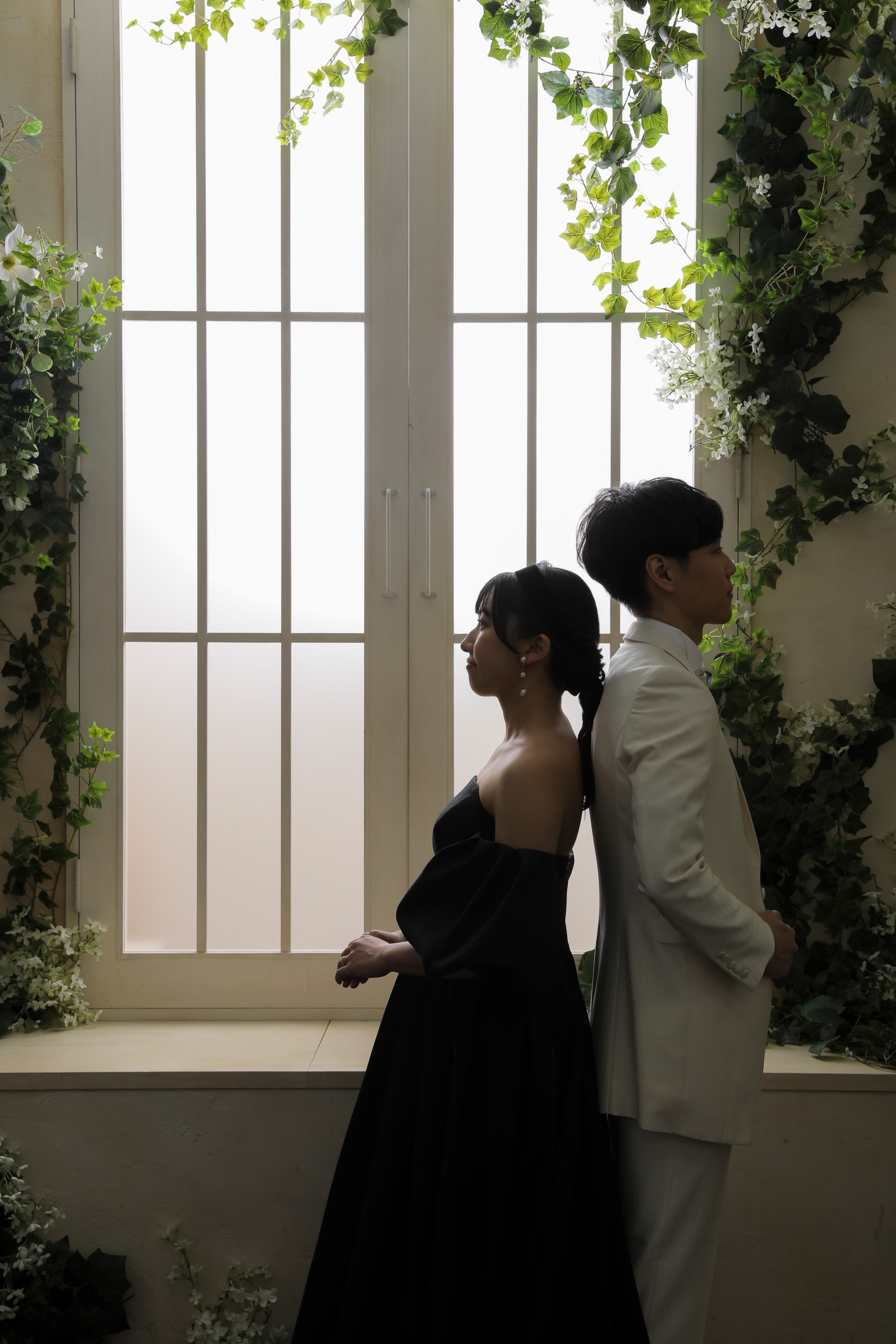 ボタニカルな窓辺で手を取り合い見つめ合うお二人!新婦様のキラキラの笑顔が素敵です!