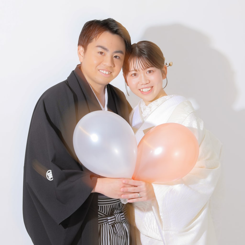 紙風船を膨らませてお顔隠し!!白背景に差し色も可愛いです!! 楽しい撮影ありがとうございました!!末長くお幸せに!!