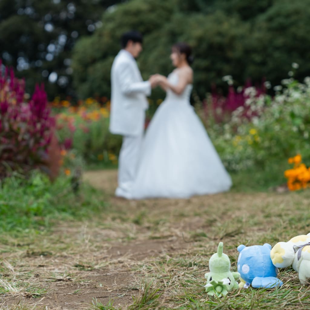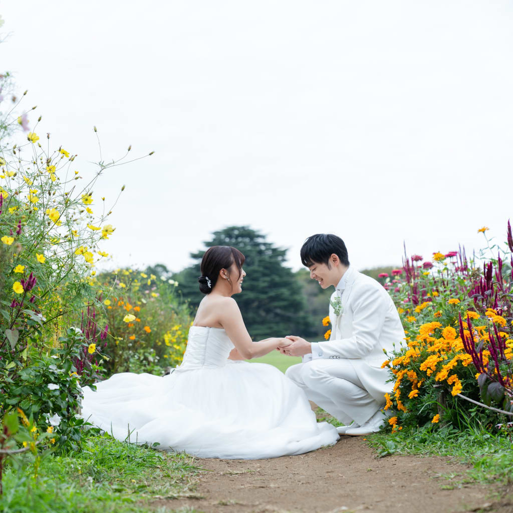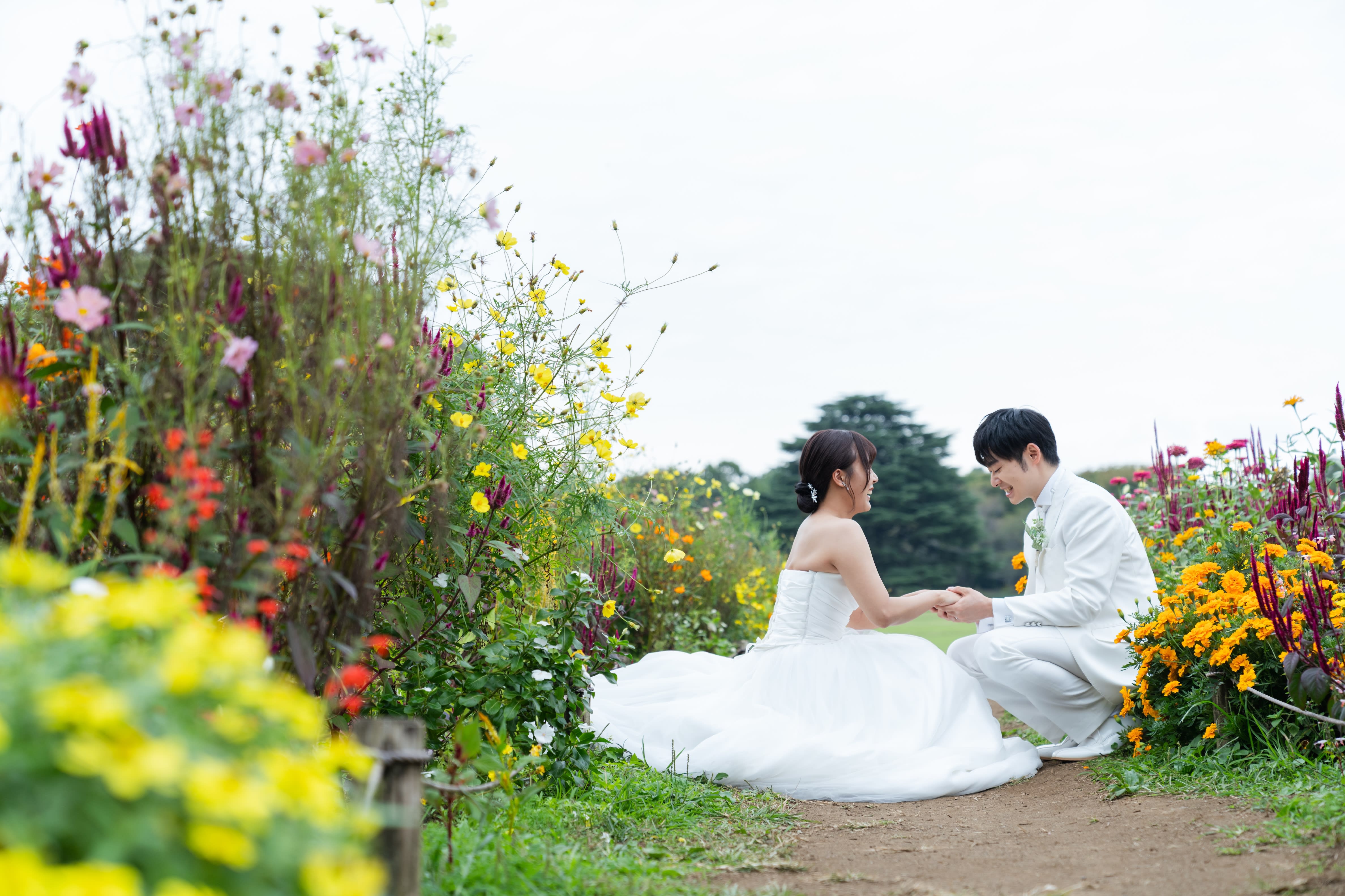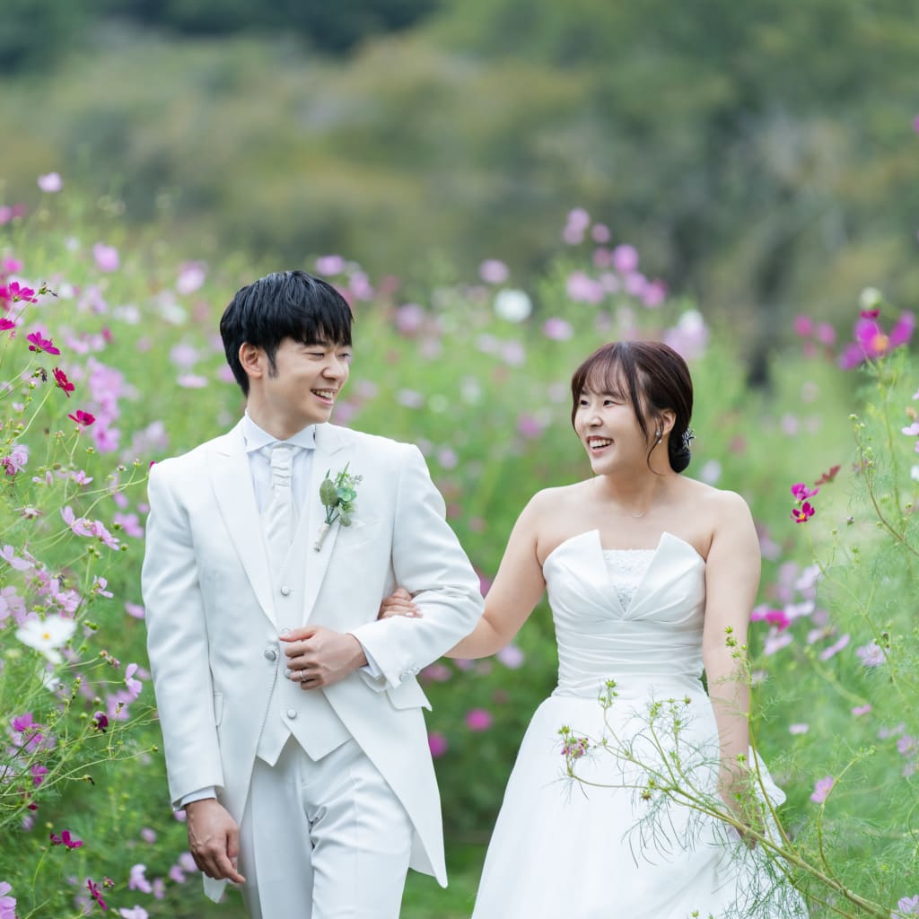 たくさんのコスモスに包まれてお二人が寄り添いあっている温かな1枚!