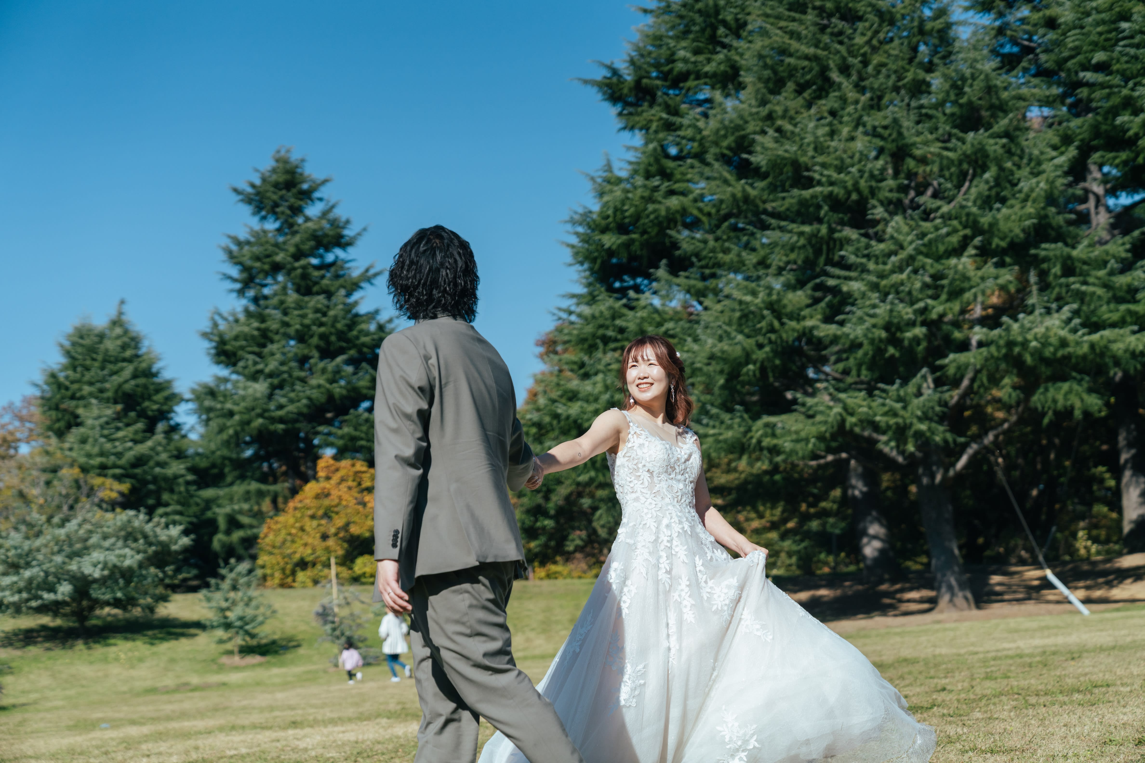 芝生のエリアでは青空もきれいに写るようにお撮りしました!ドレスの後ろ姿もとってもきれいでした!