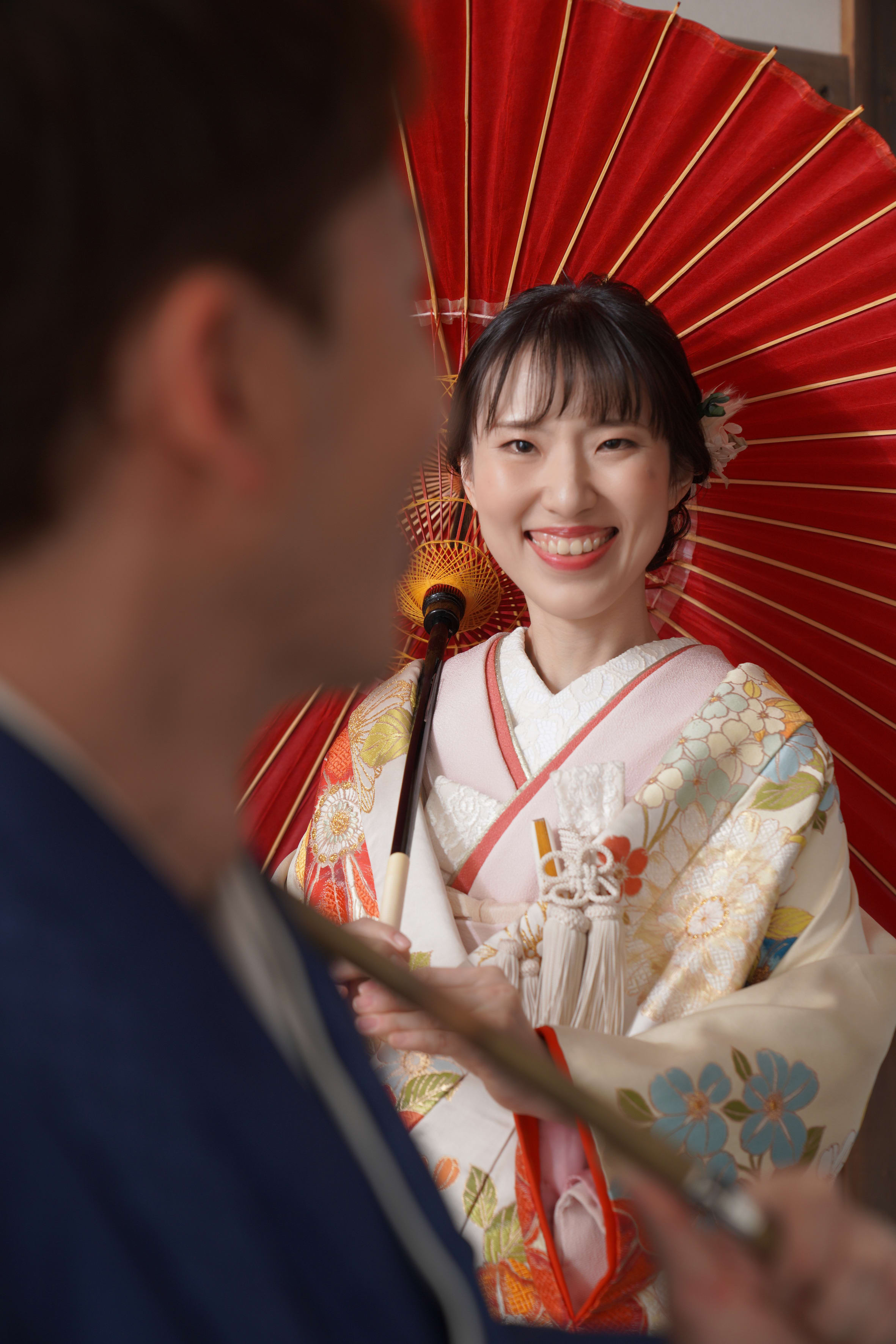 赤い番傘に新婦様の横顔がとても綺麗でした。