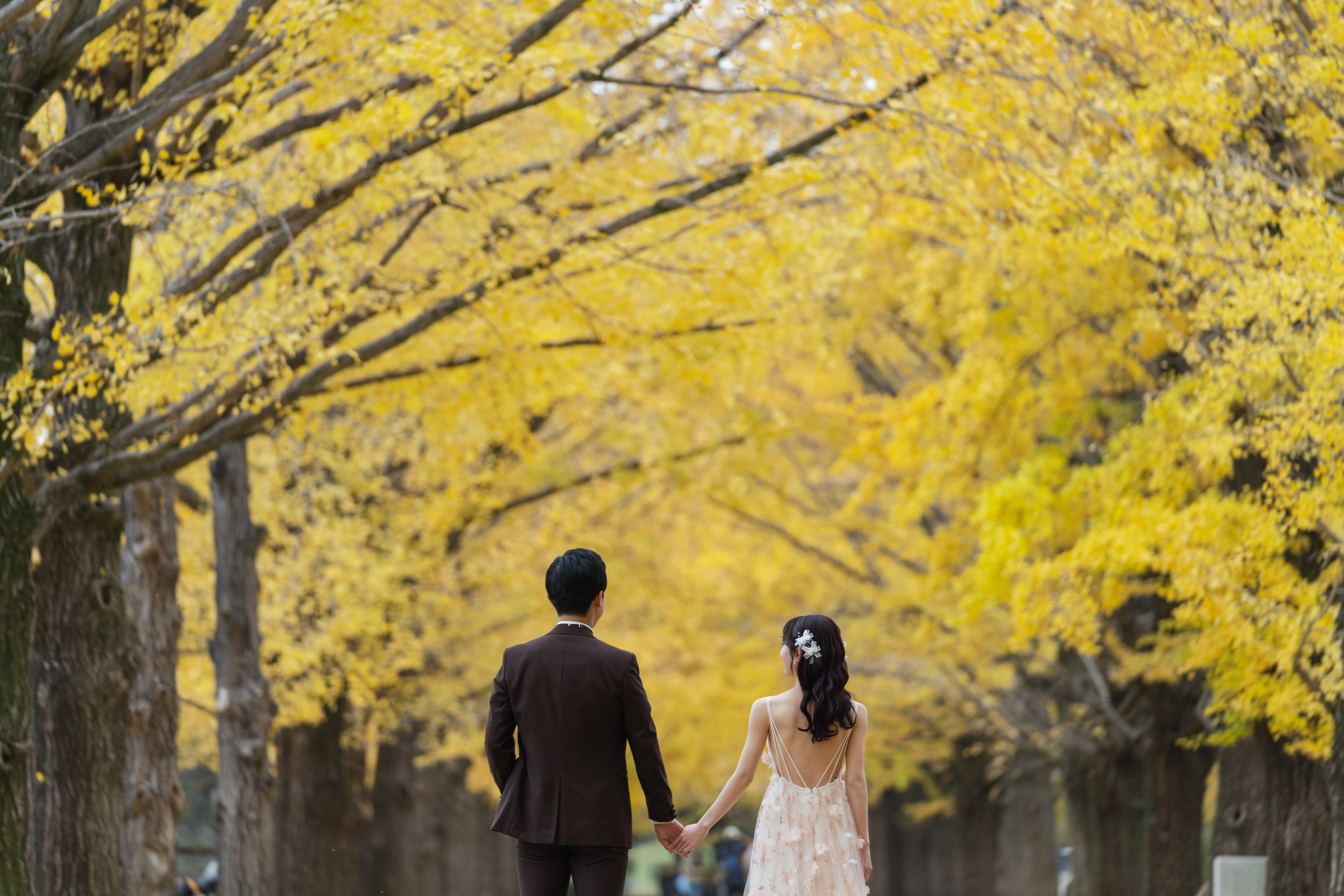 並木道を散歩するお二人。過去にも秋の時期に訪れたことがあるそうで、思い出のシーズンに撮影予約をしてくださいました^^