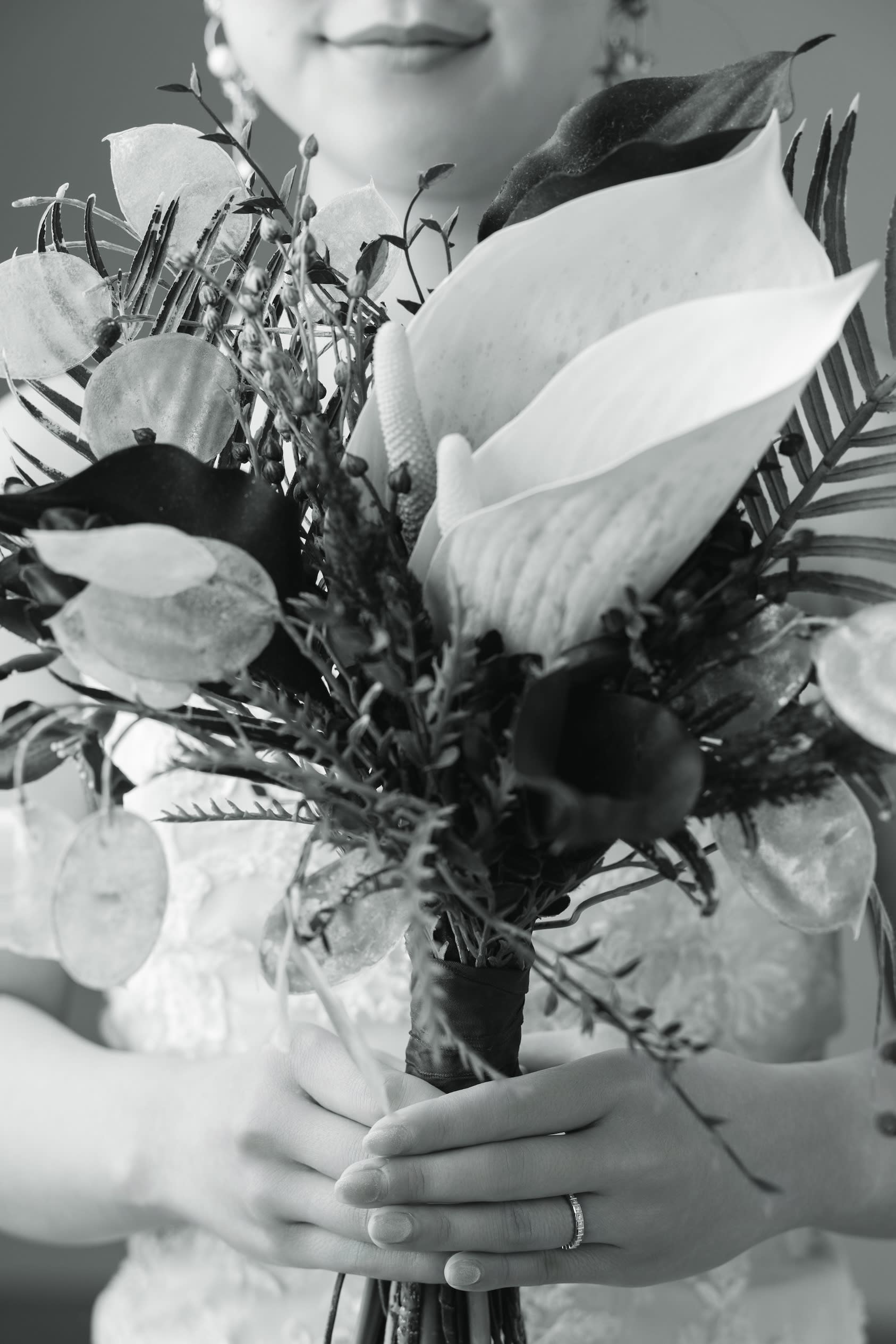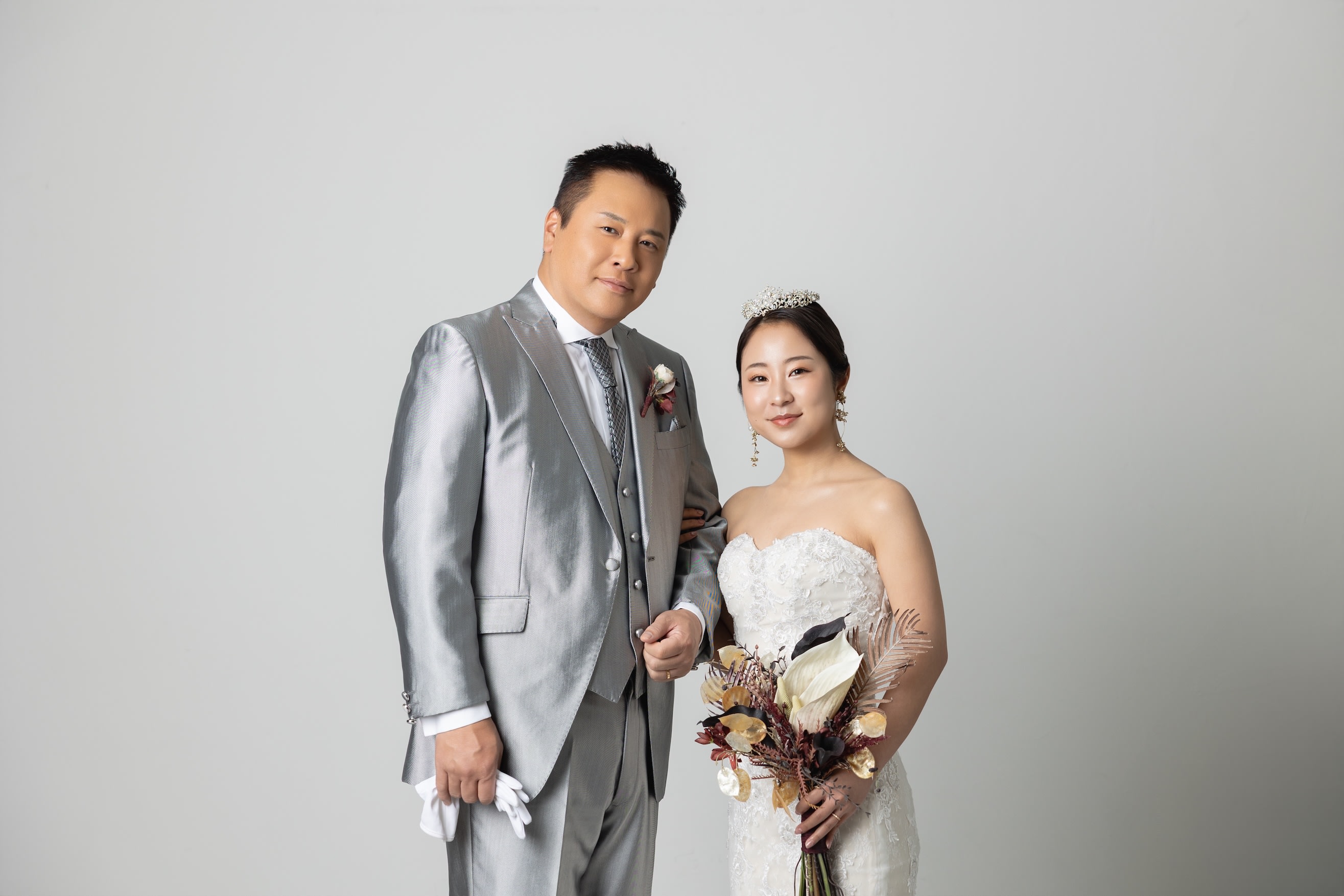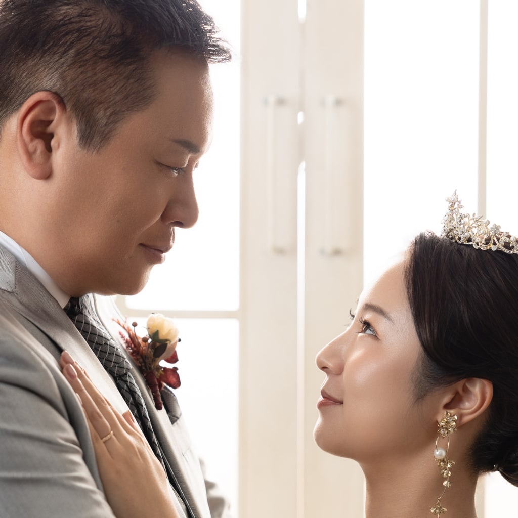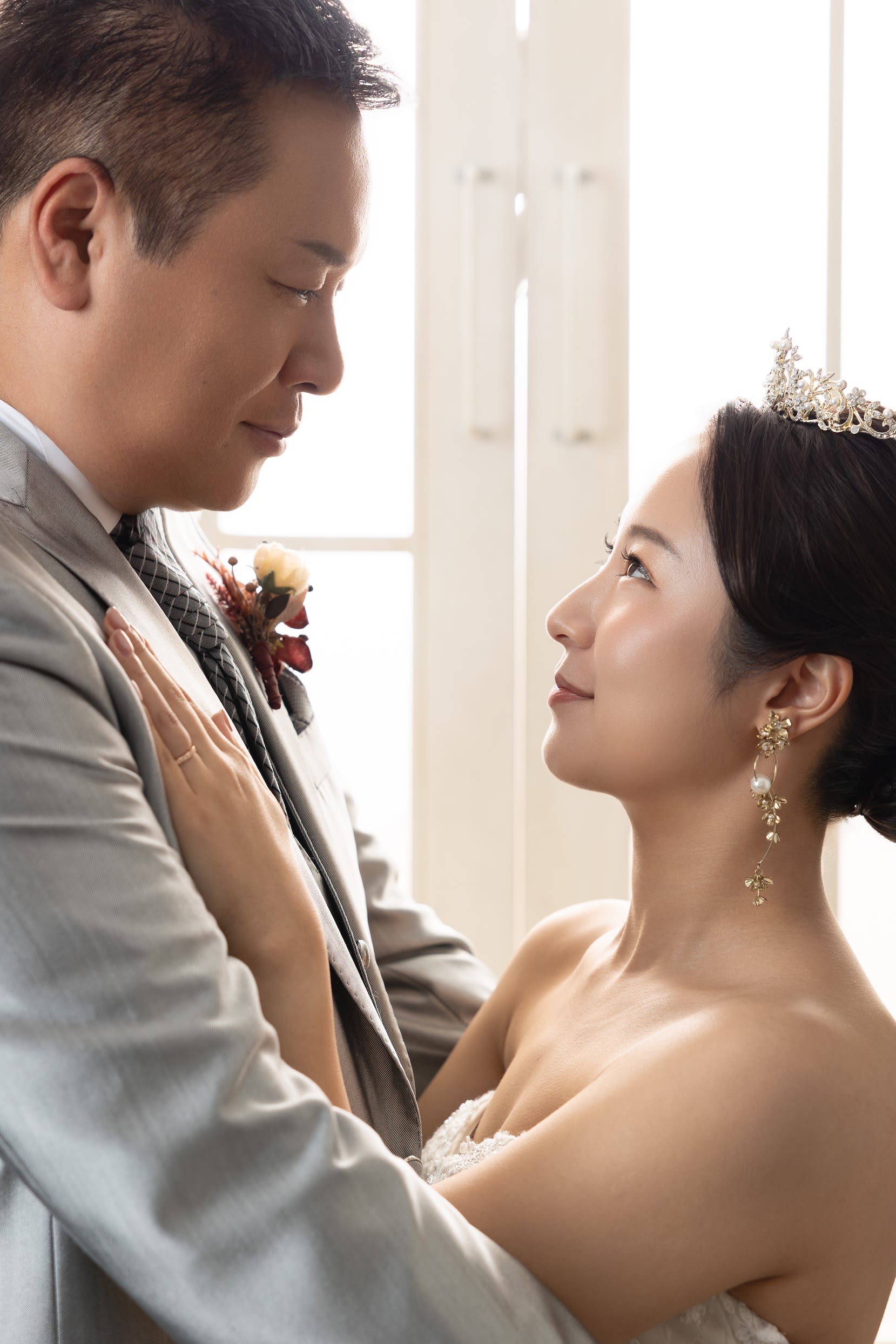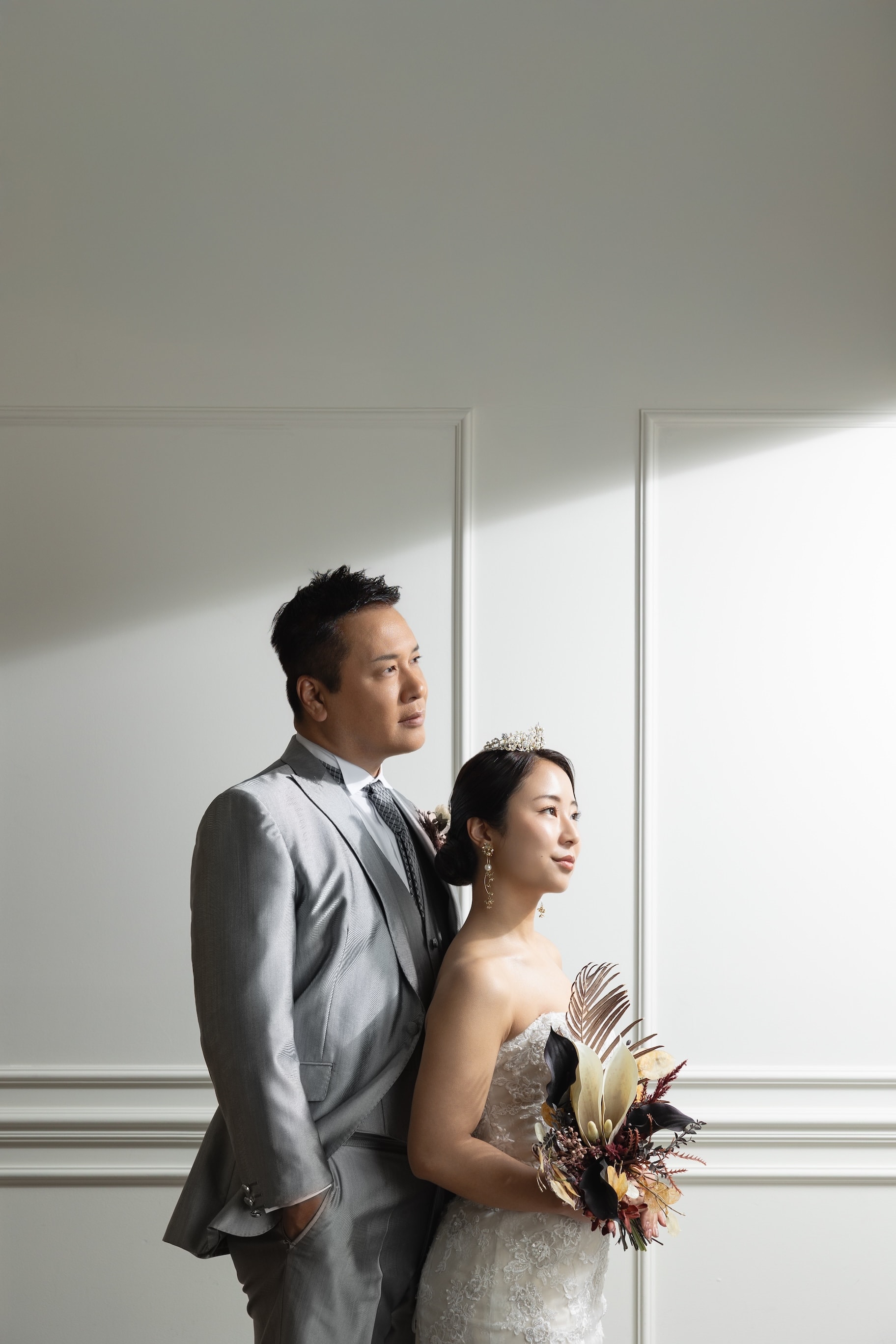 ボタニカルな窓の前で寄り添い合った写真。 ドレスの広がりもしっかりと写して。