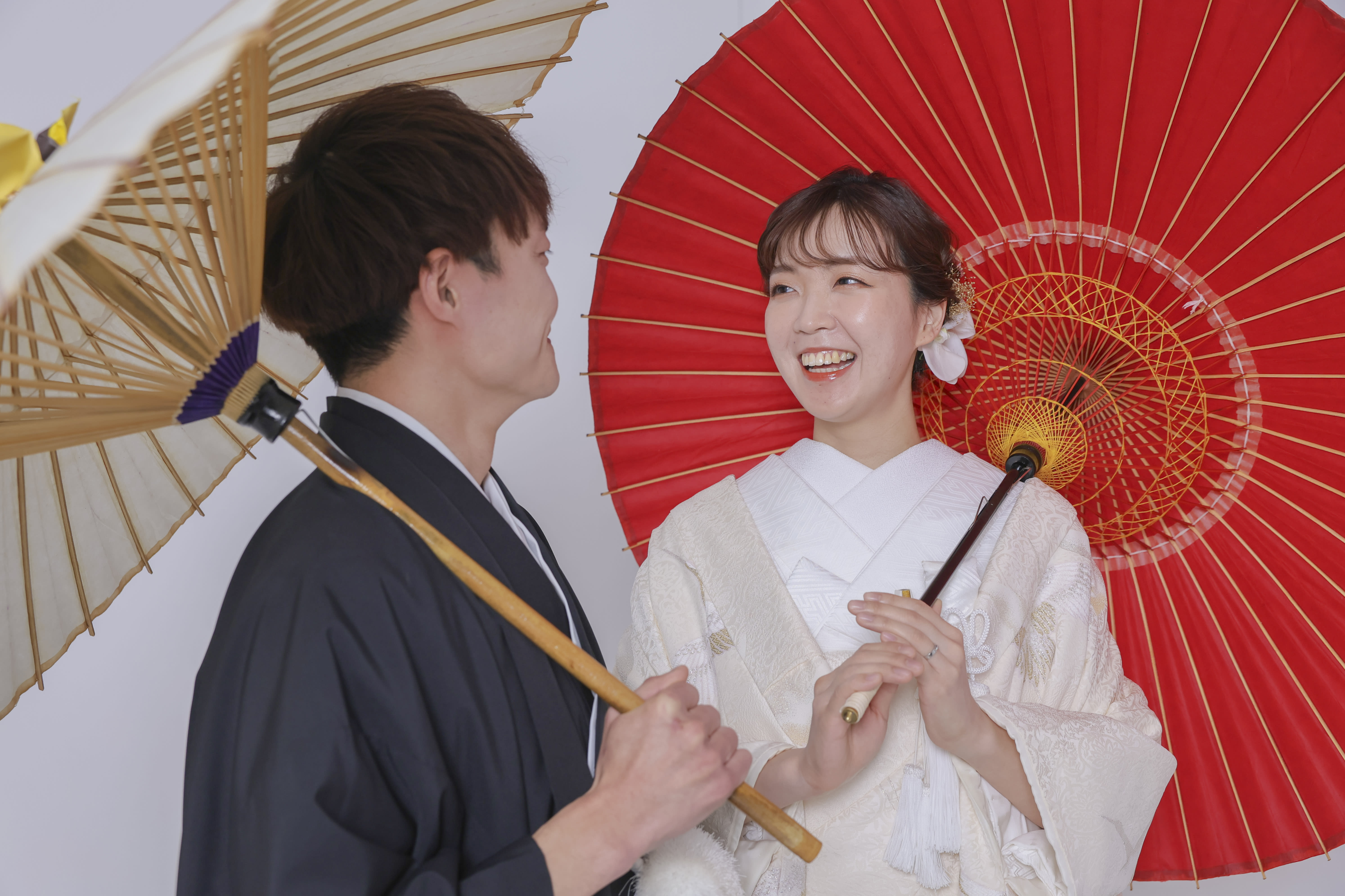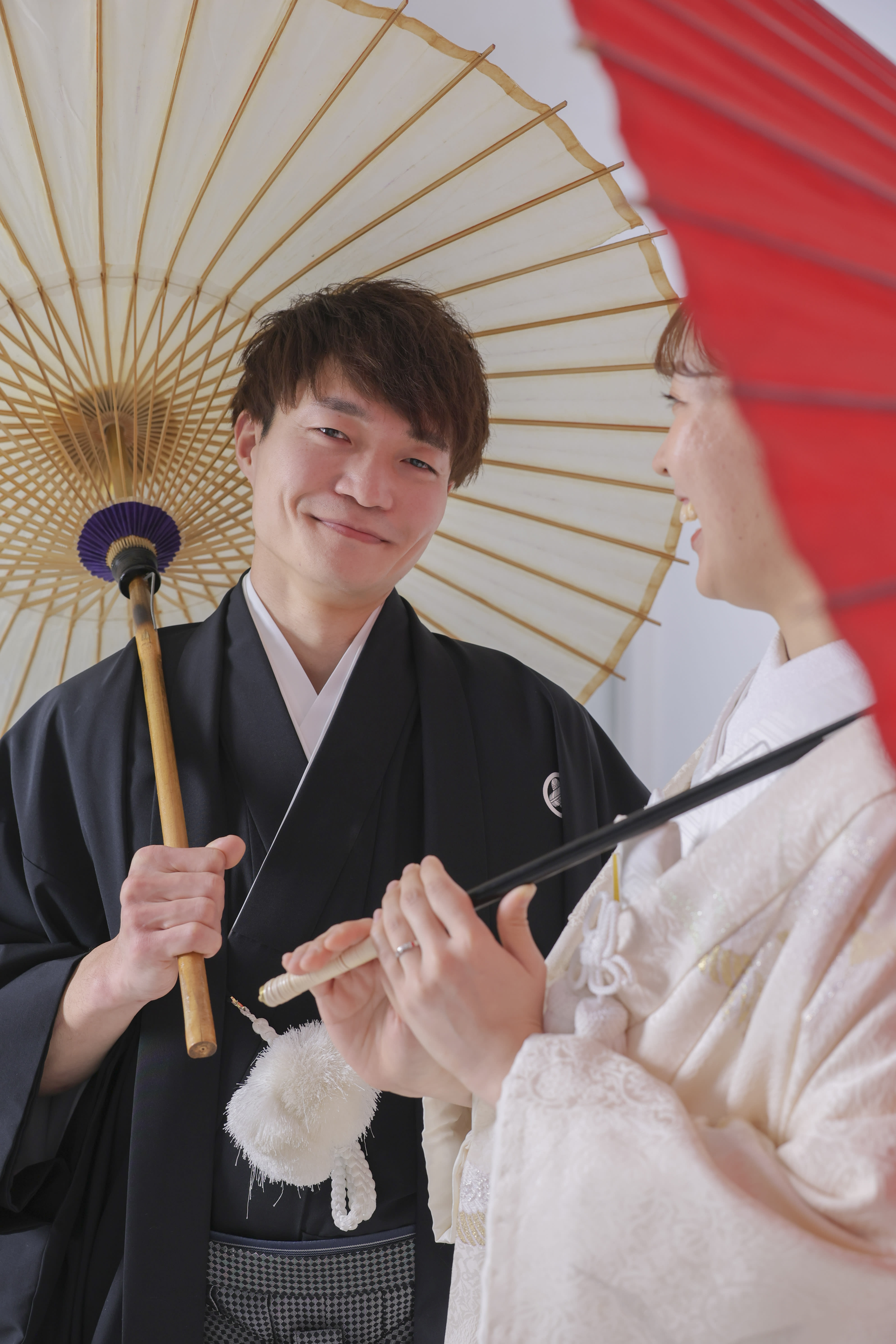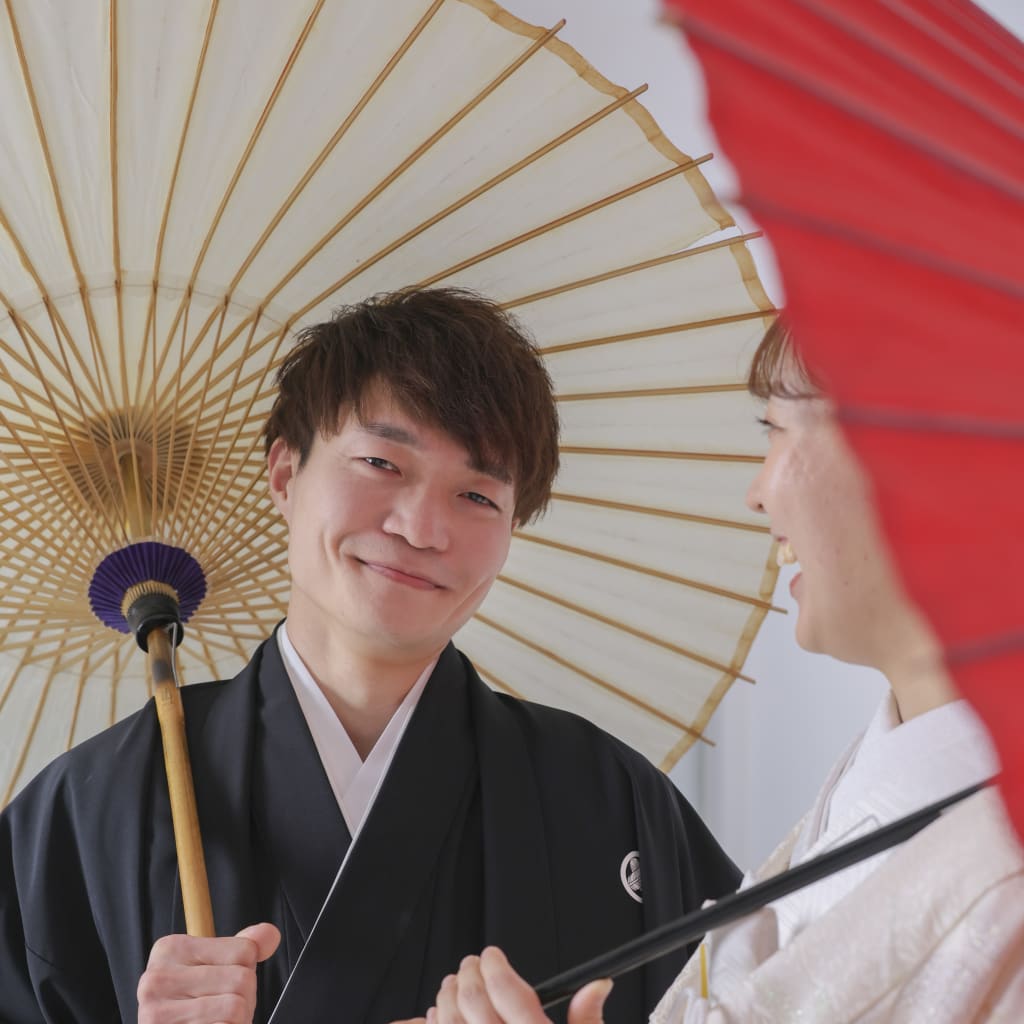 紅白の和傘で。