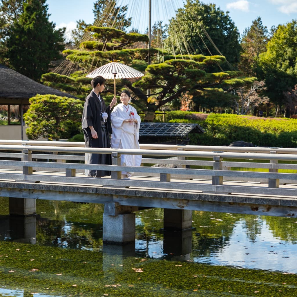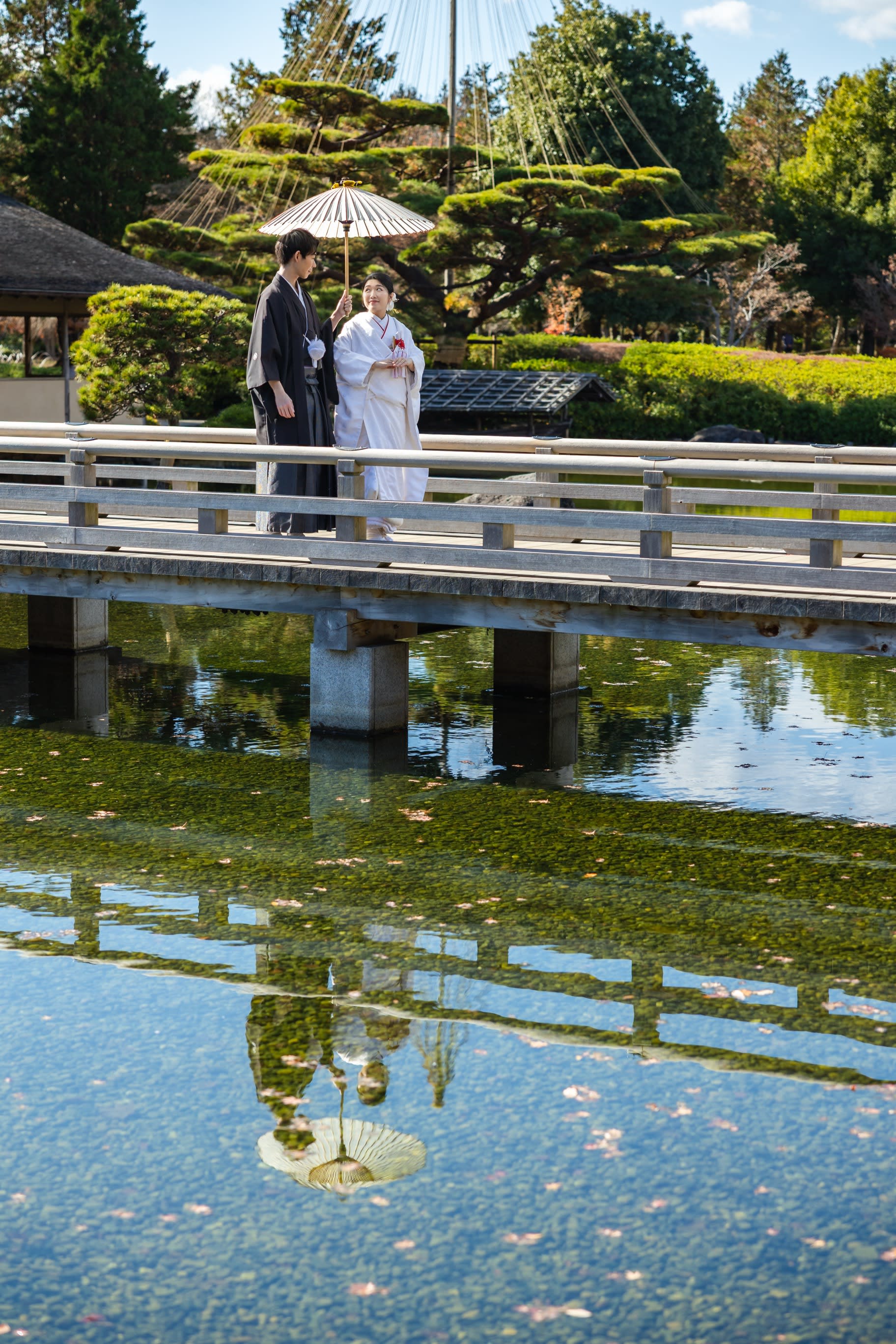 日本庭園を一望できる橋の上で!お天気にも恵まれ水面に写る景色も素敵ですね!