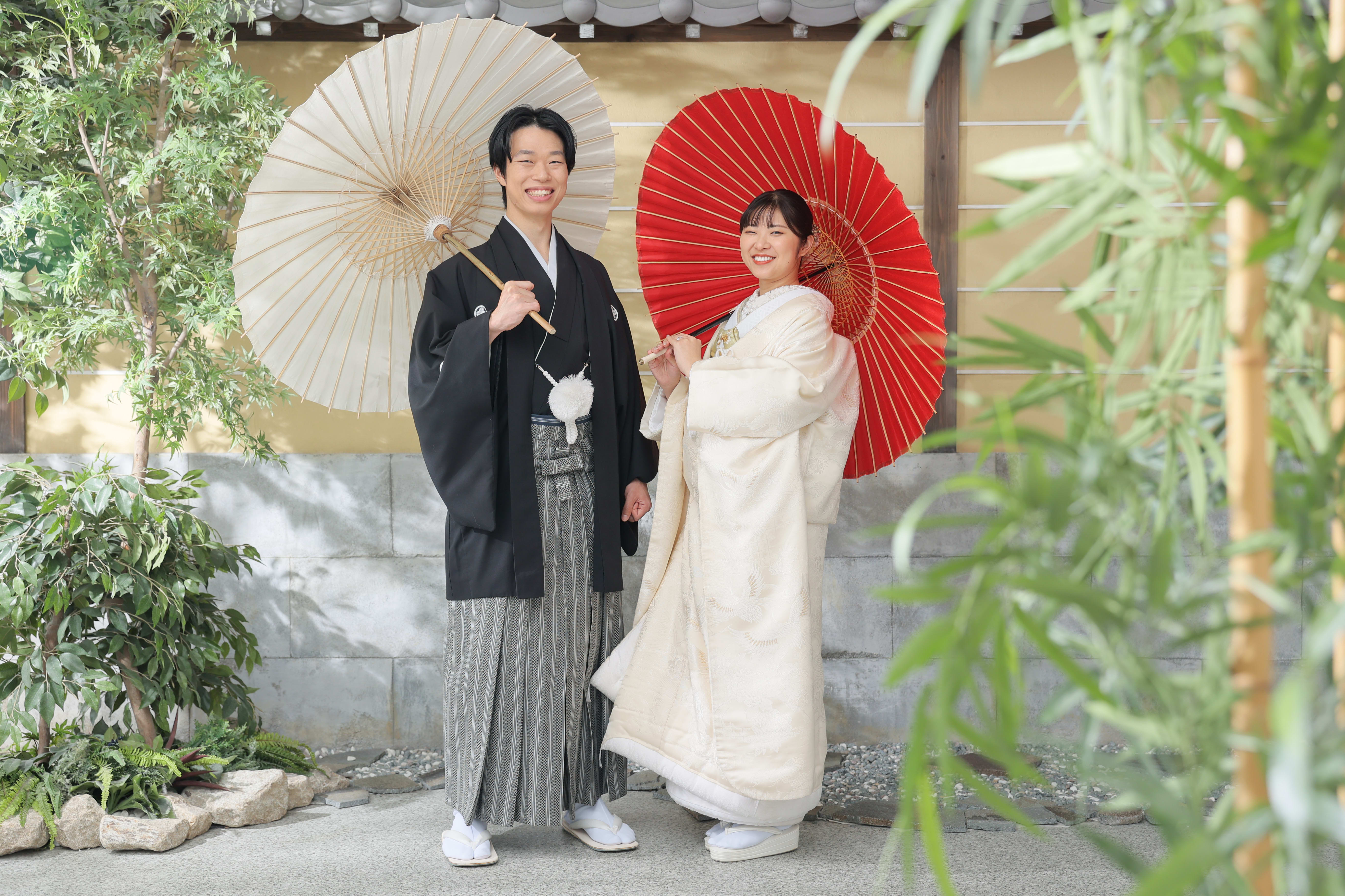 1着目は屋内庭園スタジオから撮影スタート! 緑の中で白無垢と黒紋付きが映えていて爽やかな一枚!