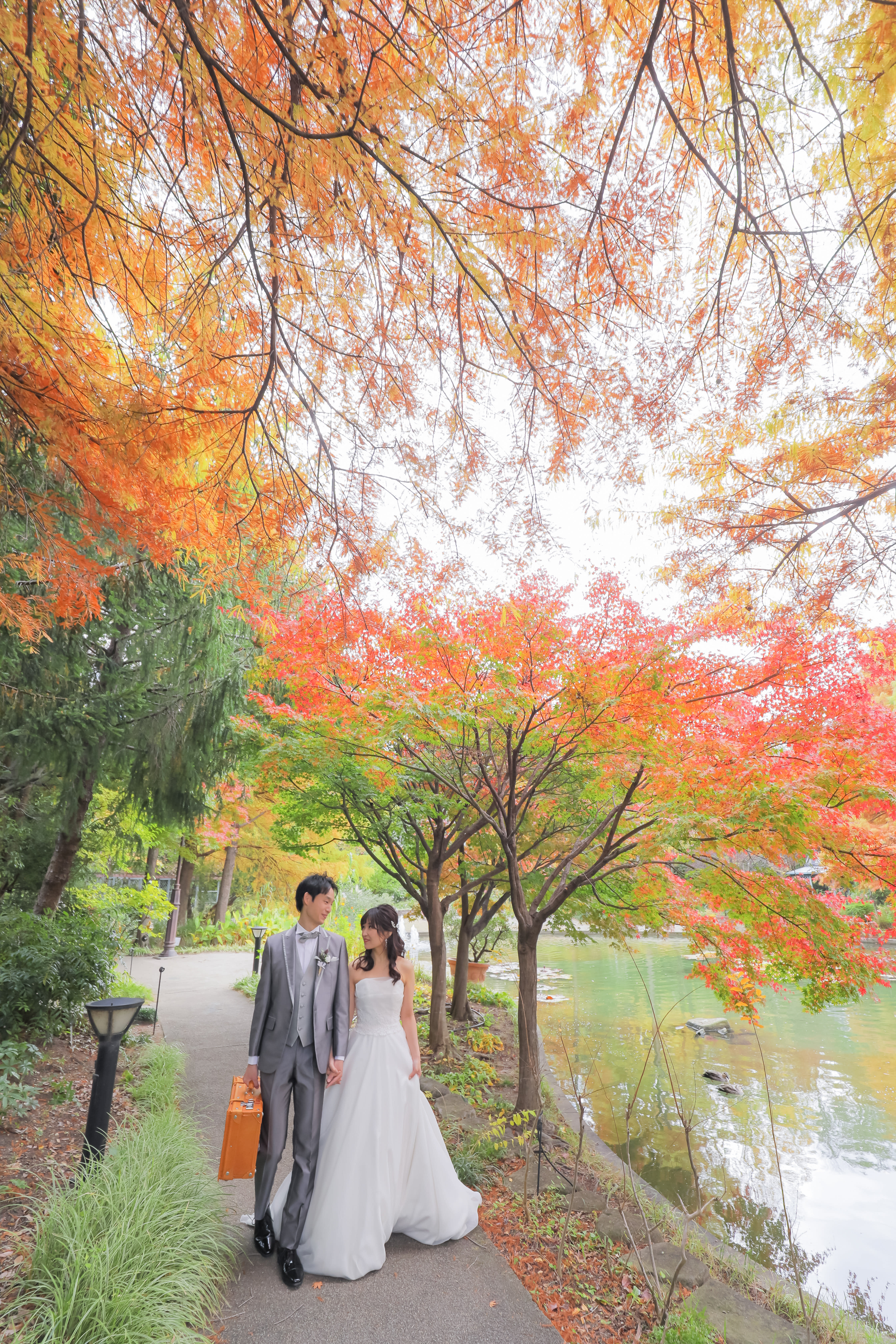 歩くとおふたりの自然な表情が出ます!紅葉と池が海外風に彩り豊かにしてくれました。
