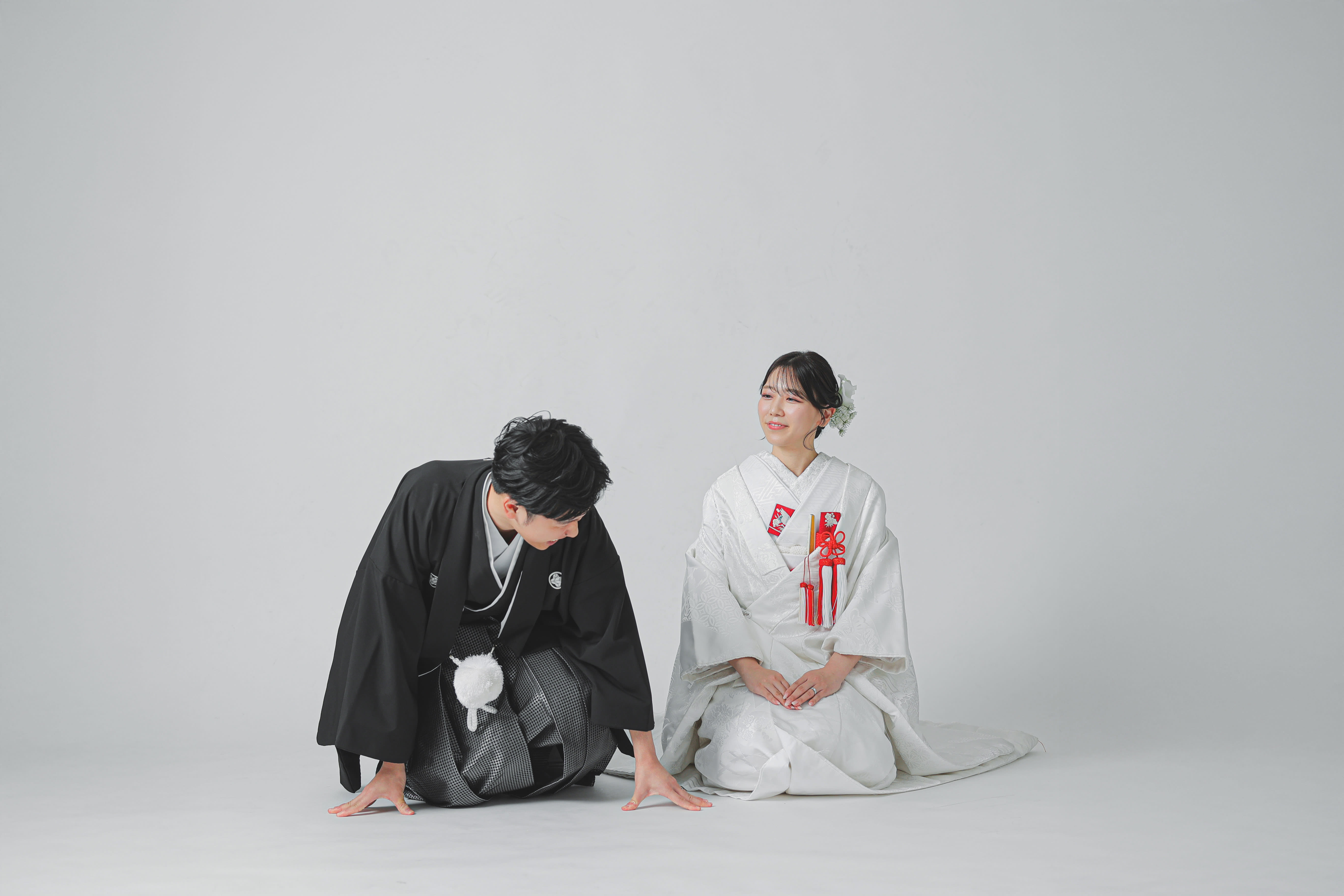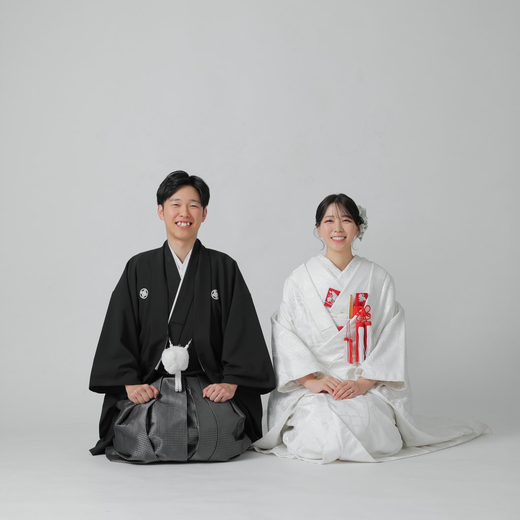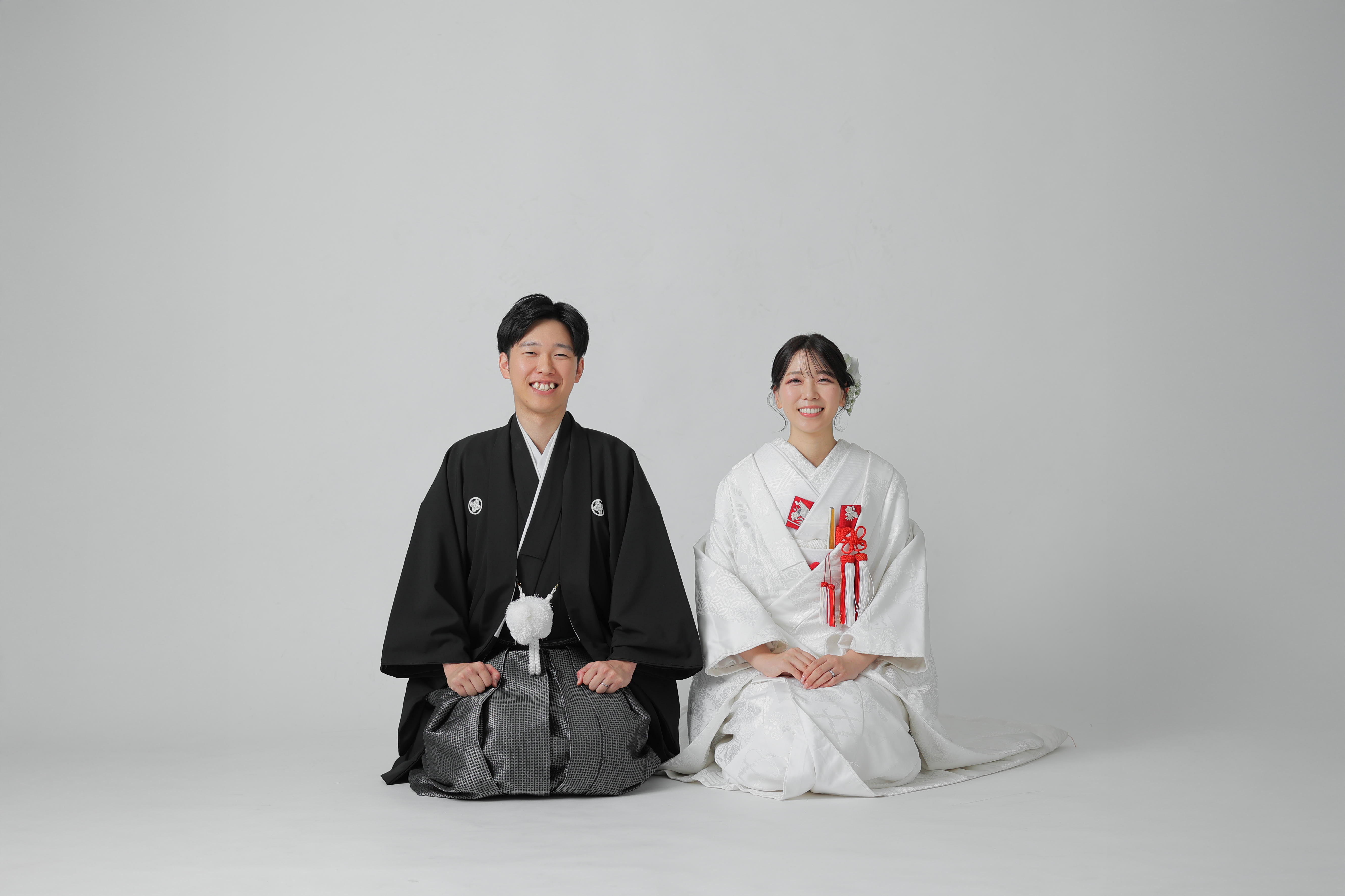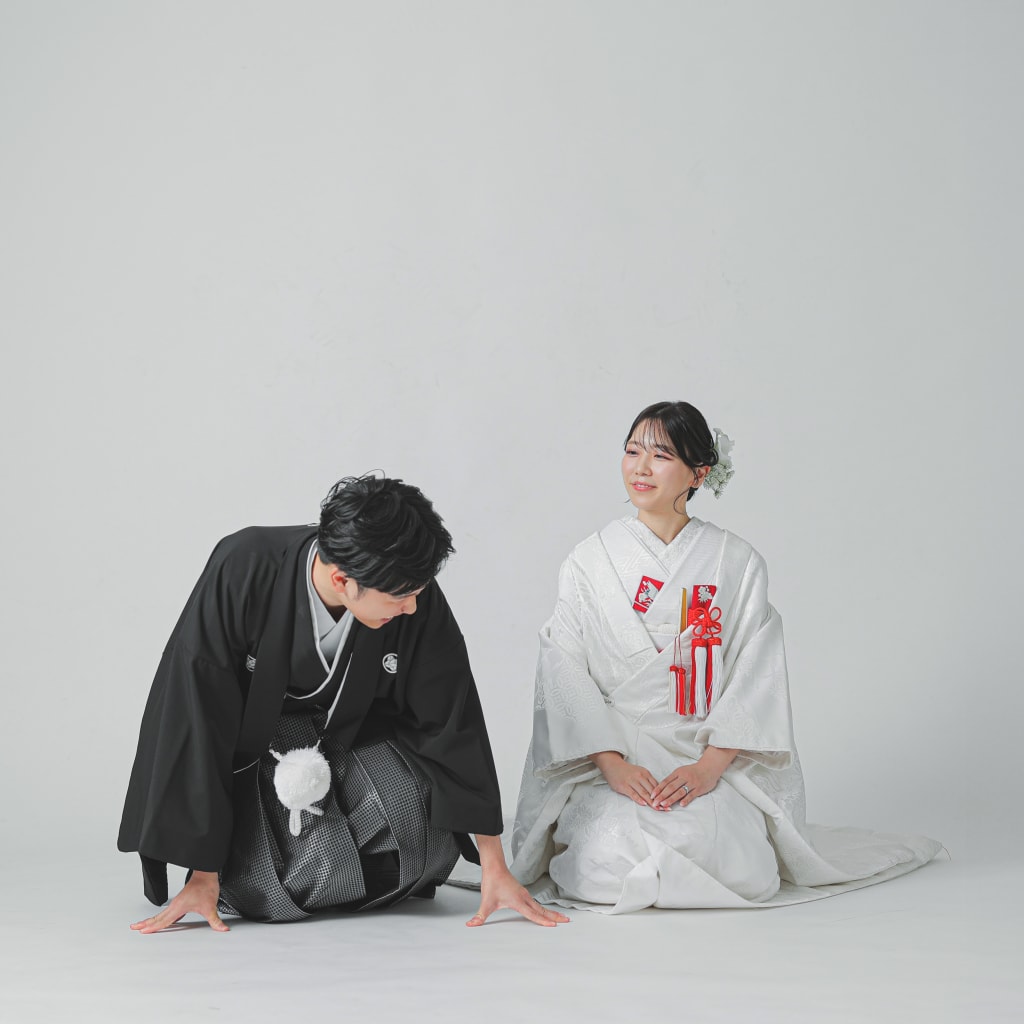 シンプルな白い背景の中で正座姿。スタイリッシュですよね。