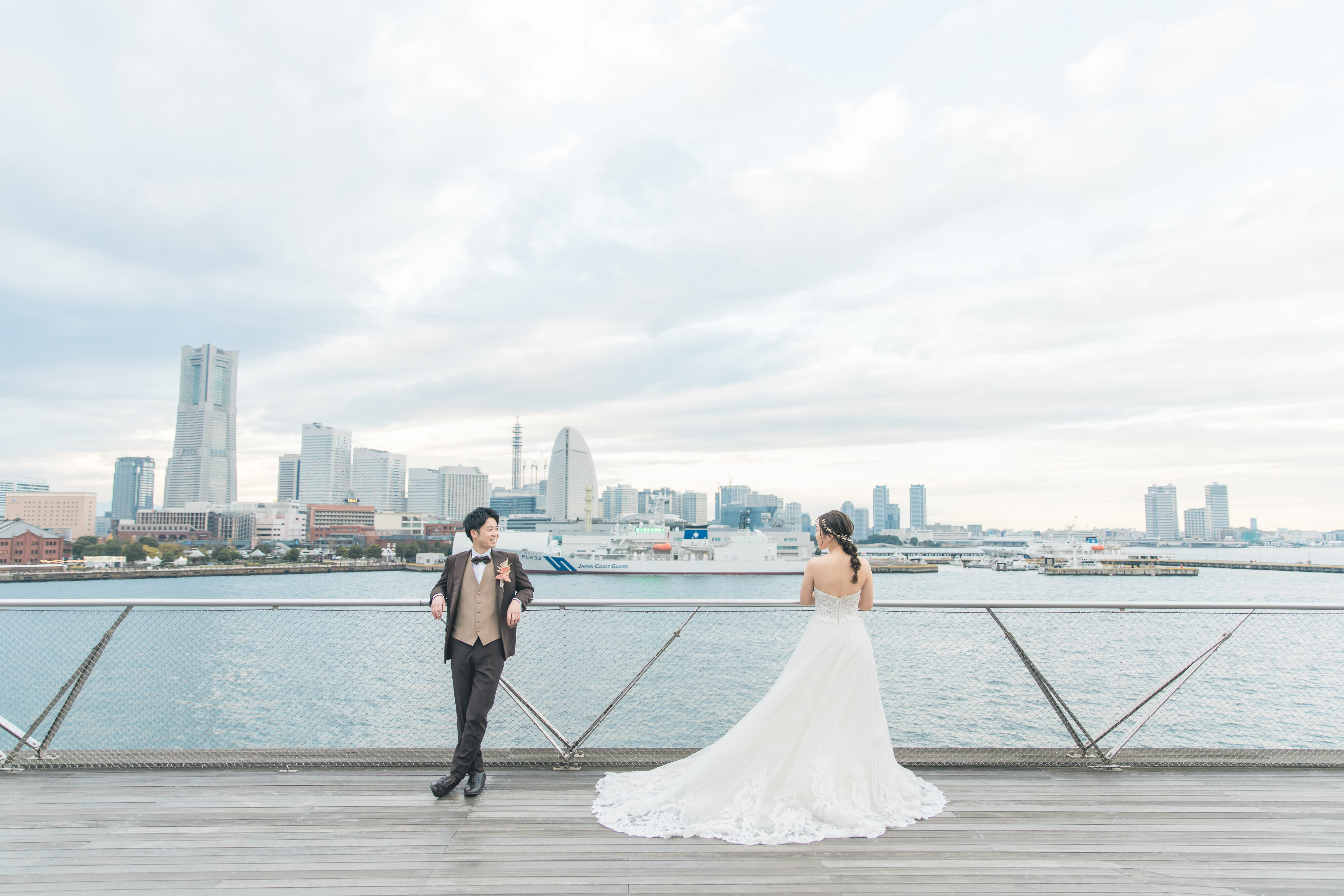 【横浜で記念日】汽笛が二人のスタートを祝う横浜のロケーションで美しい一枚を