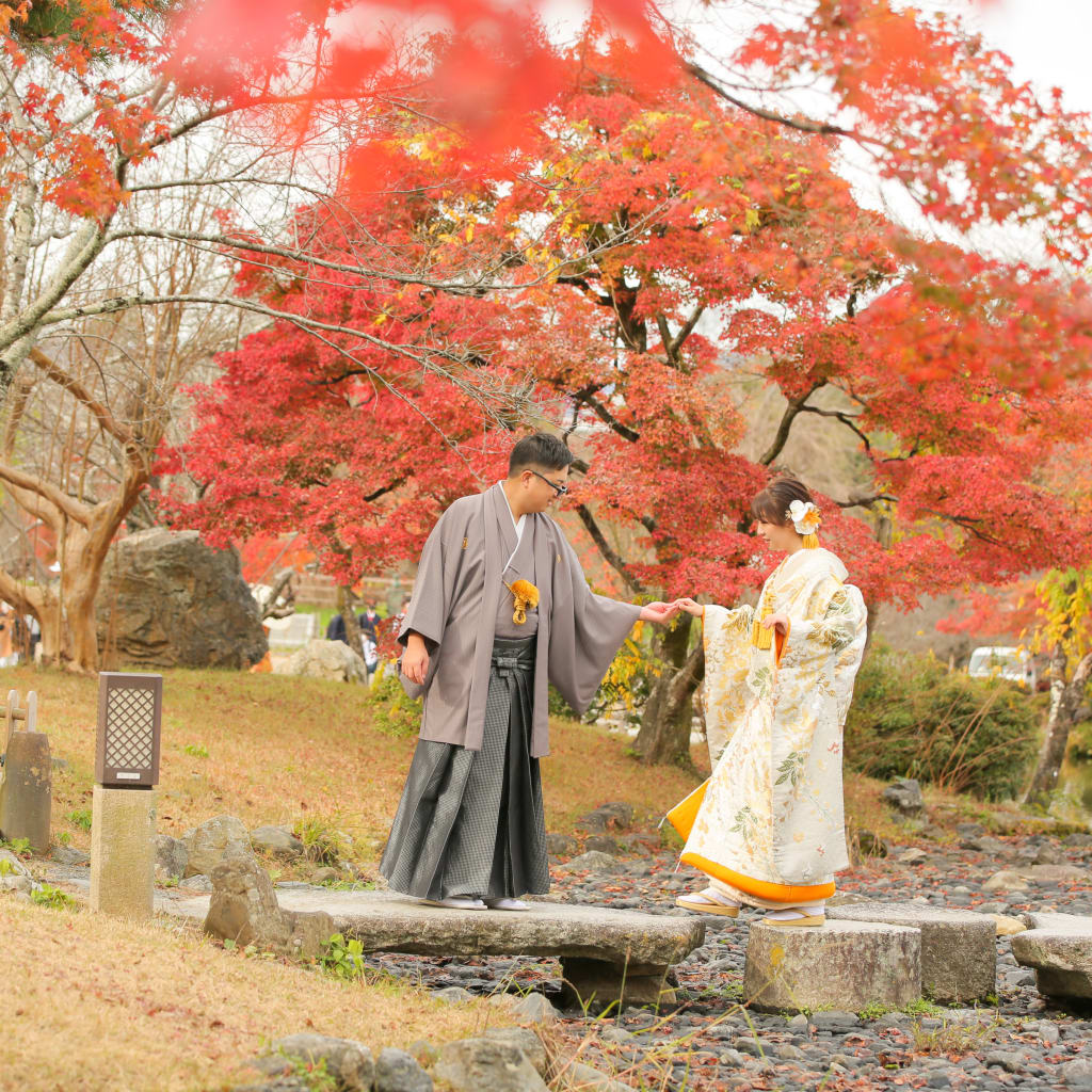 - 01 - 紅葉の中から- 紅葉溢れる中から見つめ合うお二人。お二人が際立つ一枚ですね。